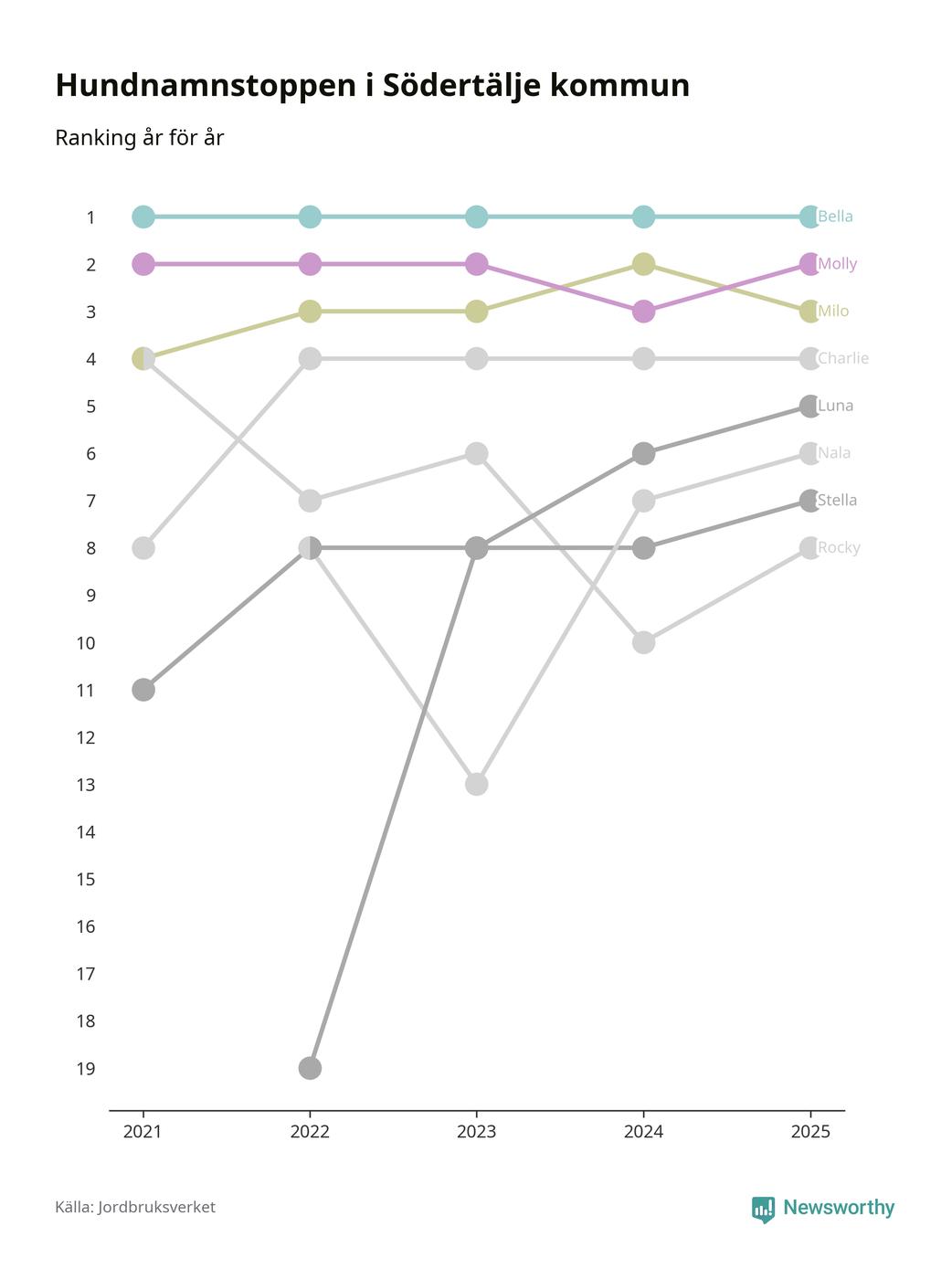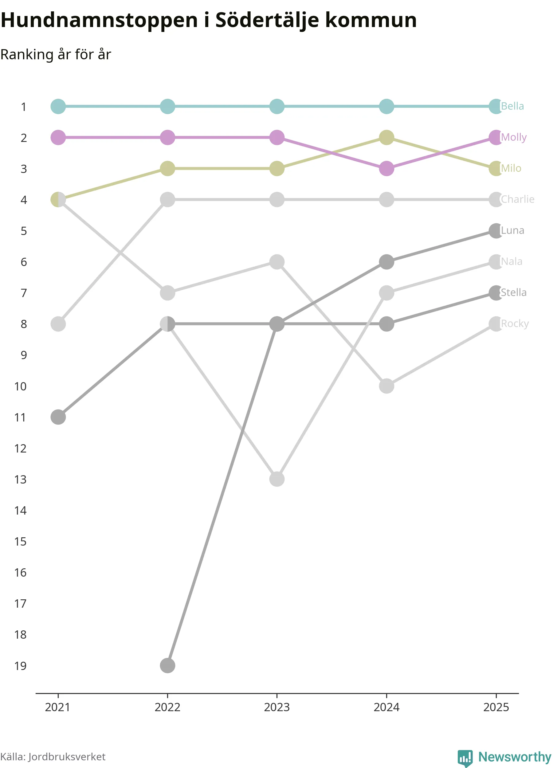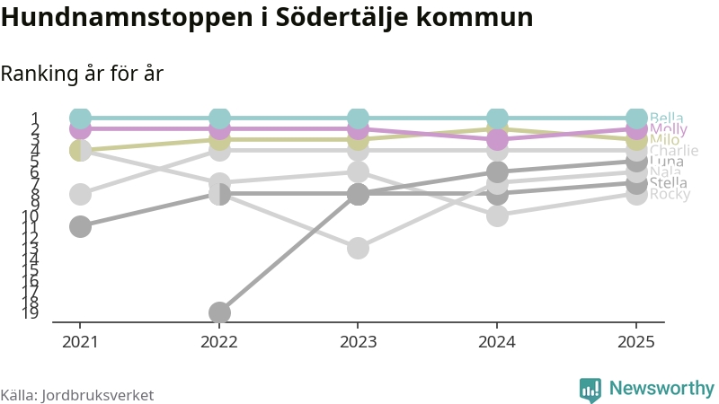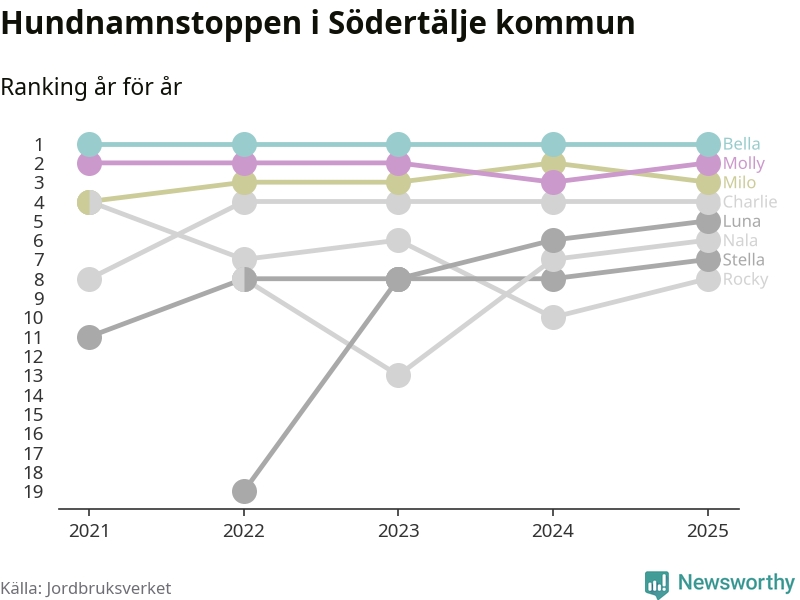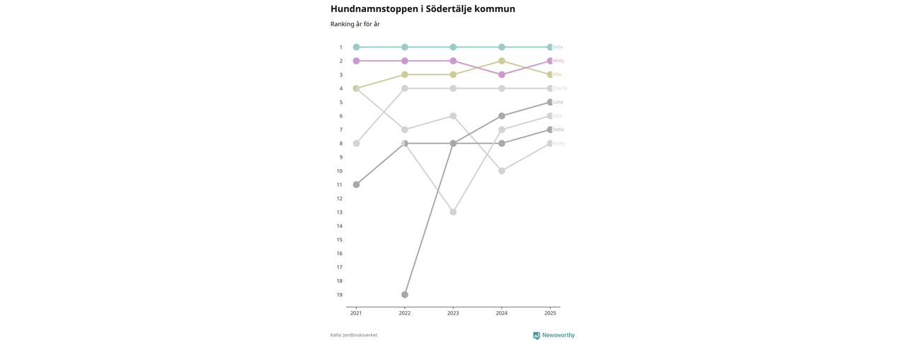 Molly är fortsatt ohotad etta bland hundnamnen i Sverige, följt av Bella och Charlie. Så har det sett ut flera år i rad, men bland Södertäljehundarna är Bella populärast.