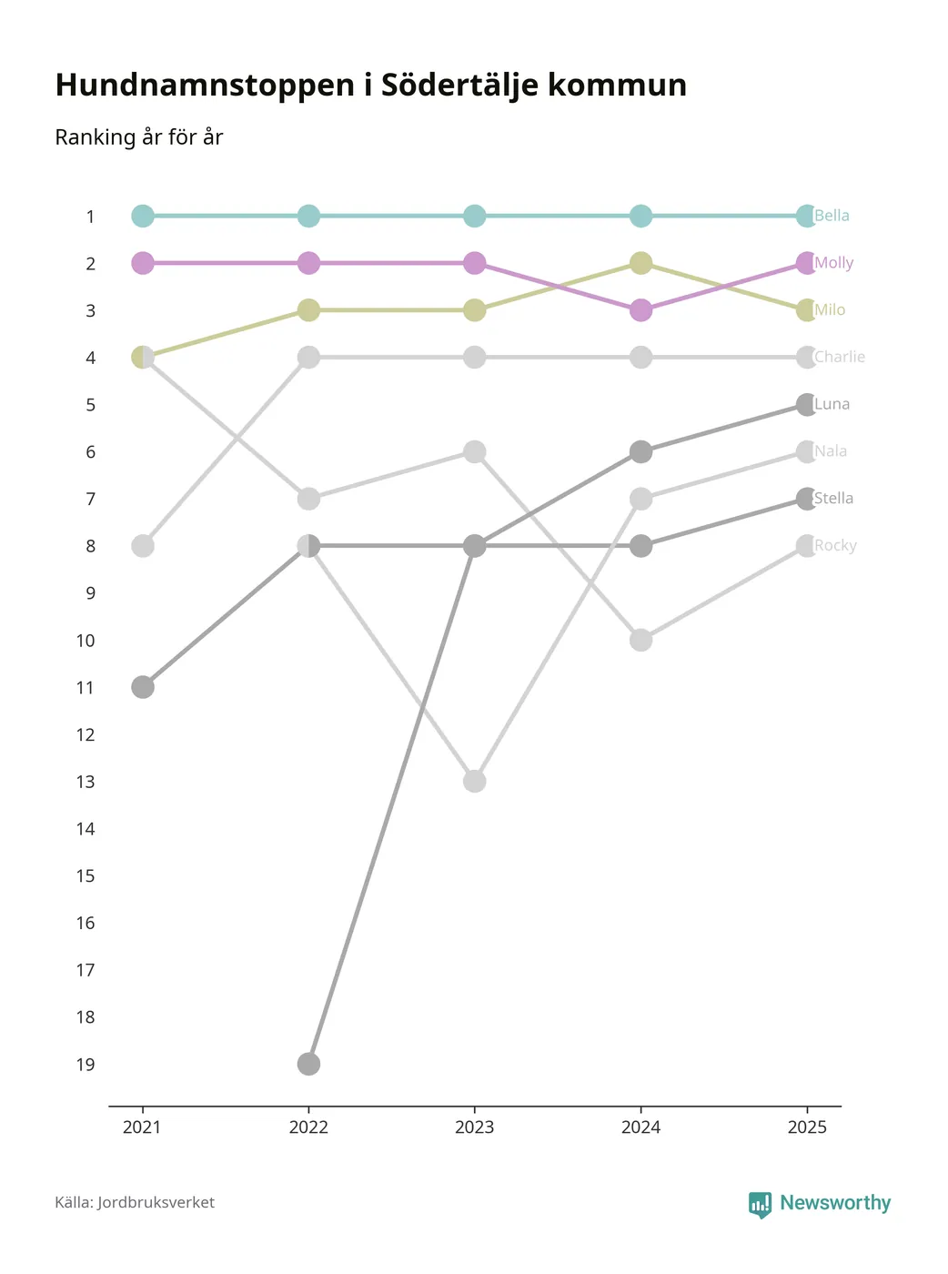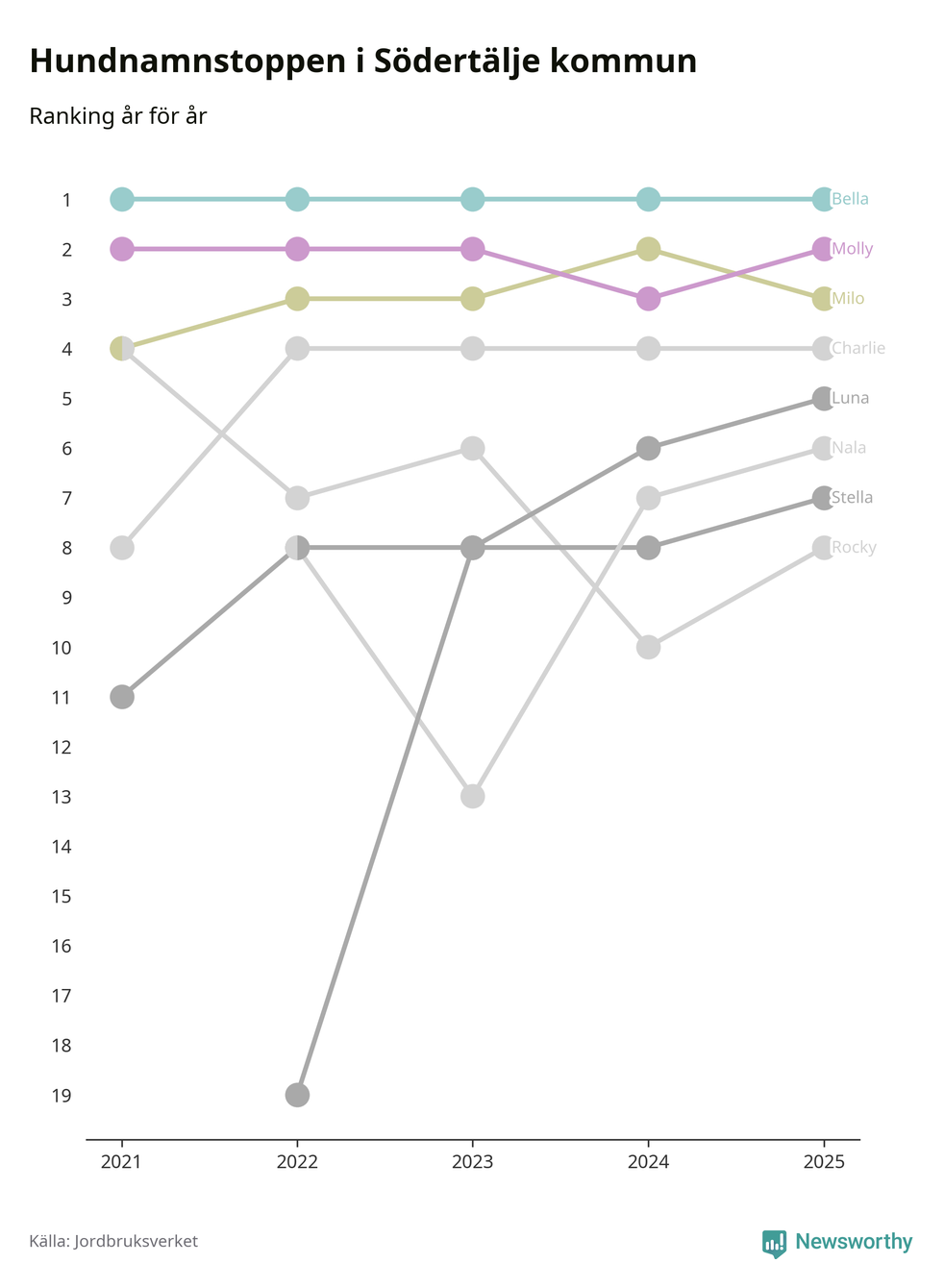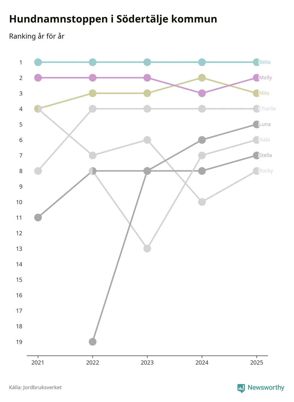 I hela landet är Molly det ohotat populäraste tilltalsnamnet för hundar sedan flera år, följt av Bella och Charlie. Något av de tre namnen toppar listan i 243 av 290 kommuner, och de har varit de vanligaste namnen sedan åtminstone 2018. Men det fjärde populäraste namnet, Doris, knappade in på ledartrion och kommer snart kunna utmana Charlie om tredjeplatsen, om trenden håller i sig.
