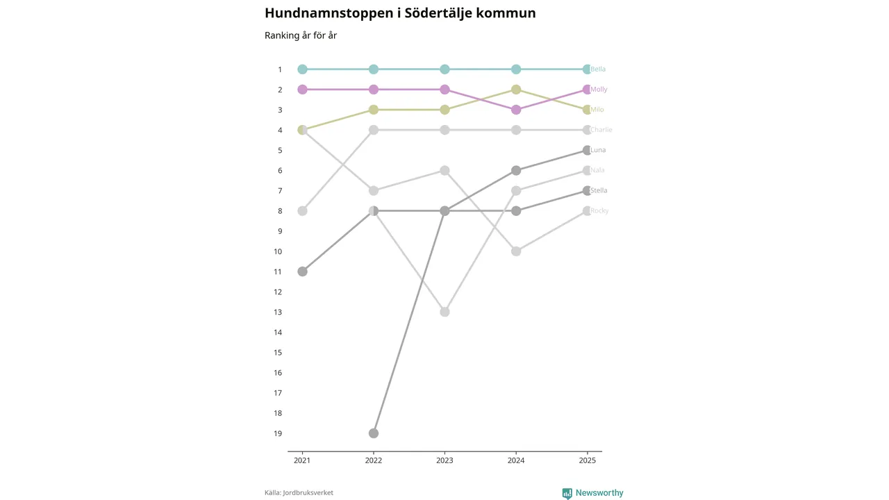 Bella är det vanligaste hundnamnet i Södertälje kommun, och bland de populärare även i riket som helhet. Men tre namn på topplistan utmärker sig som ovanligt vanliga: Chanel, Nikita och Lucky. Det visar färsk statistik från Jordbruksverket.