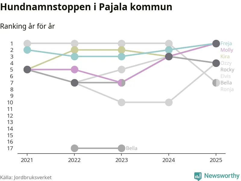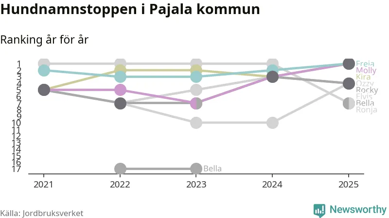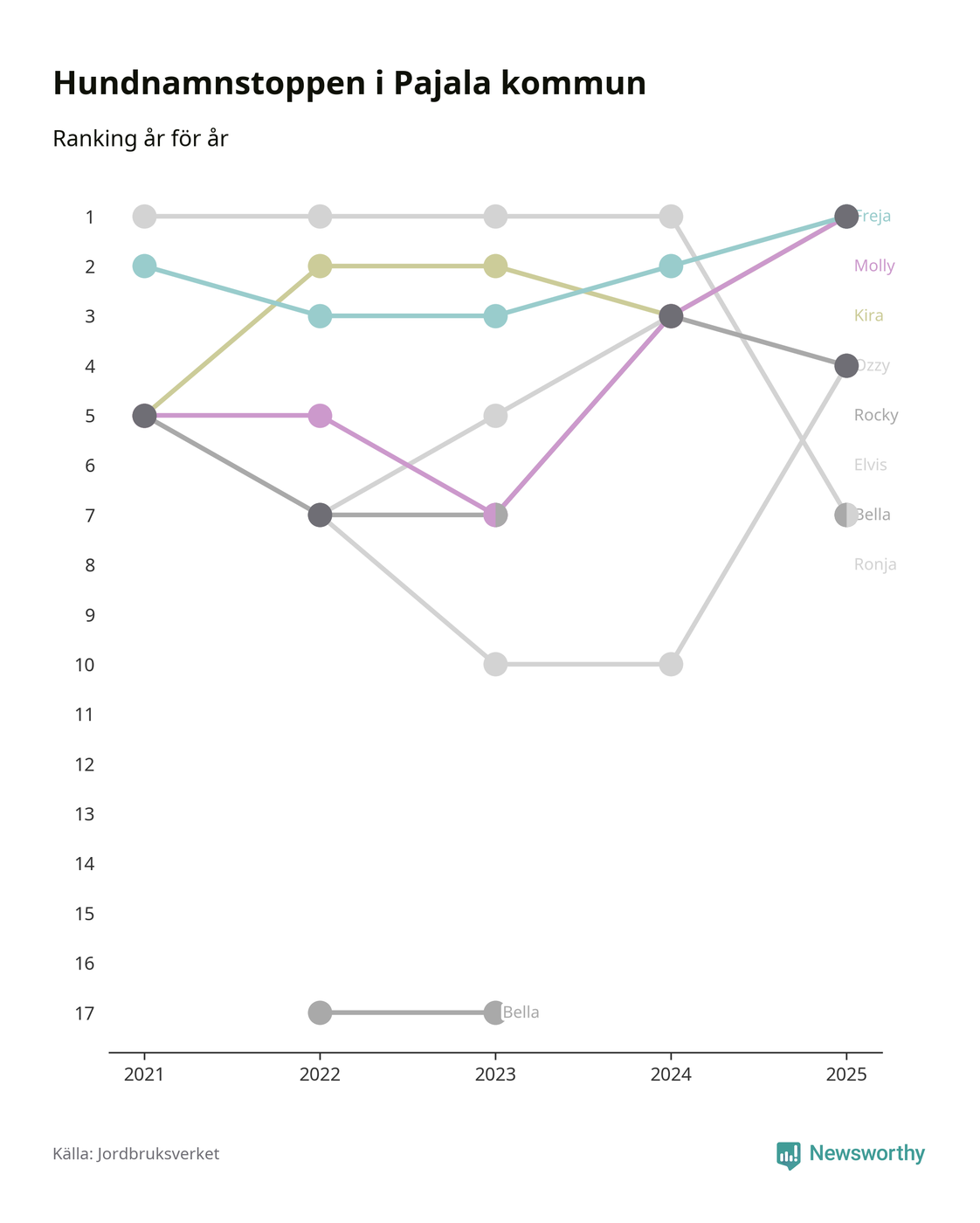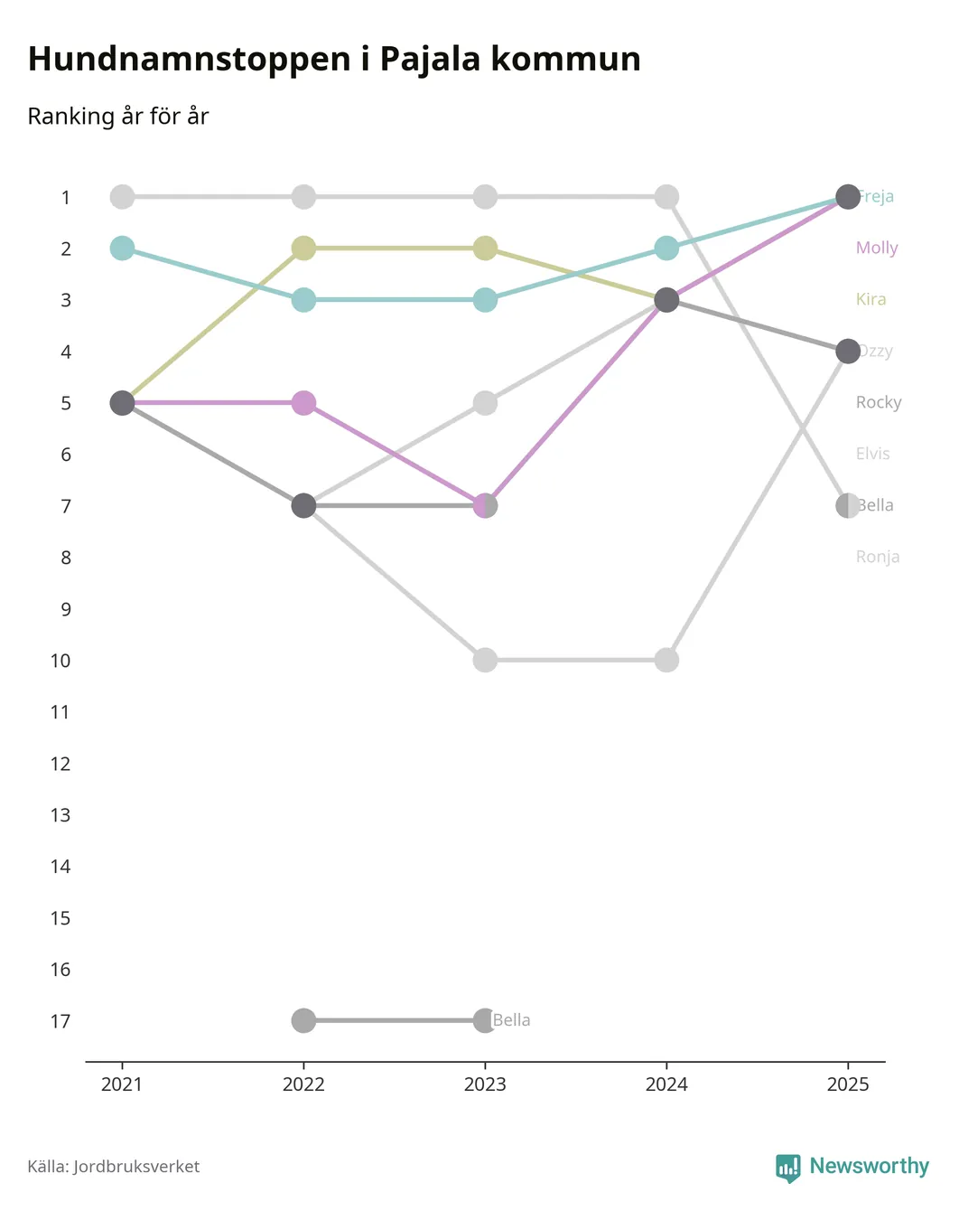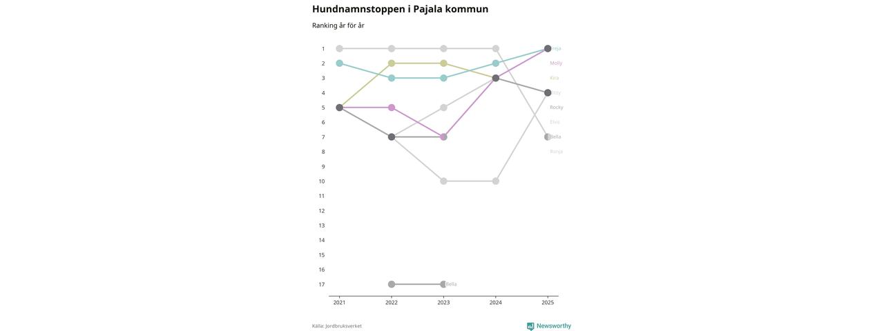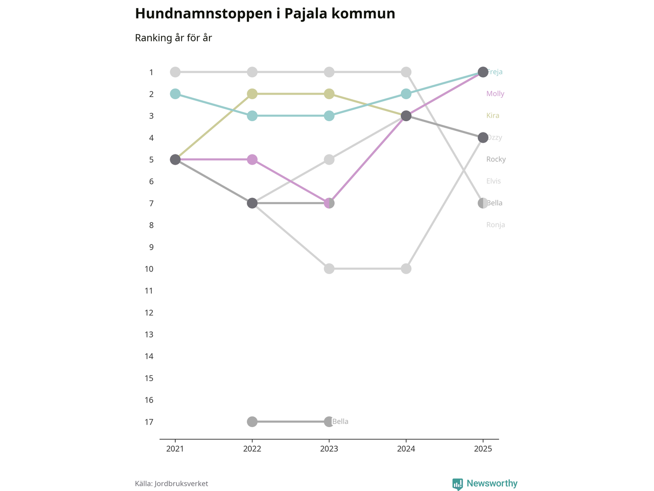 Freja, Molly och Kira är nya ettor på topplistan över Pajalas hundnamn, visar ny statistik från Jordbruksverkets hundregister. Molly är sedan flera år det populäraste hundnamnet i riket som helhet.