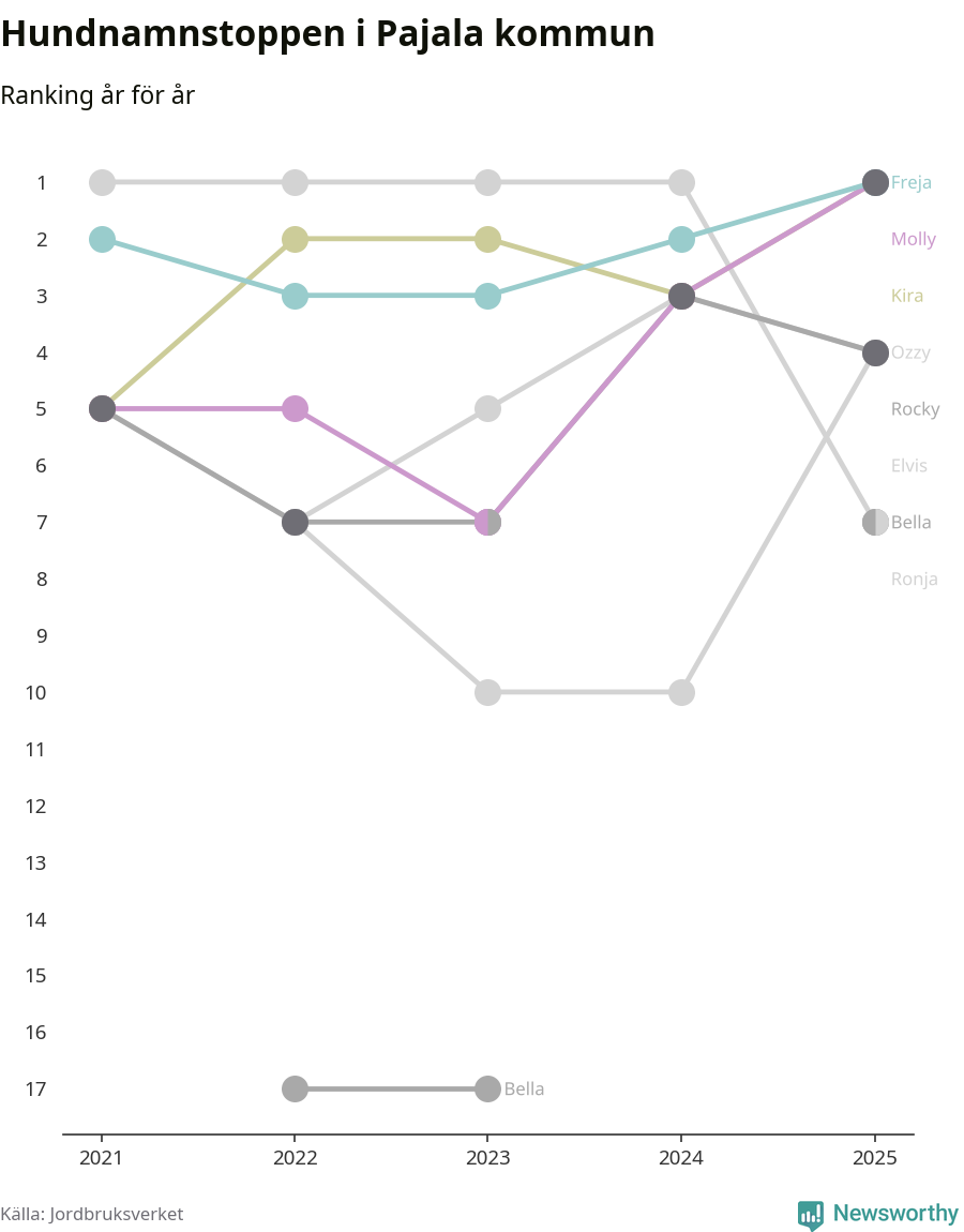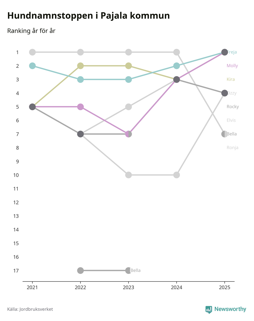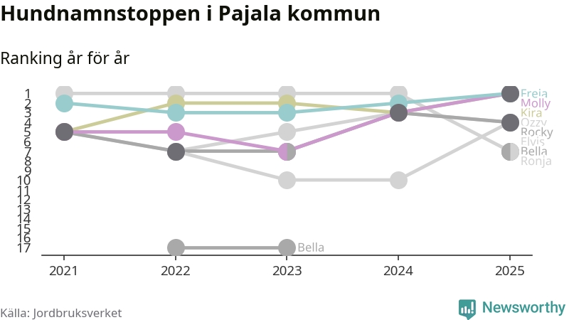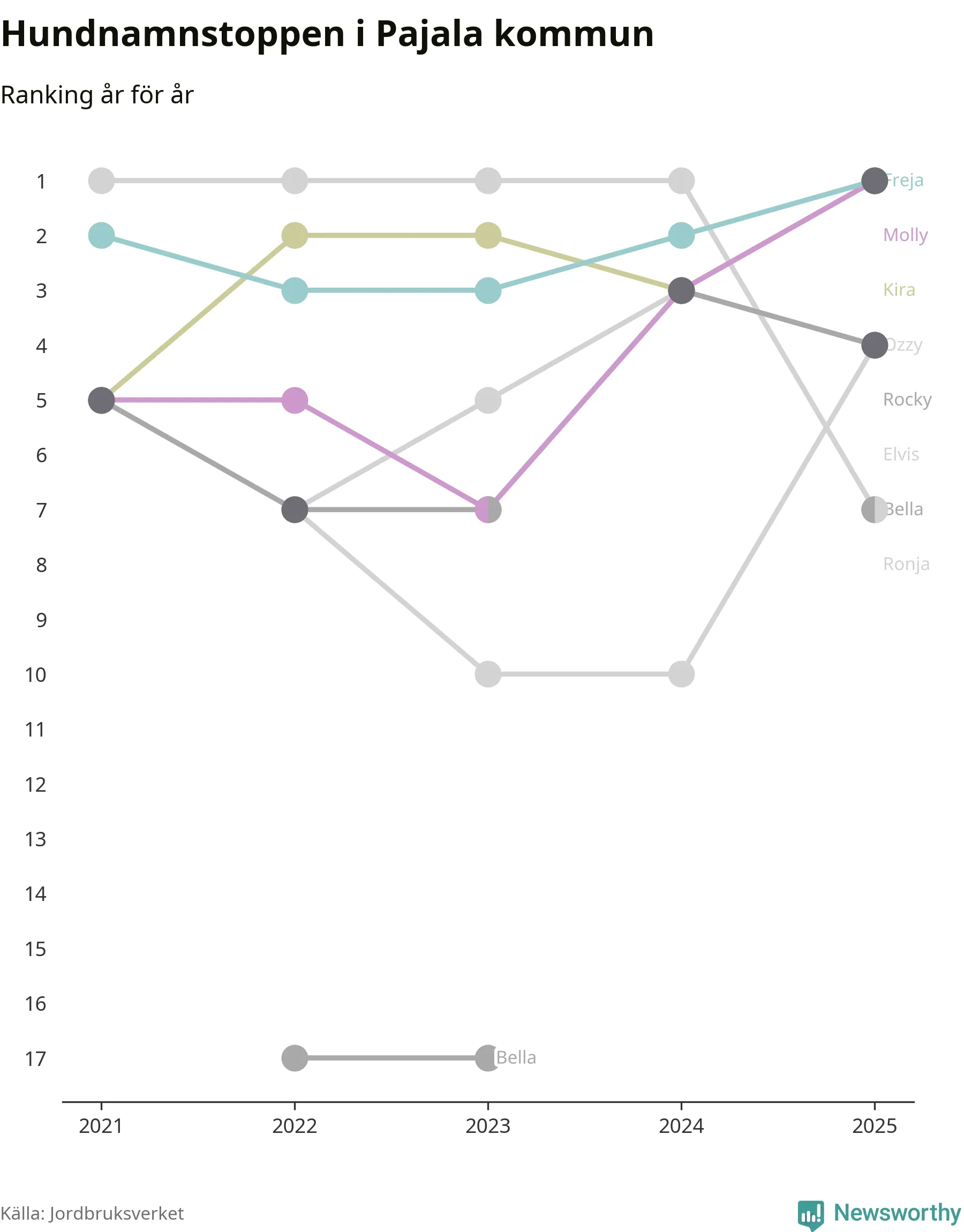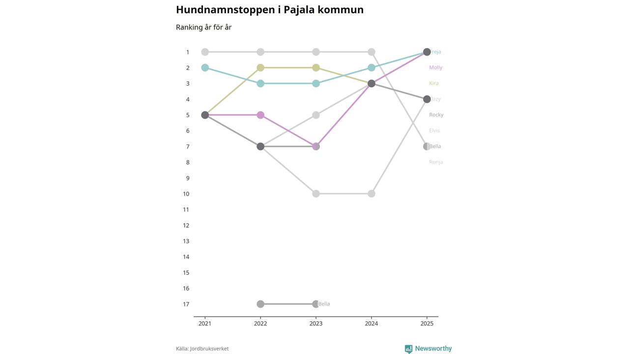 Freja, Molly och Kira är nya ettor på topplistan över Pajalas hundnamn, visar ny statistik från Jordbruksverkets hundregister. Molly är sedan flera år det populäraste hundnamnet i riket som helhet.