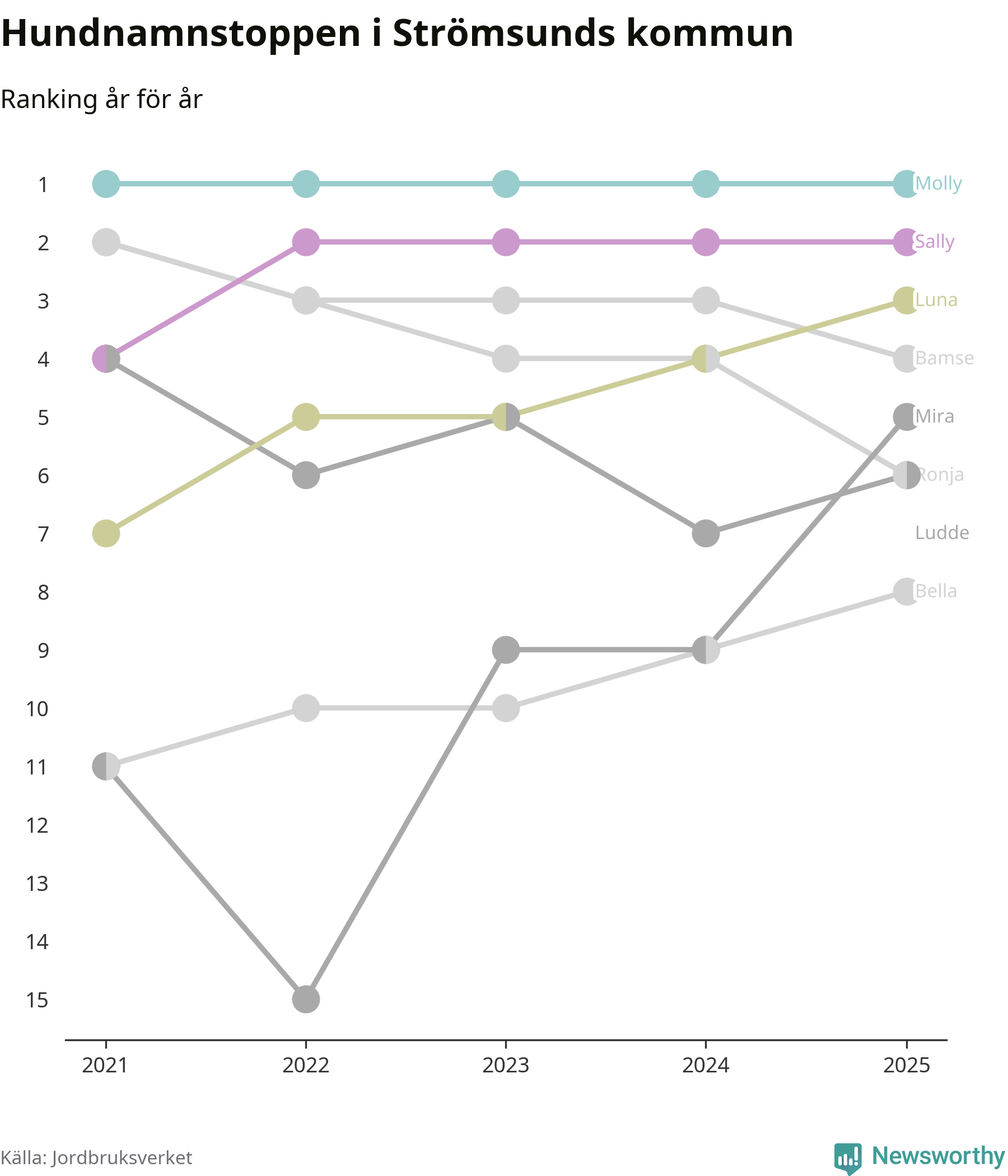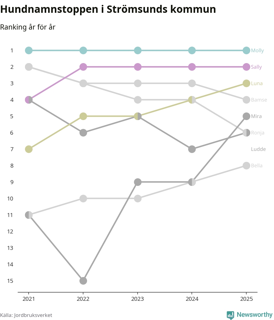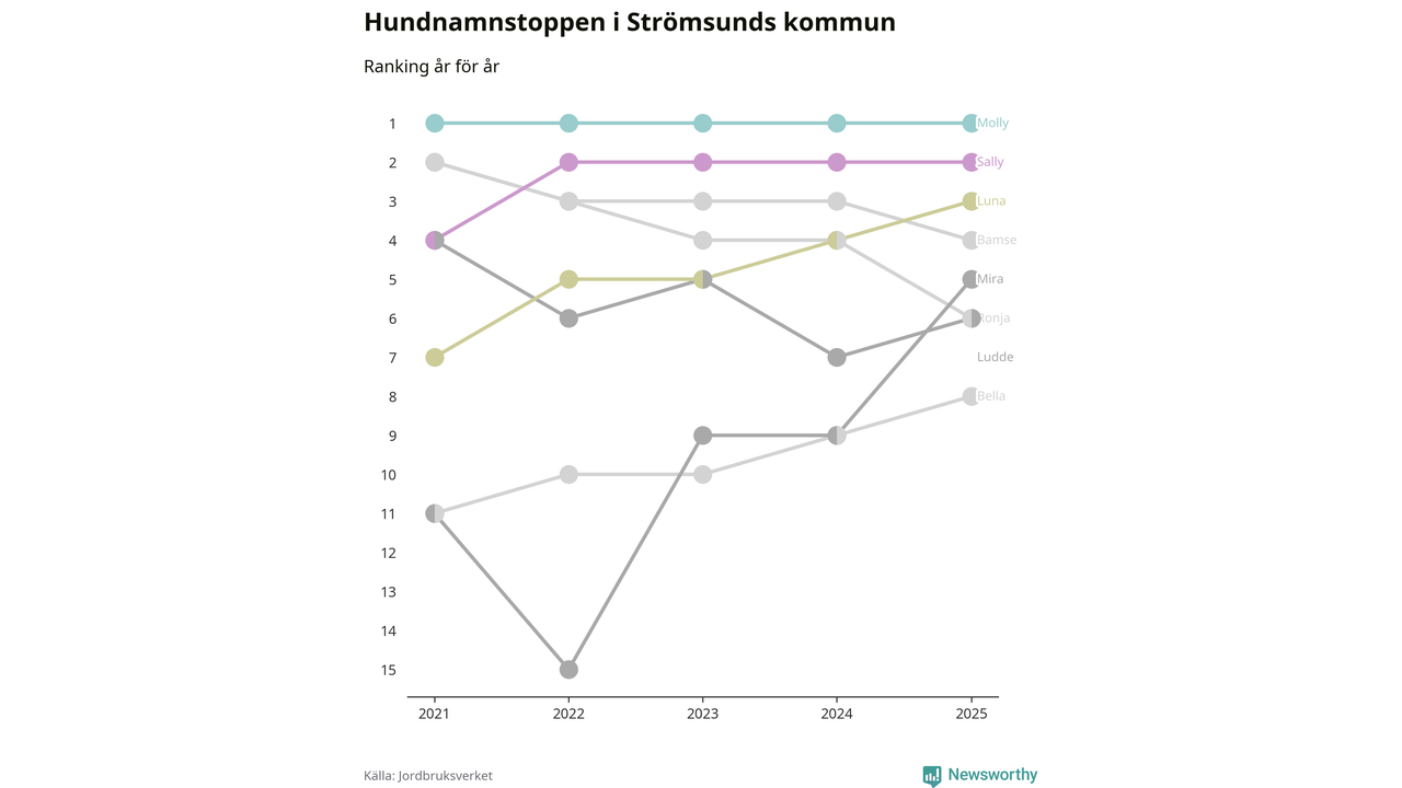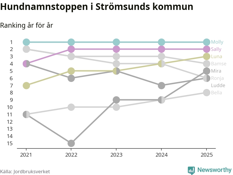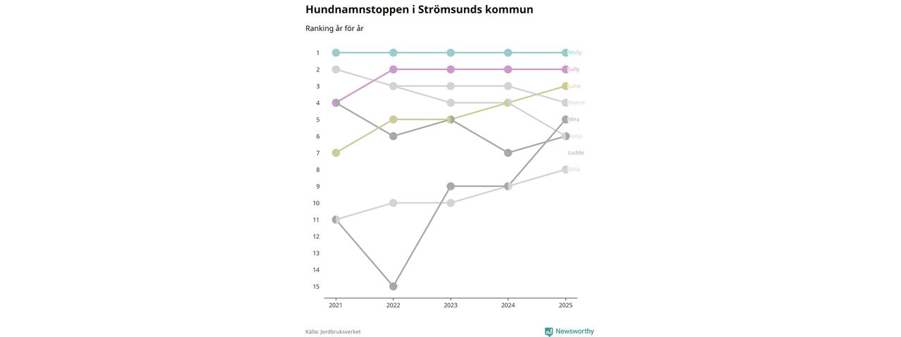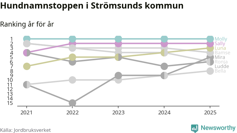 Molly är fortsatt ohotad etta bland hundnamnen i Sverige, följt av Bella och Charlie. Så har det sett ut flera år i rad, och även bland Strömsundshundarna ligger Molly i topp.