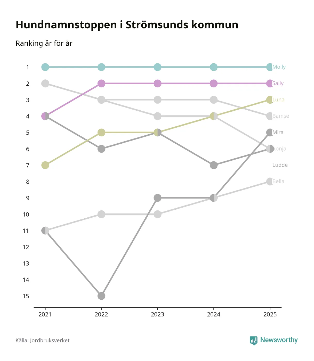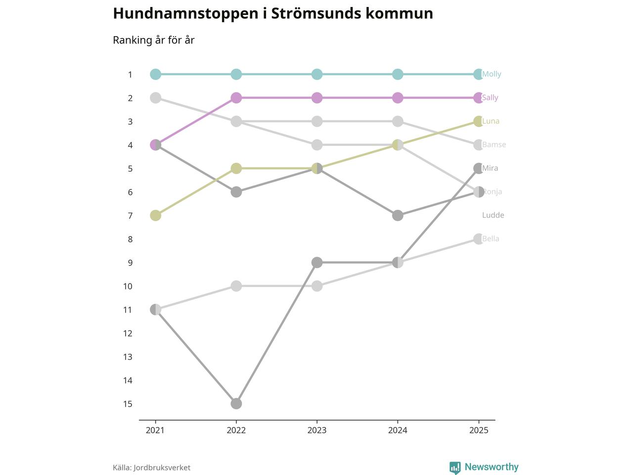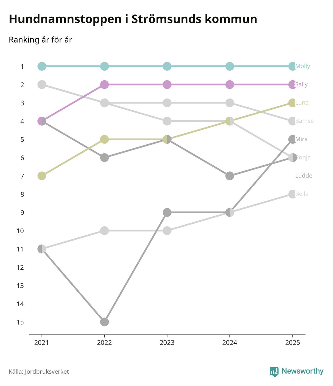 Molly är fortsatt ohotad etta bland hundnamnen i Sverige, följt av Bella och Charlie. Så har det sett ut flera år i rad, och även bland Strömsundshundarna ligger Molly i topp.