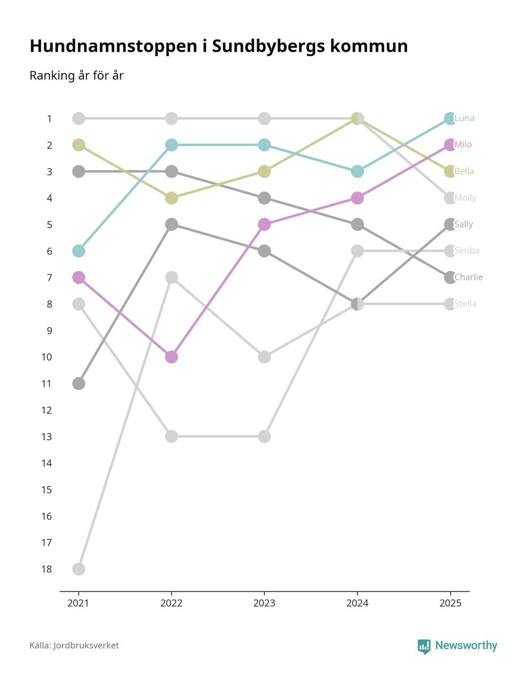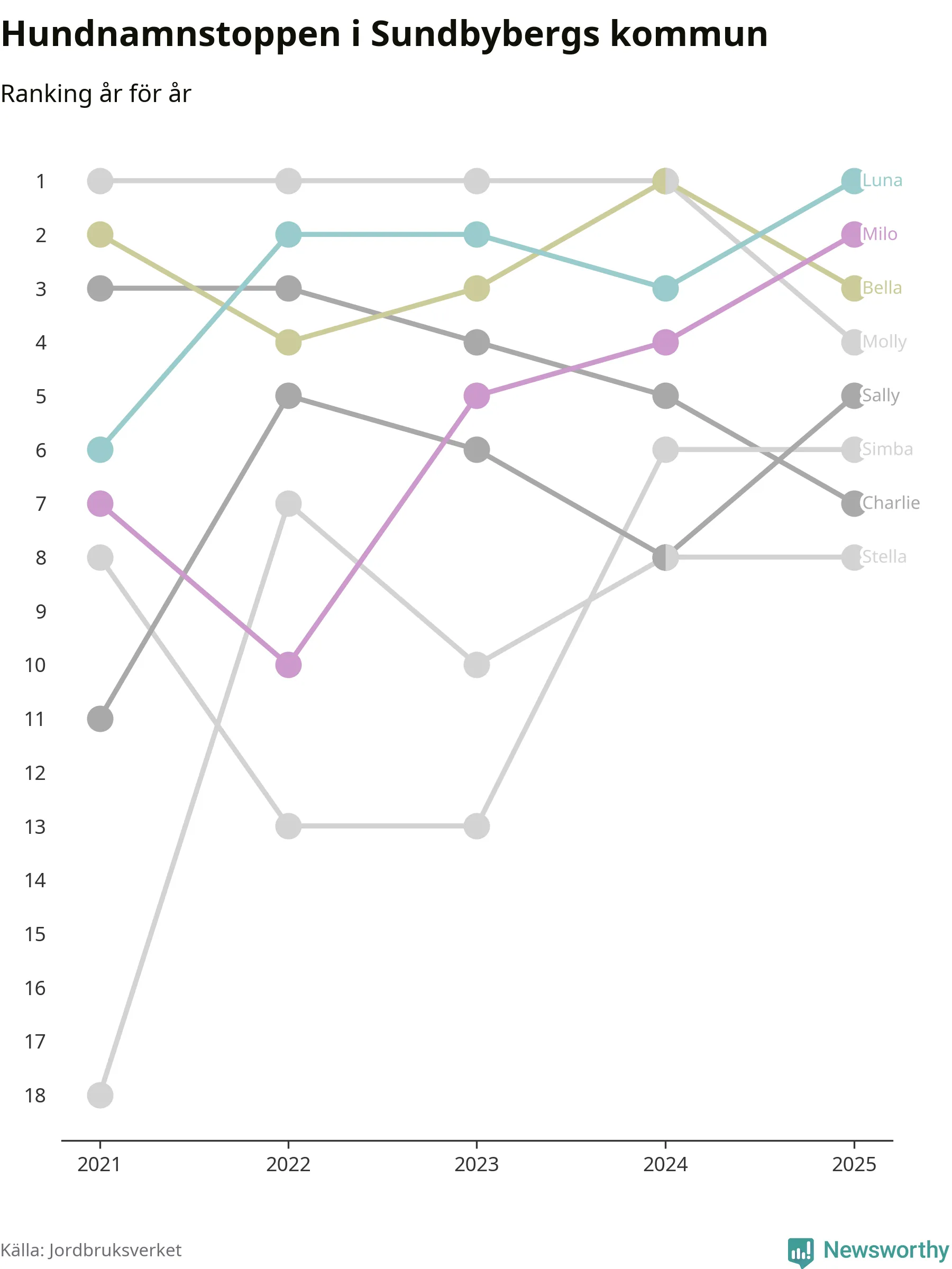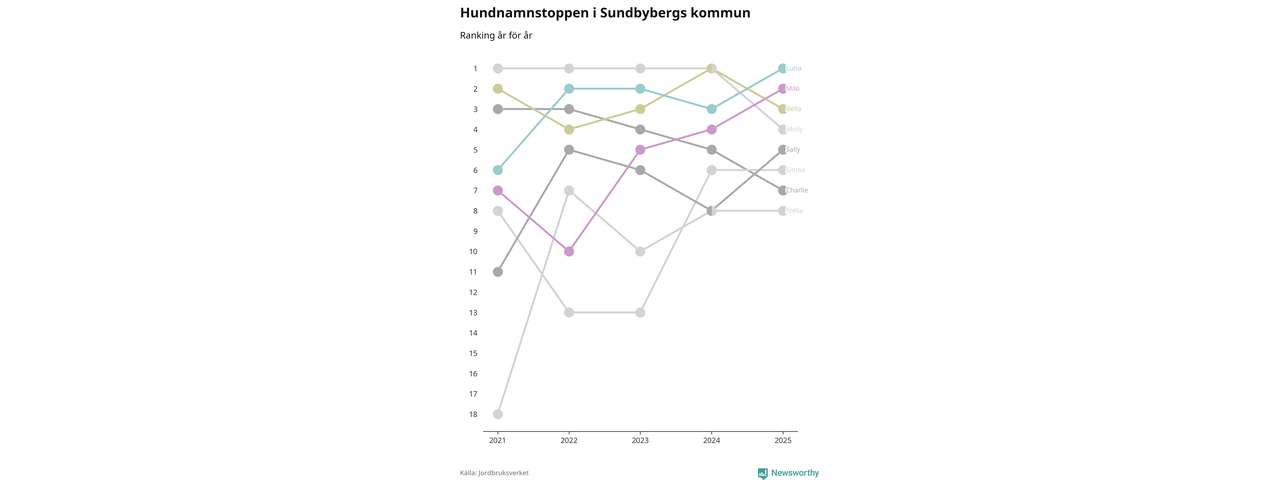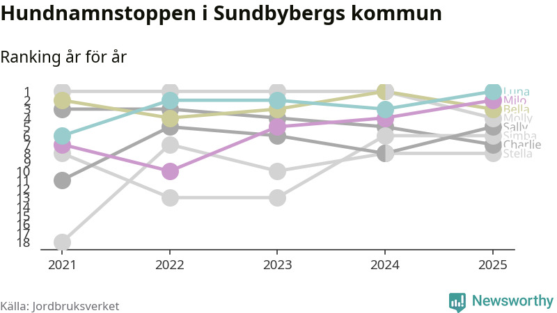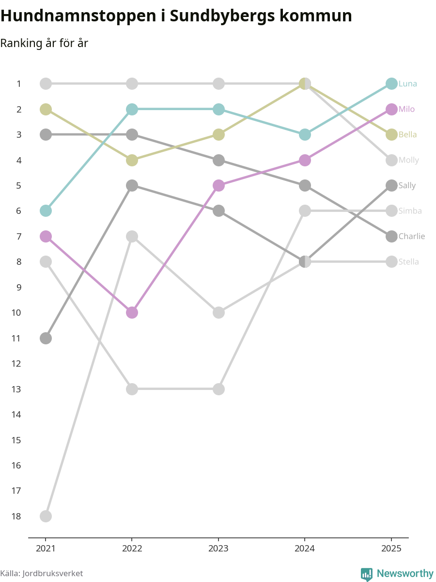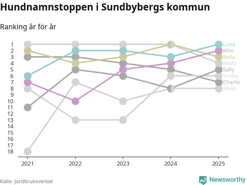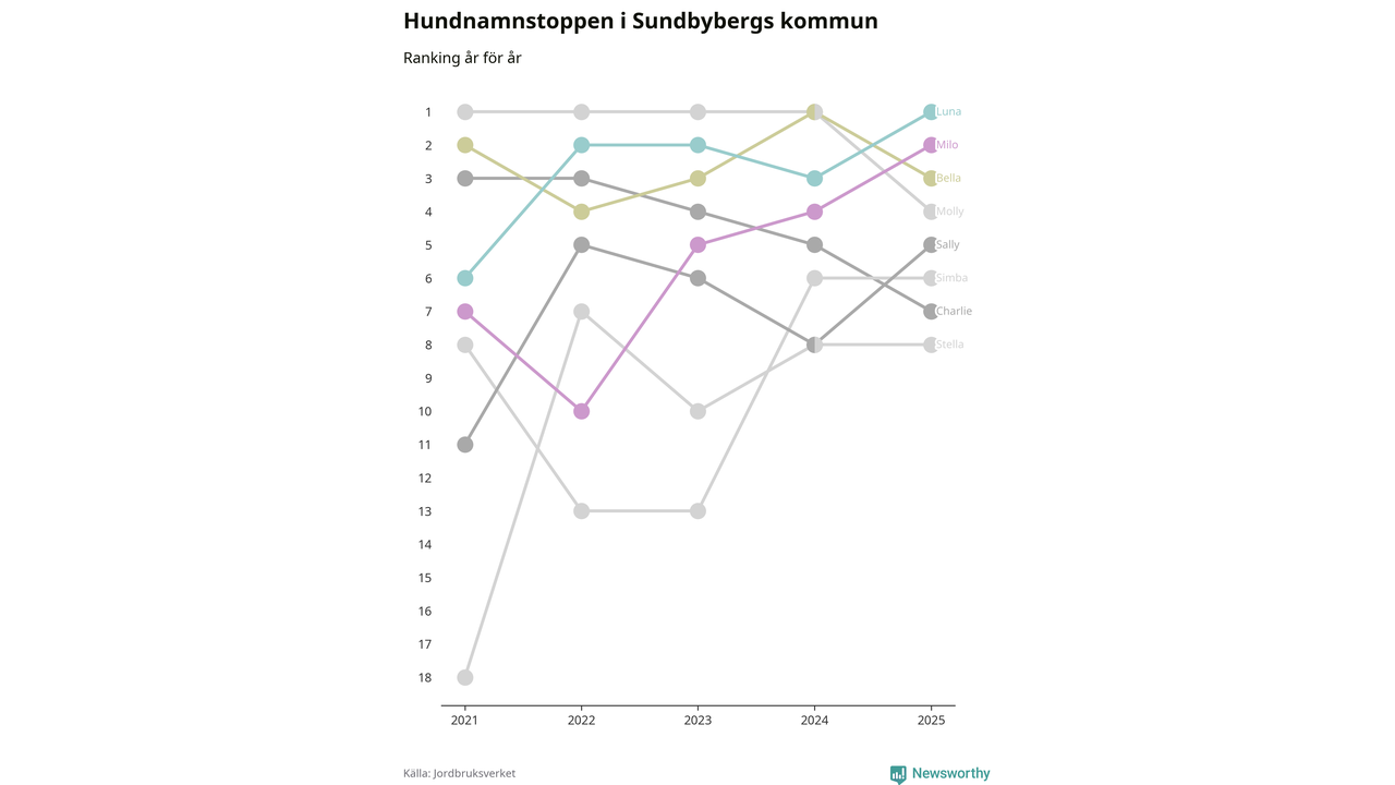 Molly är fortsatt ohotad etta bland hundnamnen i Sverige, följt av Bella och Charlie. Så har det sett ut flera år i rad, men bland Sundbybergshundarna är Luna populärast. Sundbyberg är en av elva kommuner i landet där Luna är vanligast, eller på delad förstaplats.
