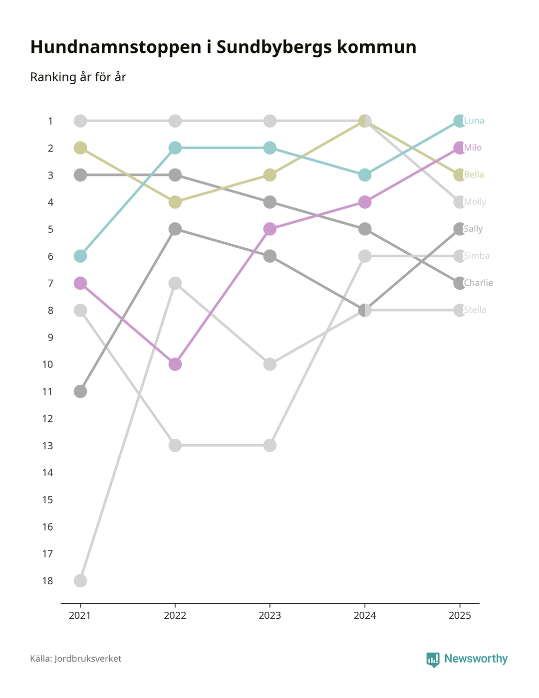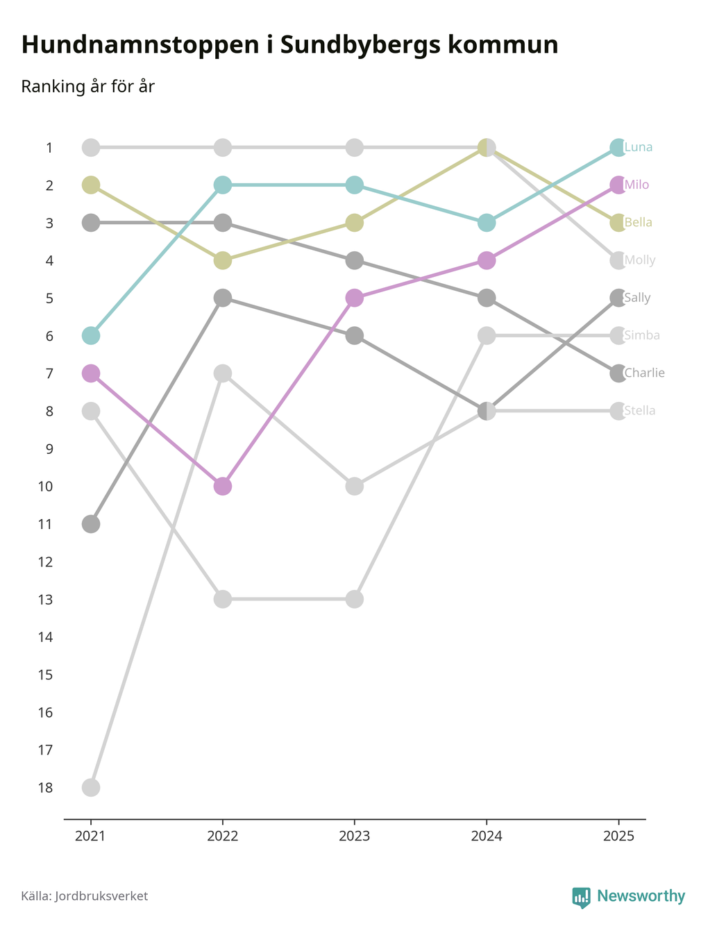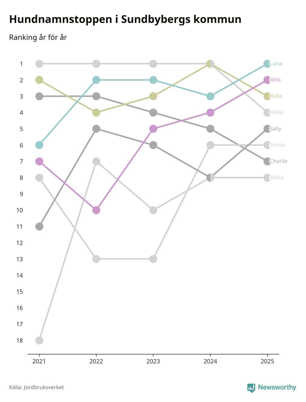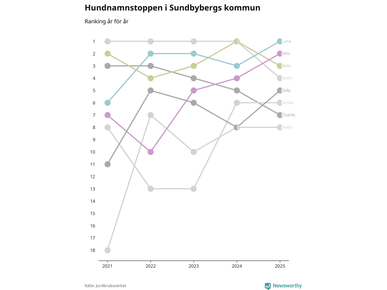 Molly är fortsatt ohotad etta bland hundnamnen i Sverige, följt av Bella och Charlie. Så har det sett ut flera år i rad, men bland Sundbybergshundarna är Luna populärast. Sundbyberg är en av elva kommuner i landet där Luna är vanligast, eller på delad förstaplats.