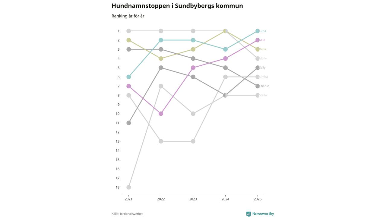 Luna är det vanligaste hundnamnet i Sundbybergs kommun, enligt färsk statistik från Jordbruksverket. Det gör Sundbyberg till en av de kommuner där något av landets allra vanligaste hundnamn, Molly, Bella och Charlie, inte toppar listan.
