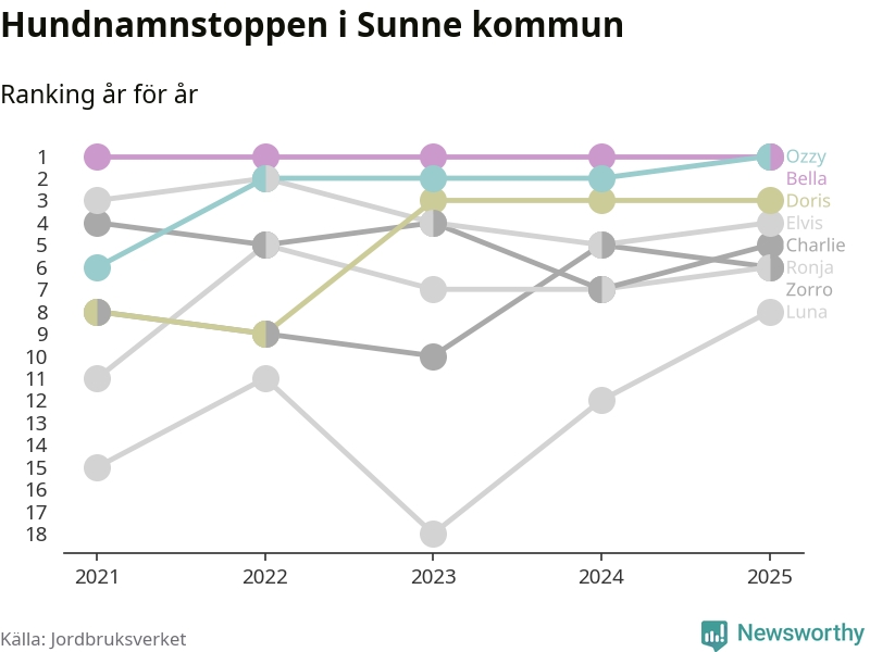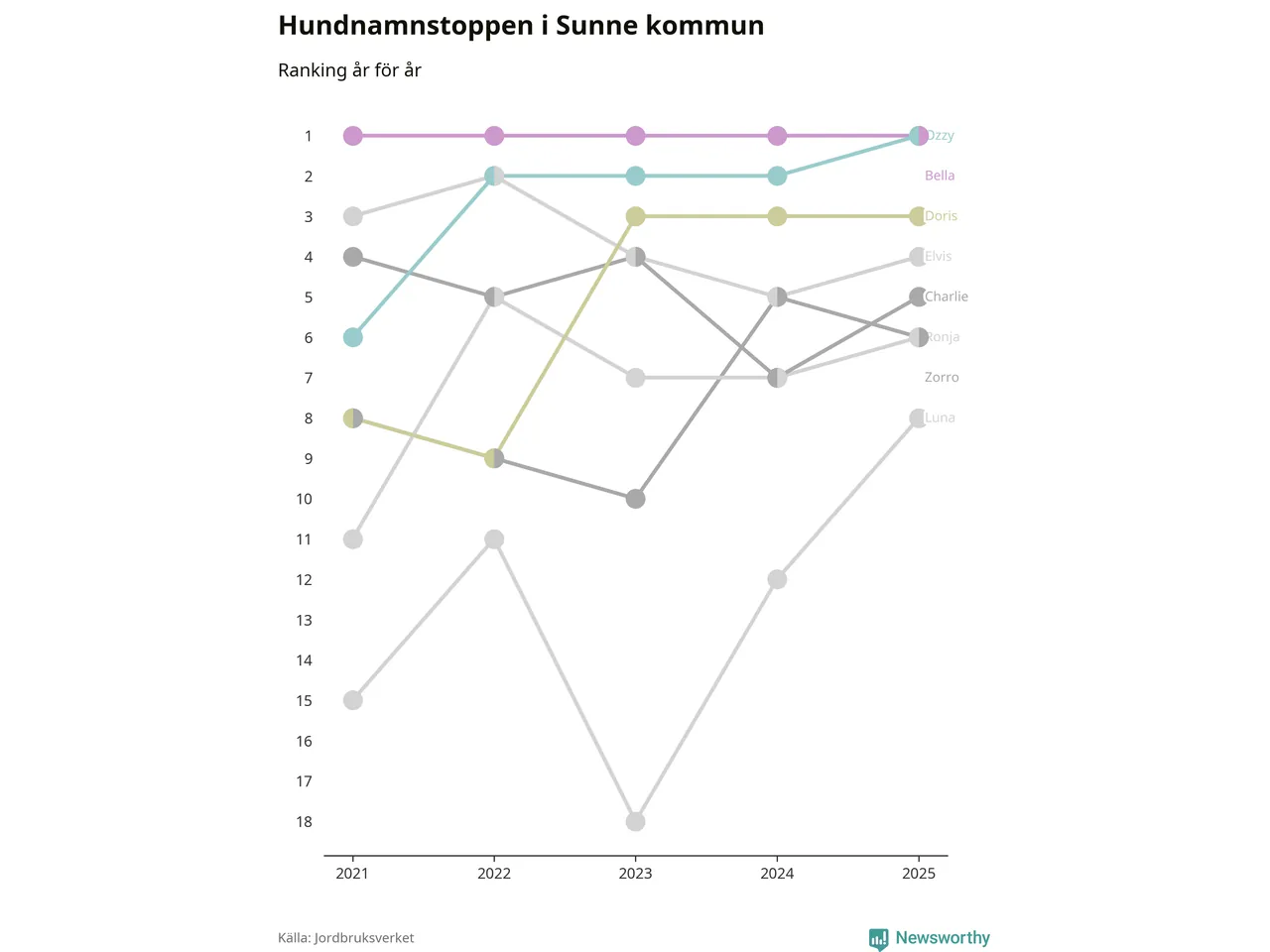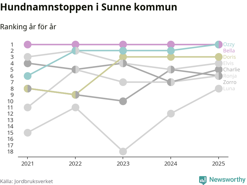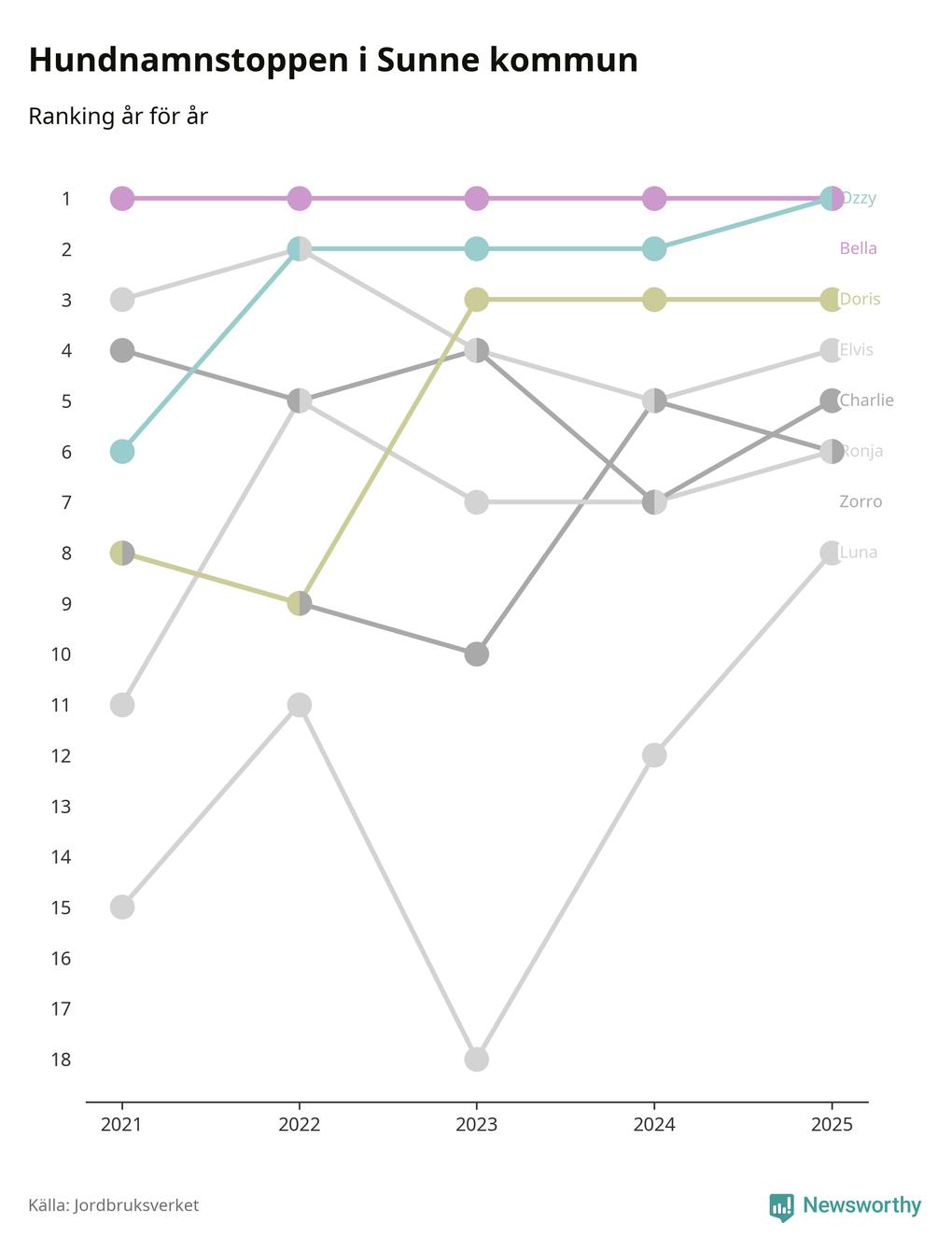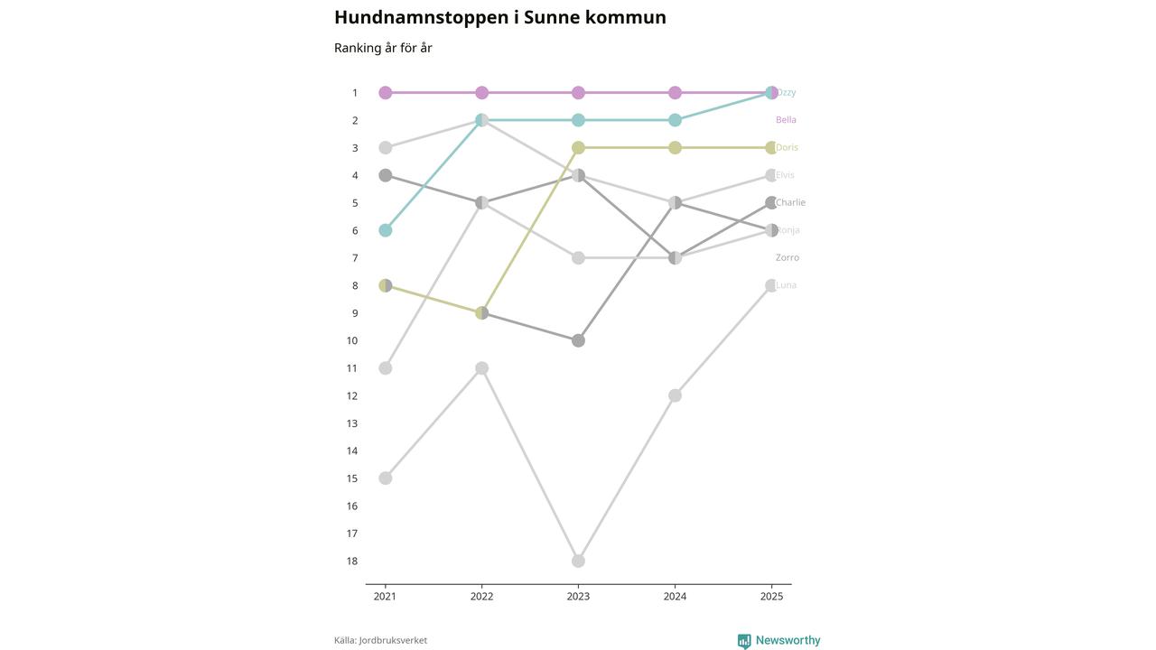 Molly är fortsatt ohotad etta bland hundnamnen i Sverige, följt av Bella och Charlie. Så har det sett ut flera år i rad, men bland Sunnehundarna är Ozzy och Bella populärast. Det gör Sunne till den enda kommun i landet där Ozzy är vanligast.