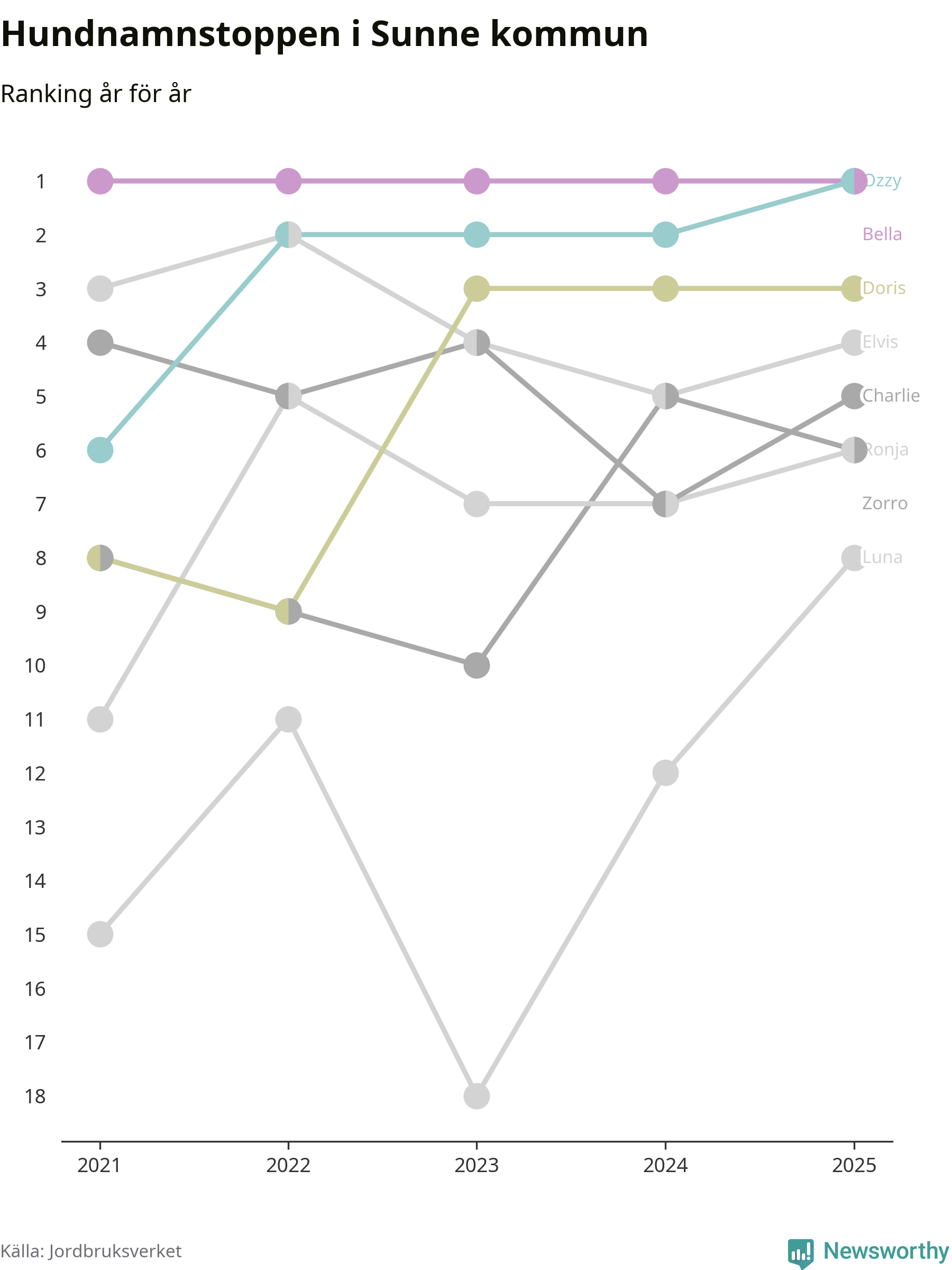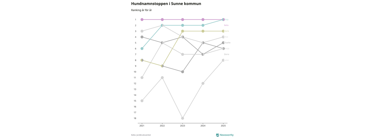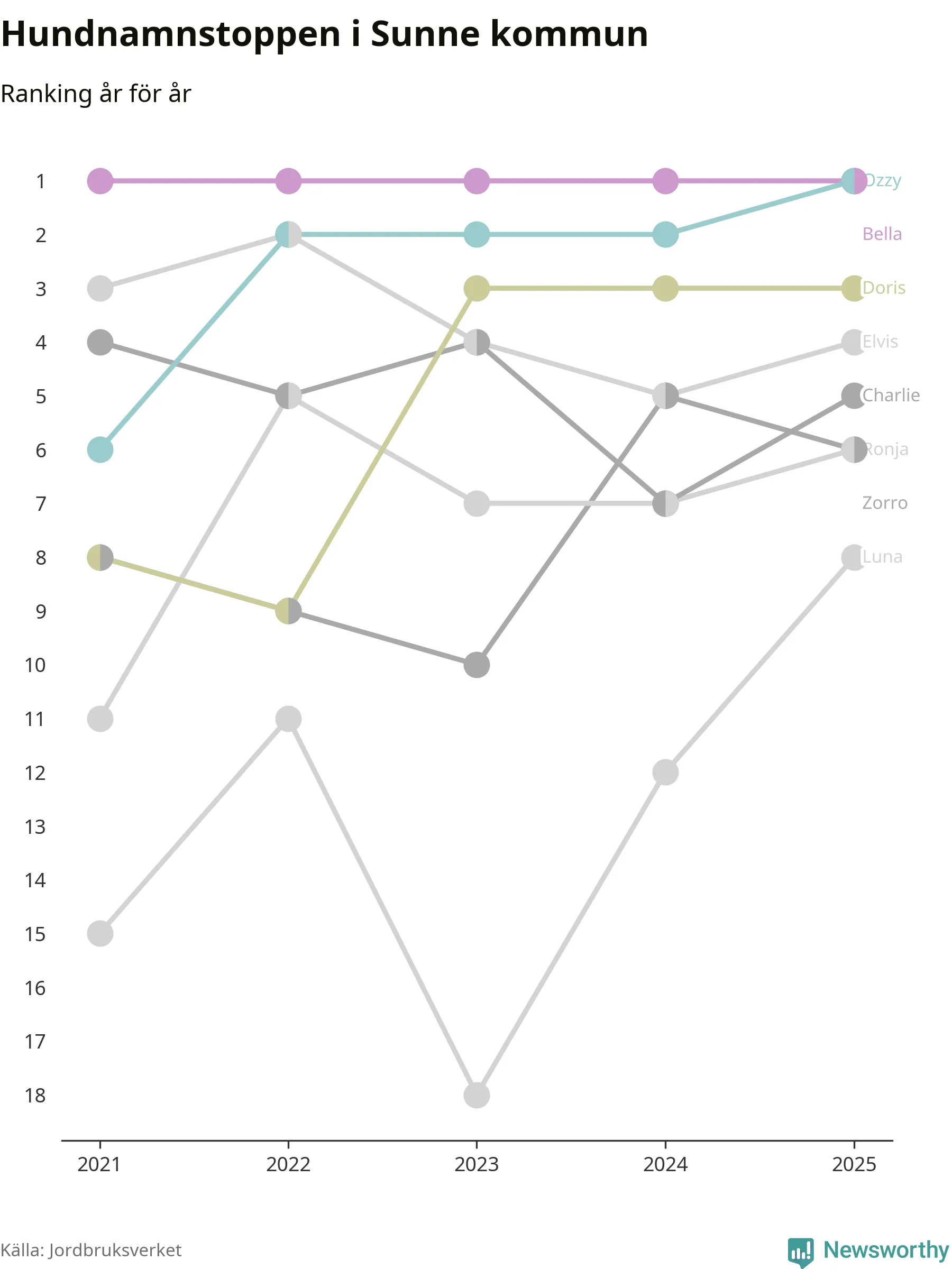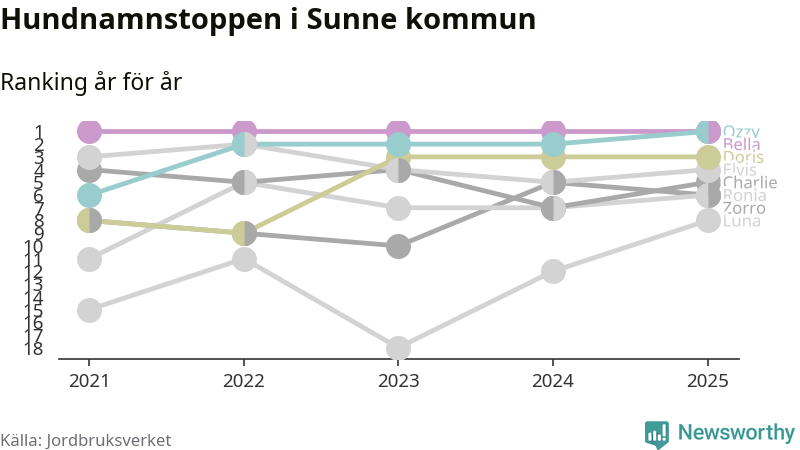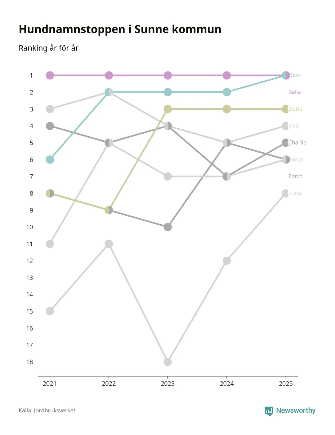 Molly är fortsatt ohotad etta bland hundnamnen i Sverige, följt av Bella och Charlie. Så har det sett ut flera år i rad, men bland Sunnehundarna är Ozzy och Bella populärast. Det gör Sunne till den enda kommun i landet där Ozzy är vanligast.