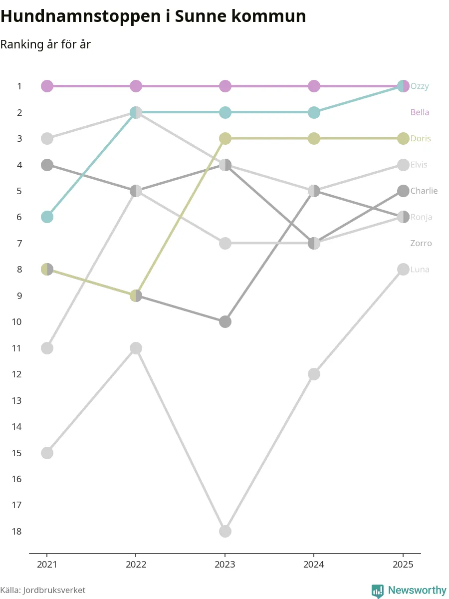 Ozzy utmanar Bella om förstaplatsen på topplistan över Sunnes hundnamn, visar ny statistik från Jordbruksverkets hundregister. Namnet delar nu topplaceringen.