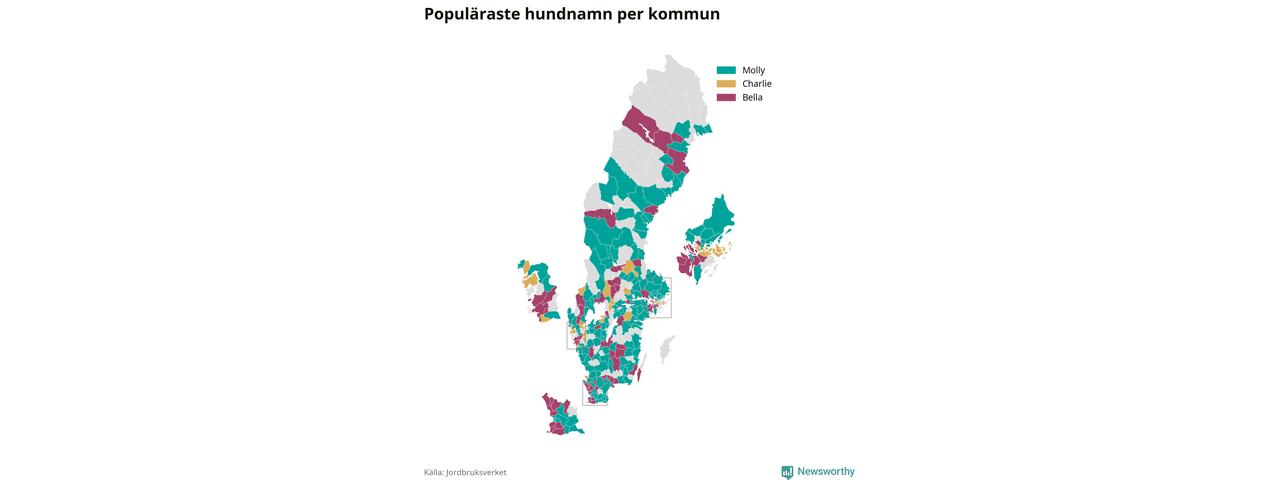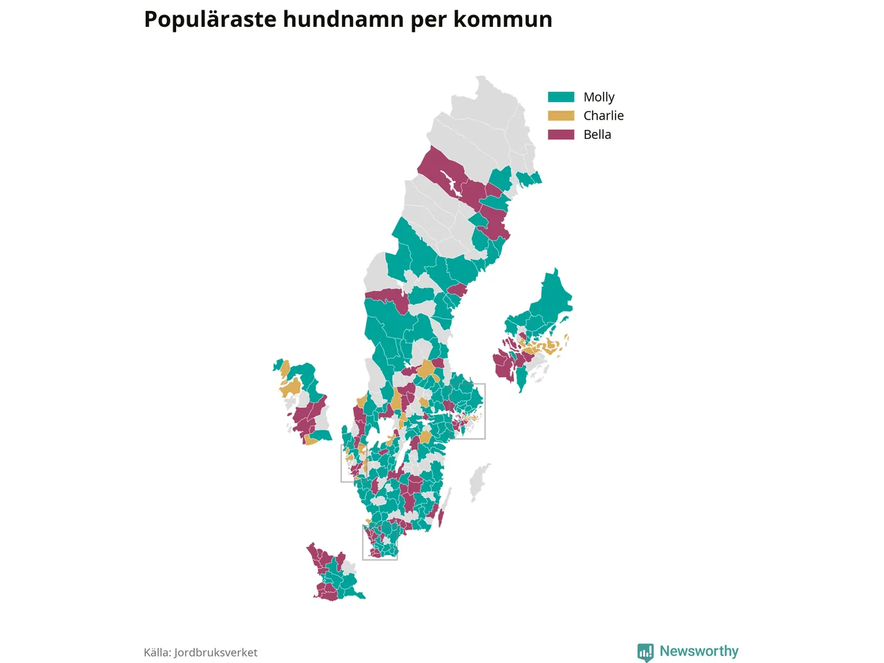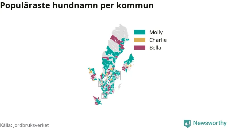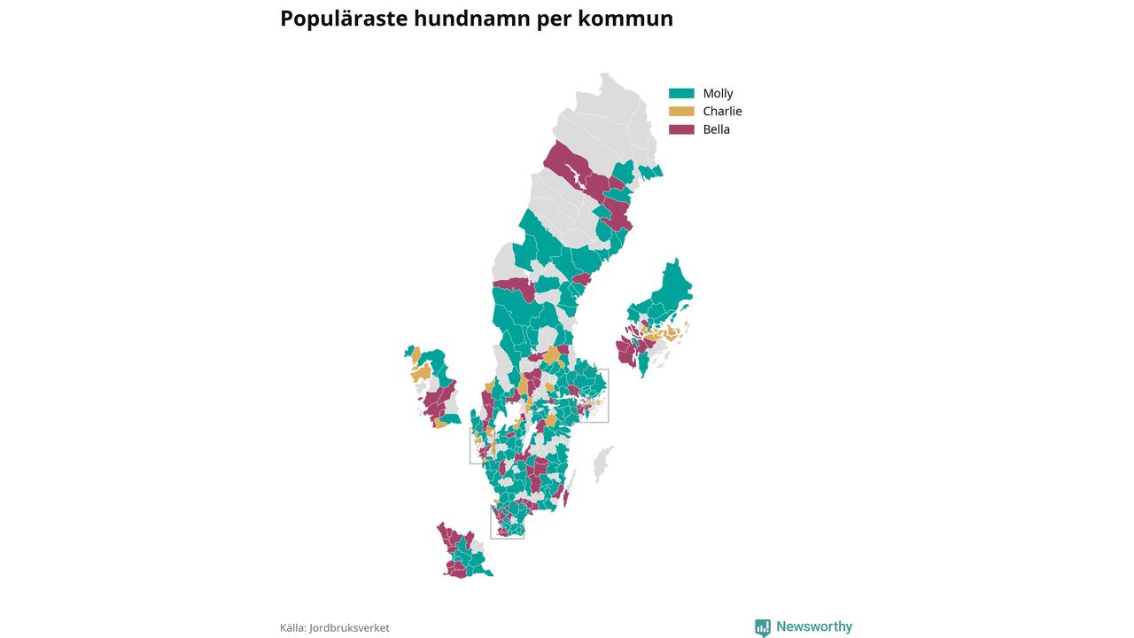 I hela landet är Molly det ohotat populäraste tilltalsnamnet för hundar sedan flera år, följt av Bella och Charlie. Något av de tre namnen toppar listan i 243 av 290 kommuner, och de har varit de vanligaste namnen sedan åtminstone 2018. Men det fjärde populäraste namnet, Doris, knappade in på ledartrion och kommer snart kunna utmana Charlie om tredjeplatsen, om trenden håller i sig.