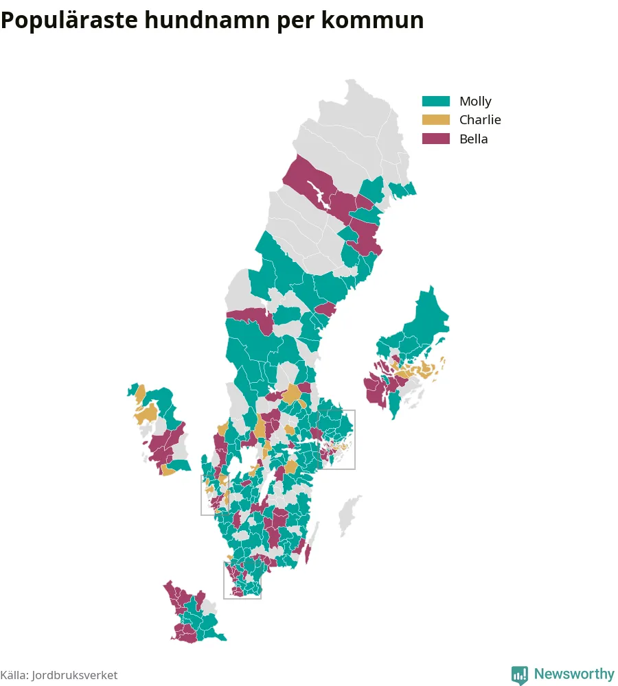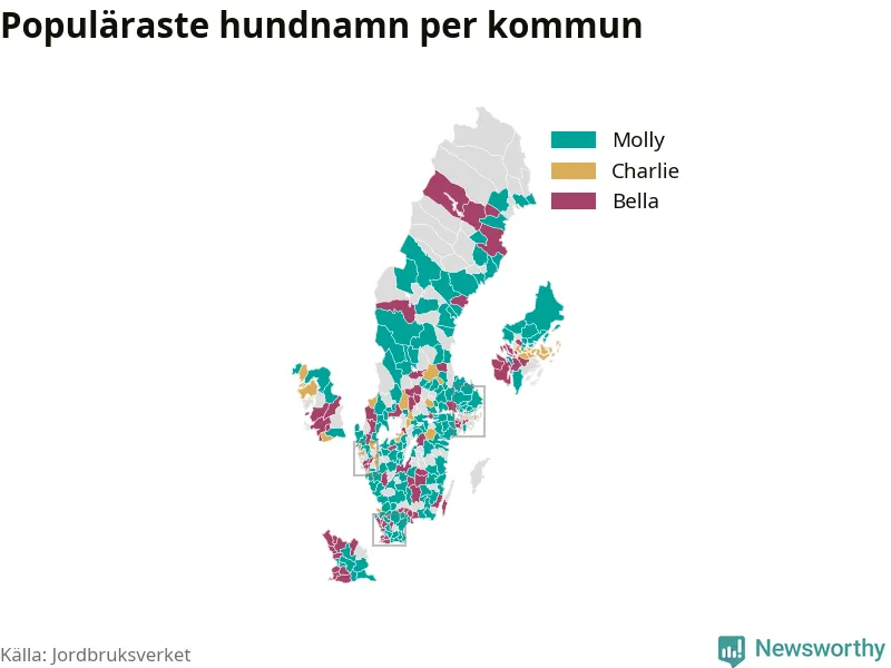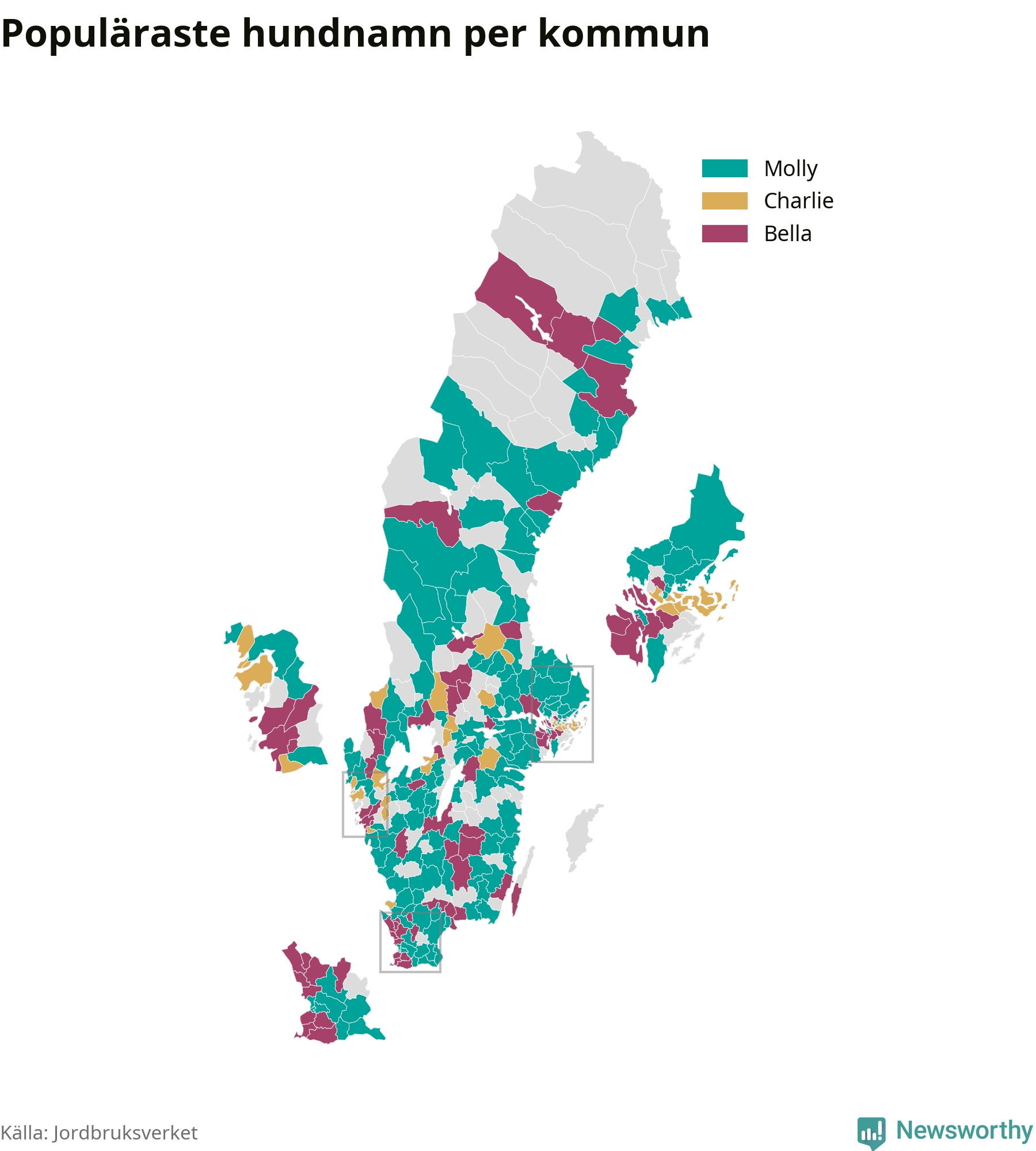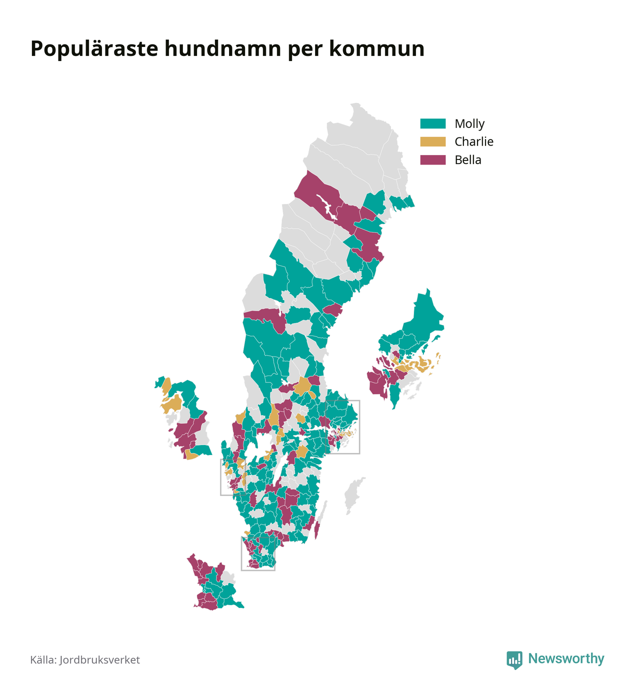 I hela landet är Molly det ohotat populäraste tilltalsnamnet för hundar sedan flera år, följt av Bella och Charlie. Något av de tre namnen toppar listan i 243 av 290 kommuner, och de har varit de vanligaste namnen sedan åtminstone 2018. Men det fjärde populäraste namnet, Doris, knappade in på ledartrion och kommer snart kunna utmana Charlie om tredjeplatsen, om trenden håller i sig.