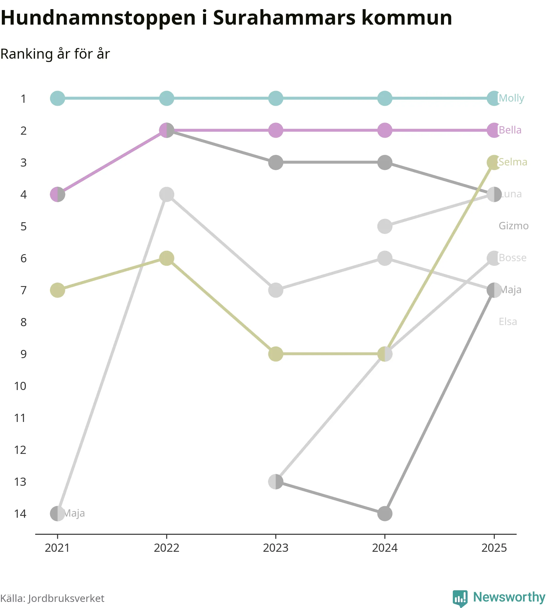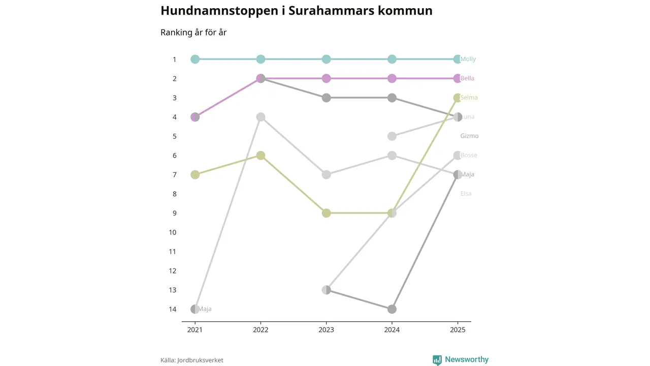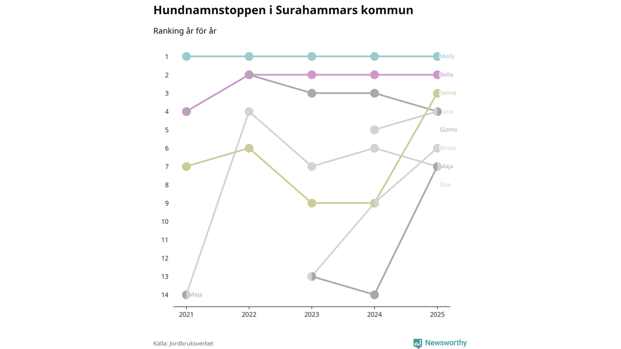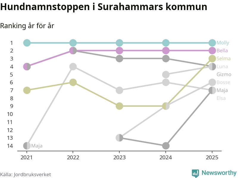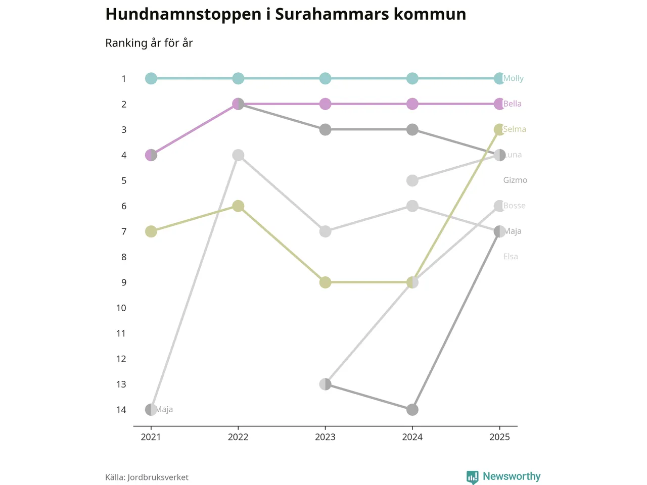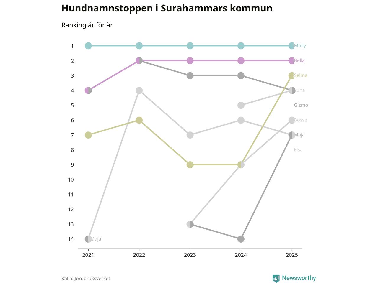 Molly är fortsatt ohotad etta bland hundnamnen i Sverige, följt av Bella och Charlie. Så har det sett ut flera år i rad, och även bland Surahammarshundarna ligger alltså Molly i topp.