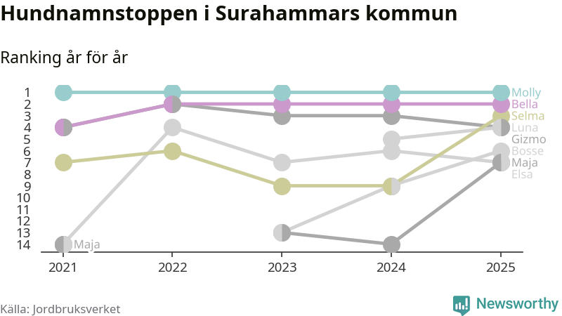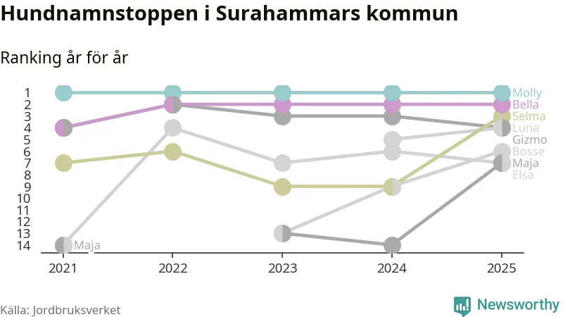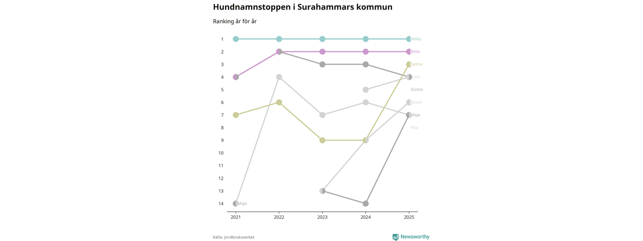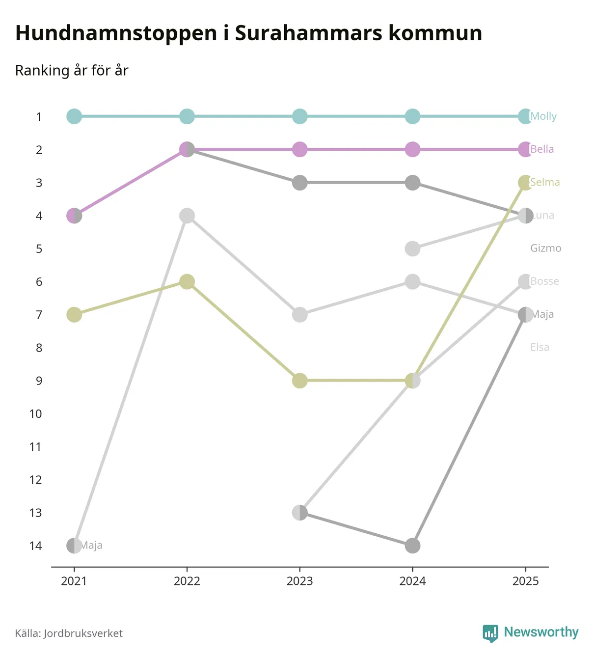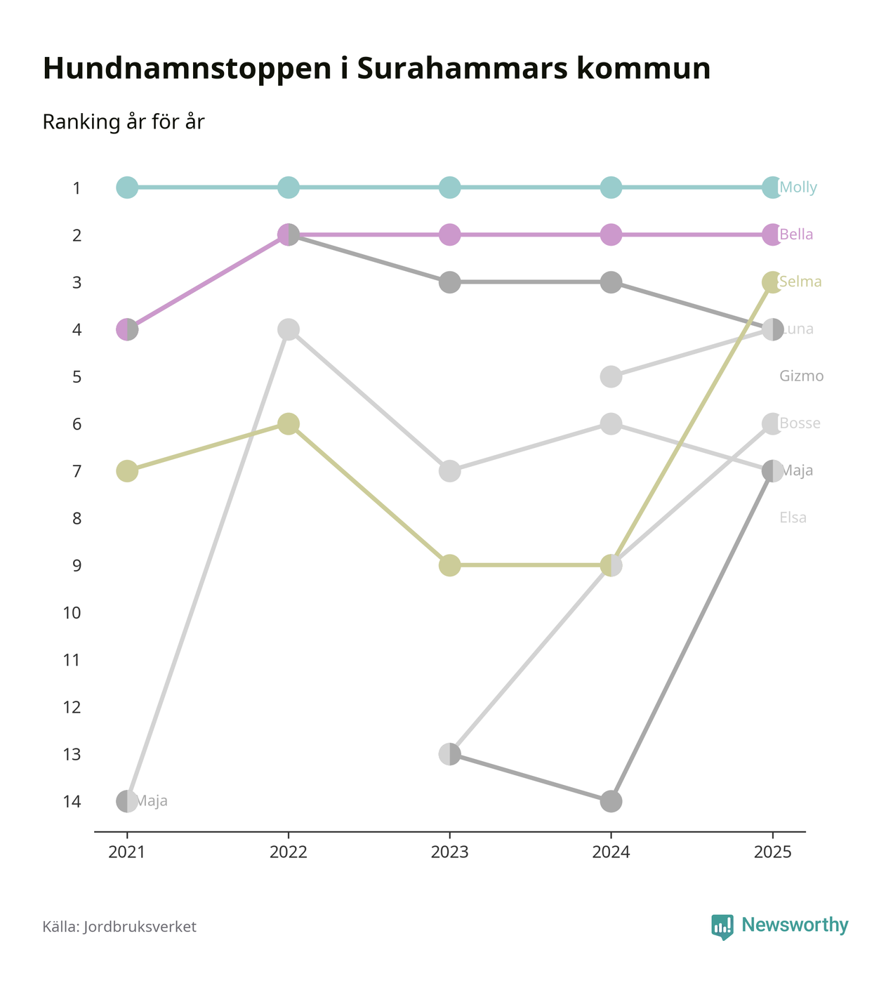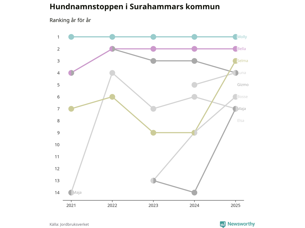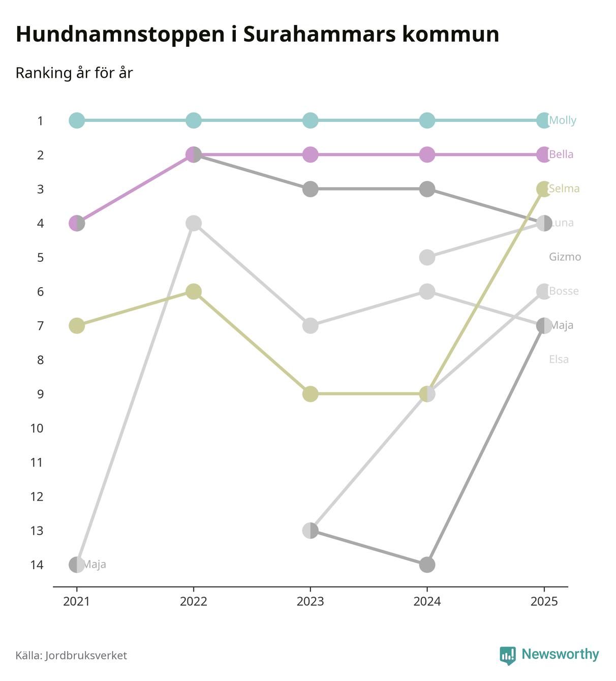 Molly är fortsatt ohotad etta bland hundnamnen i Sverige, följt av Bella och Charlie. Så har det sett ut flera år i rad, och även bland Surahammarshundarna ligger alltså Molly i topp.
