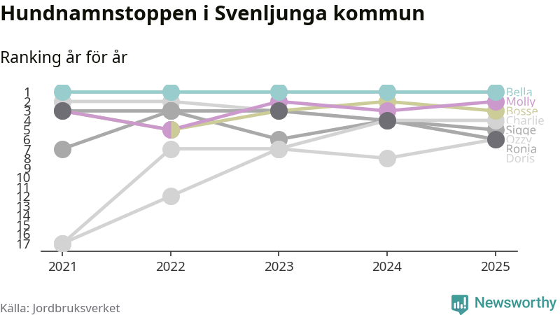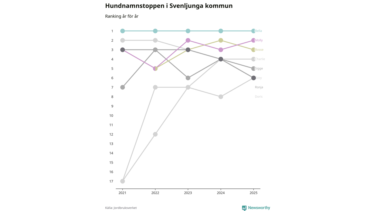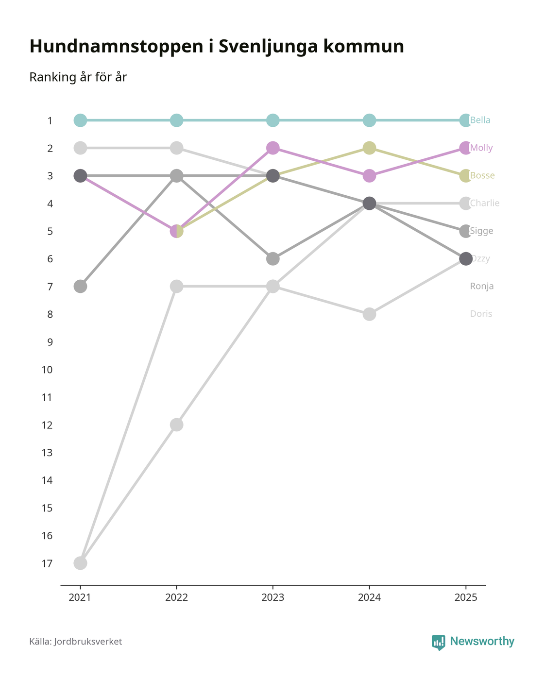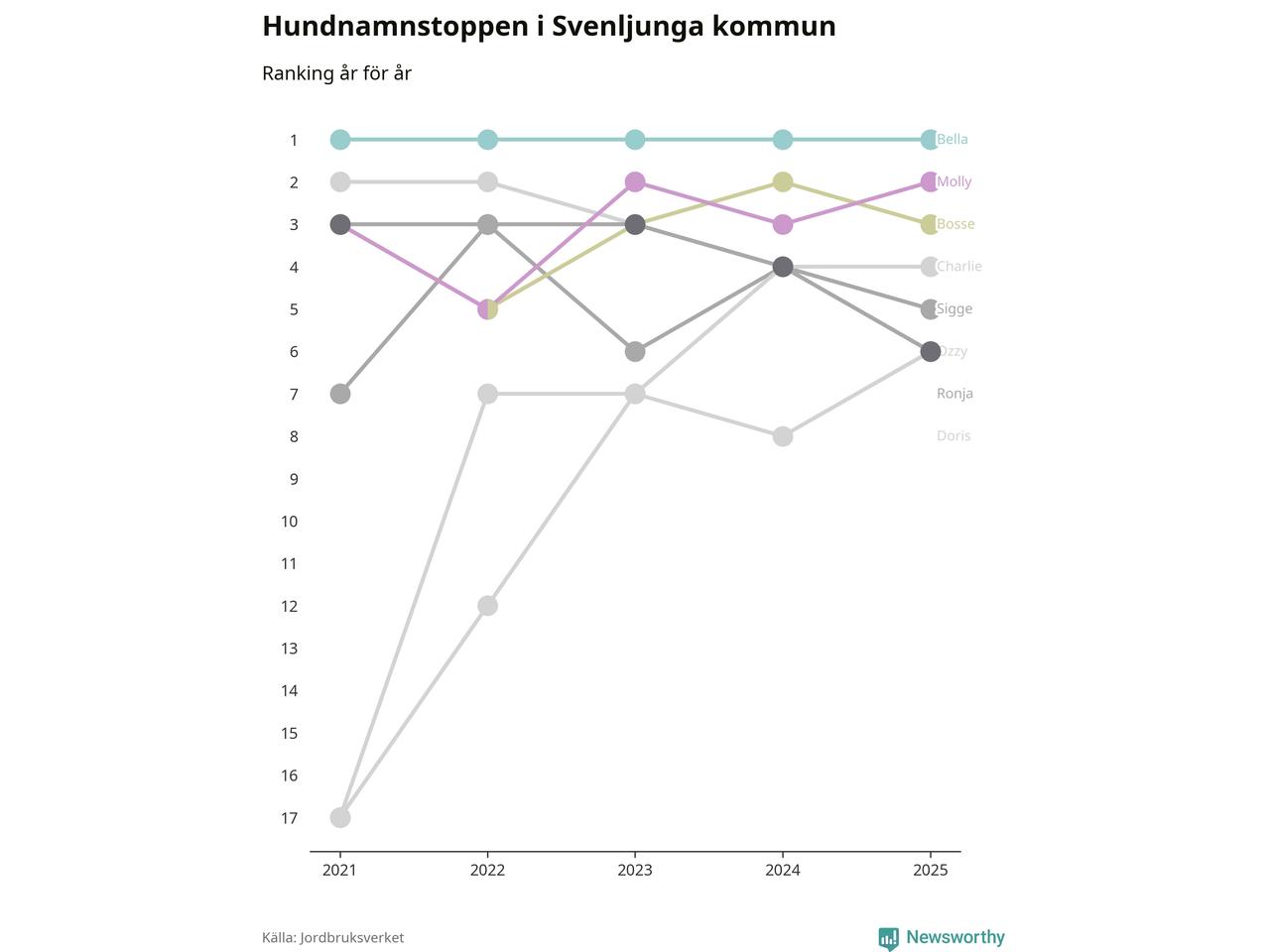 Molly är fortsatt ohotad etta bland hundnamnen i Sverige, följt av Bella och Charlie. Så har det sett ut flera år i rad, men bland Svenljungahundarna är Bella populärast.