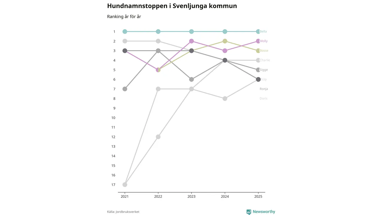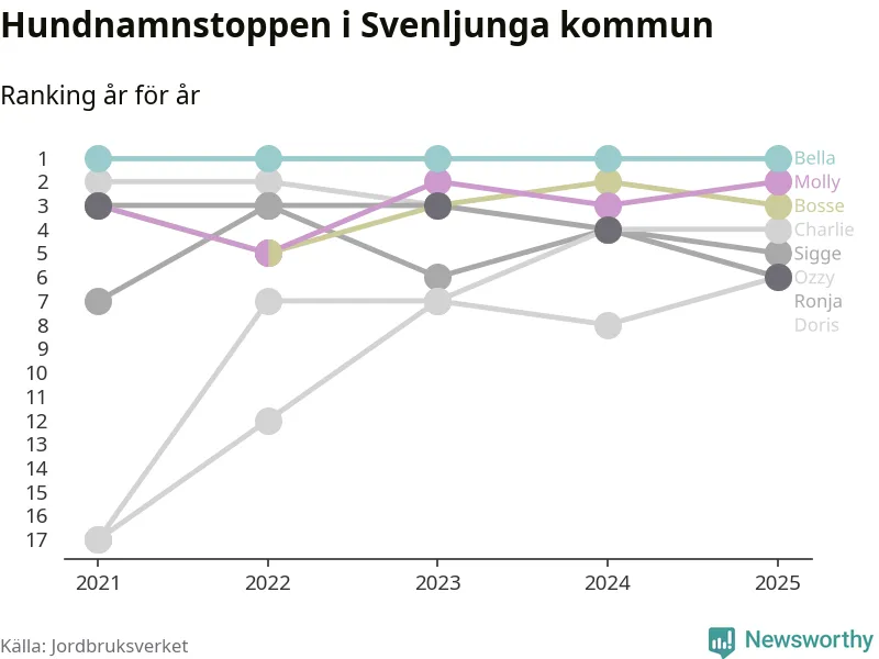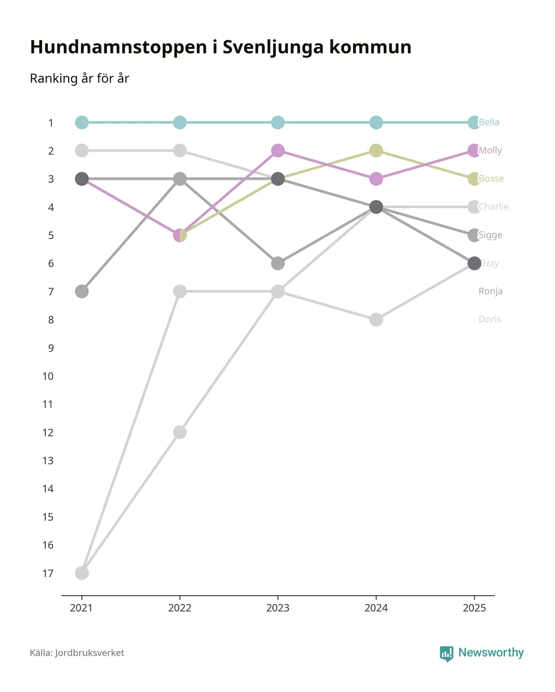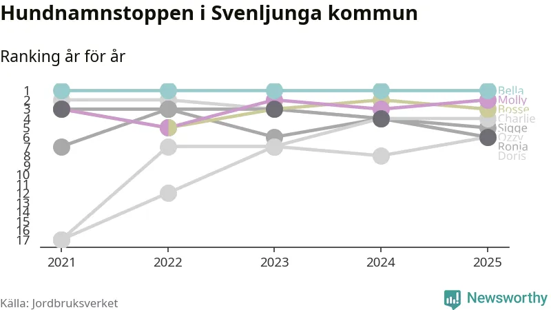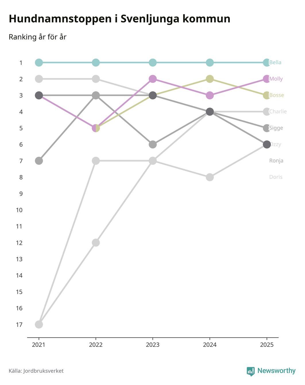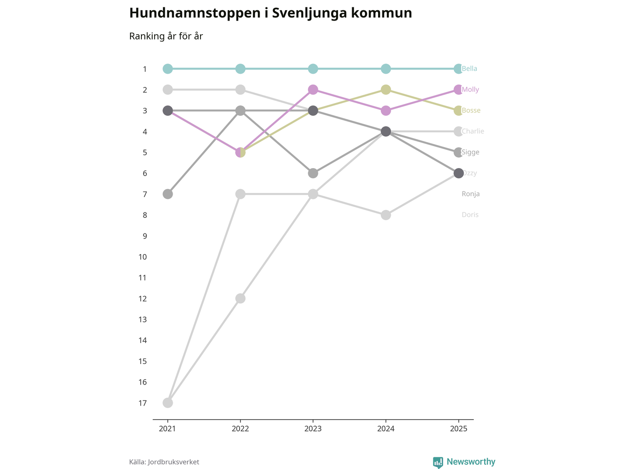 I hela landet är Molly det ohotat populäraste tilltalsnamnet för hundar sedan flera år, följt av Bella och Charlie. Något av de tre namnen toppar listan i 243 av 290 kommuner, och de har varit de vanligaste namnen sedan åtminstone 2018. Men det fjärde populäraste namnet, Doris, knappade in på ledartrion och kommer snart kunna utmana Charlie om tredjeplatsen, om trenden håller i sig.