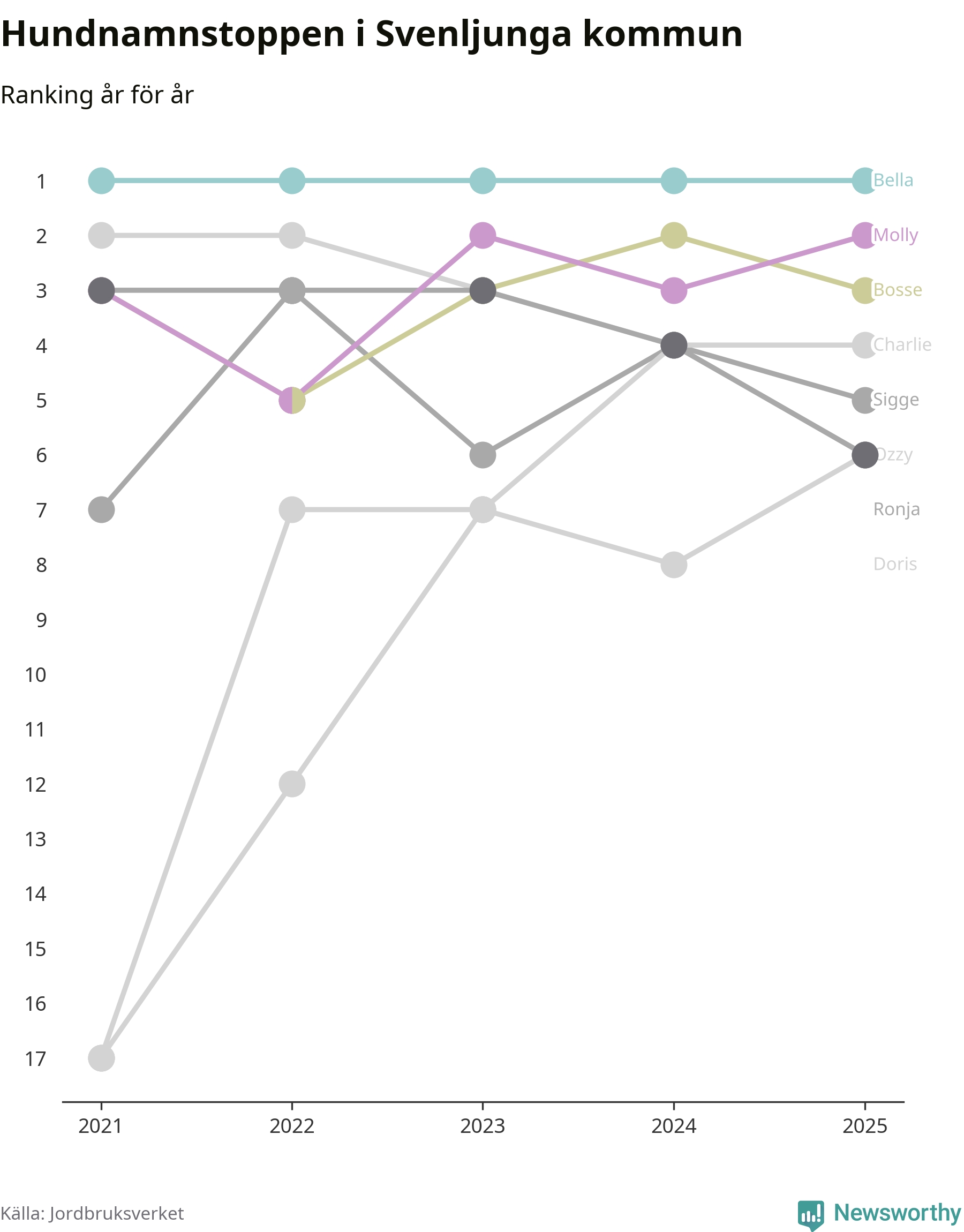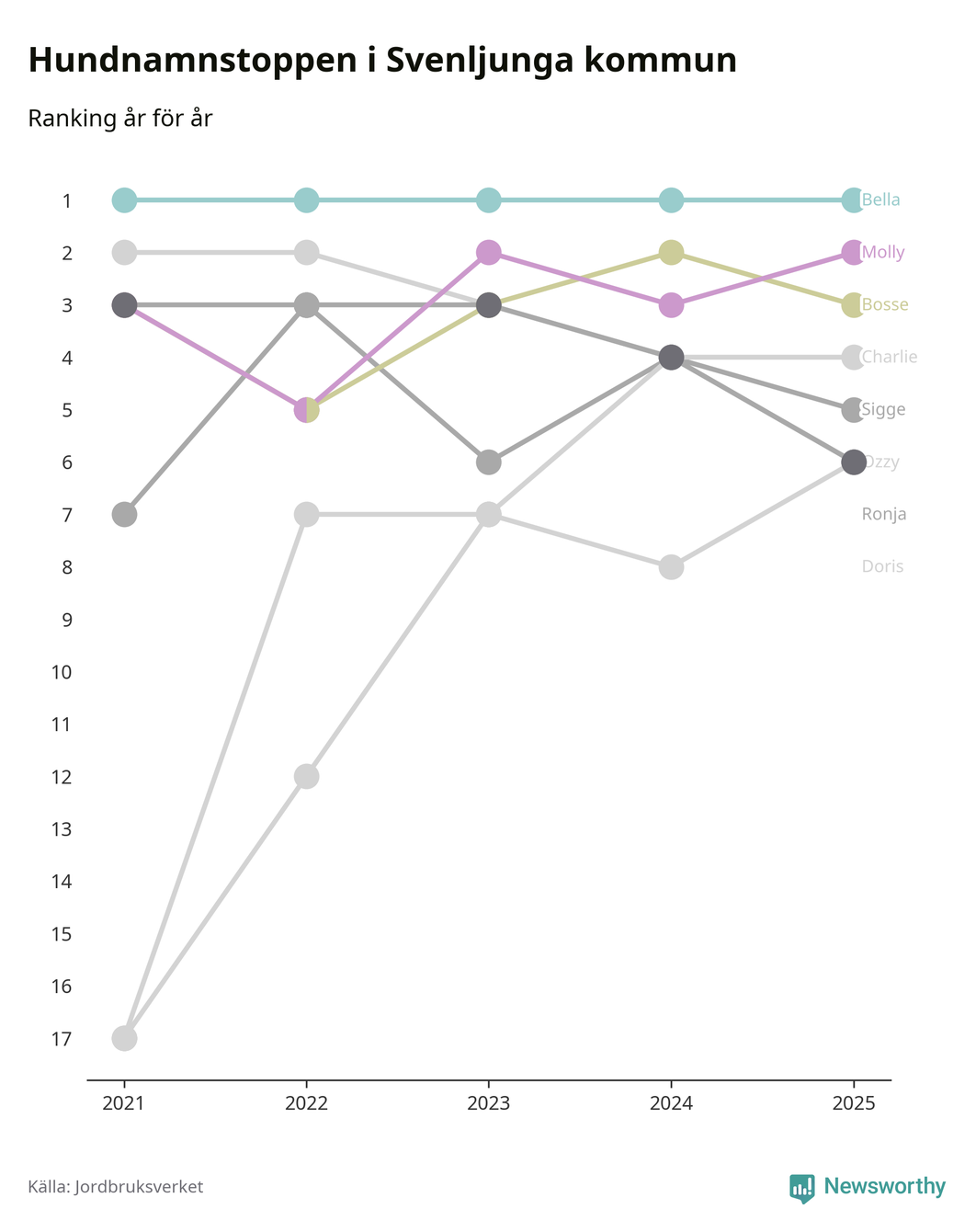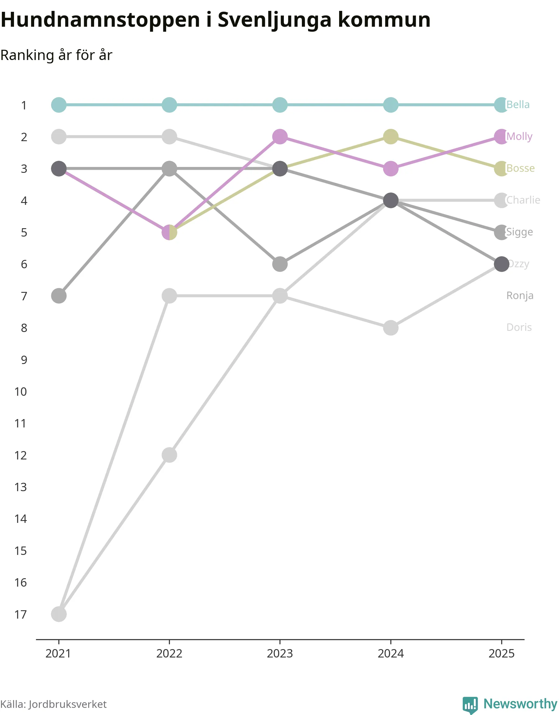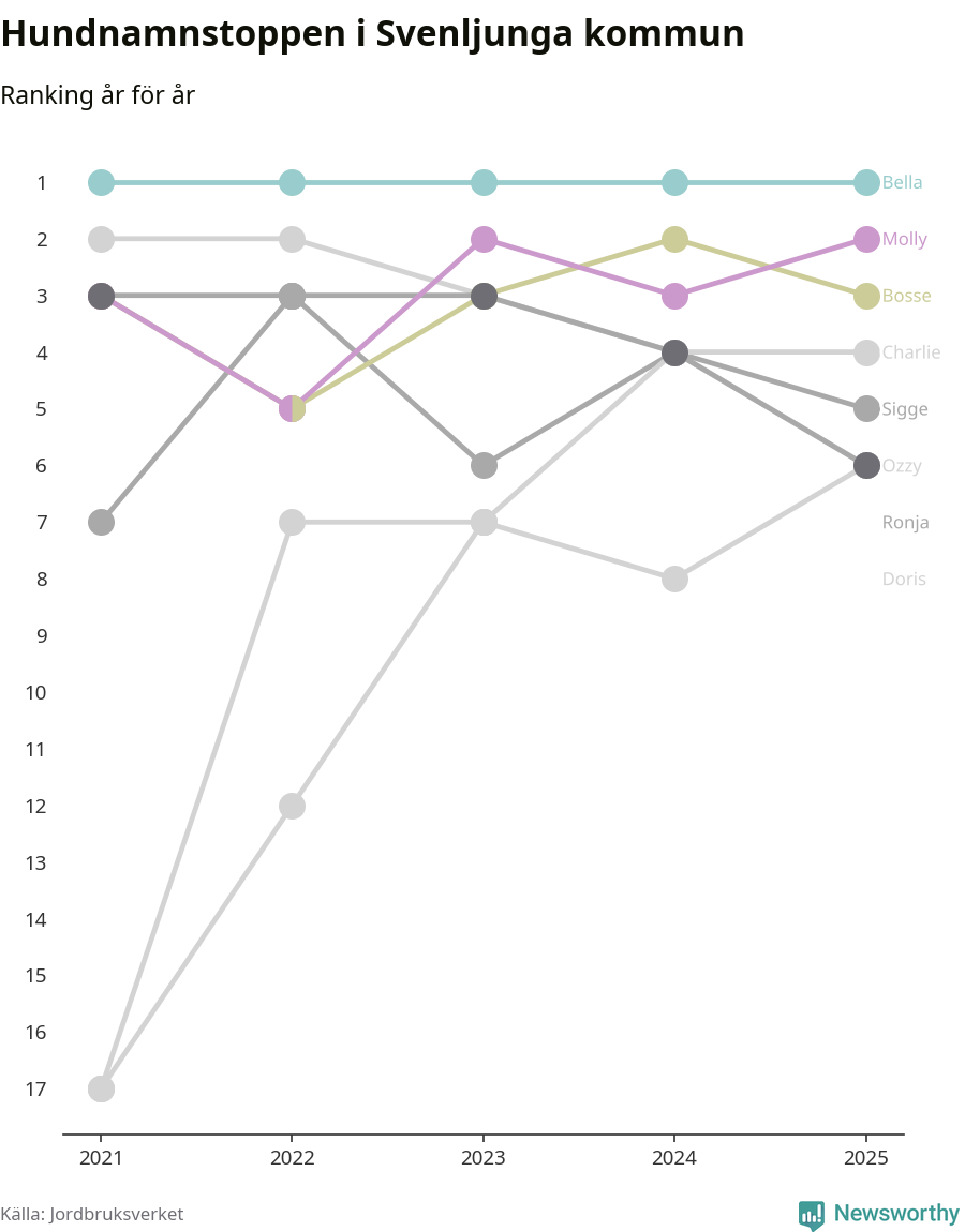 I hela landet är Molly det ohotat populäraste tilltalsnamnet för hundar sedan flera år, följt av Bella och Charlie. Något av de tre namnen toppar listan i 243 av 290 kommuner, och de har varit de vanligaste namnen sedan åtminstone 2018. Men det fjärde populäraste namnet, Doris, knappade in på ledartrion och kommer snart kunna utmana Charlie om tredjeplatsen, om trenden håller i sig.
