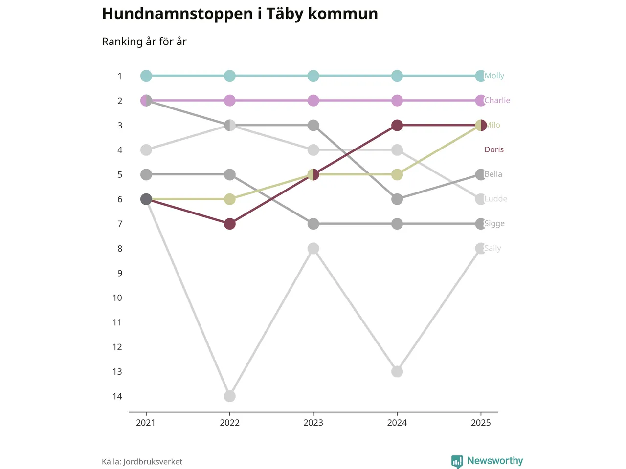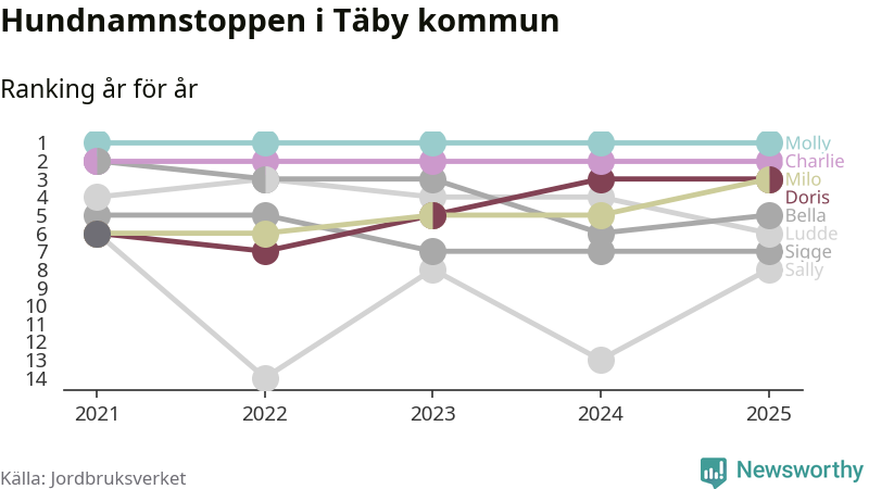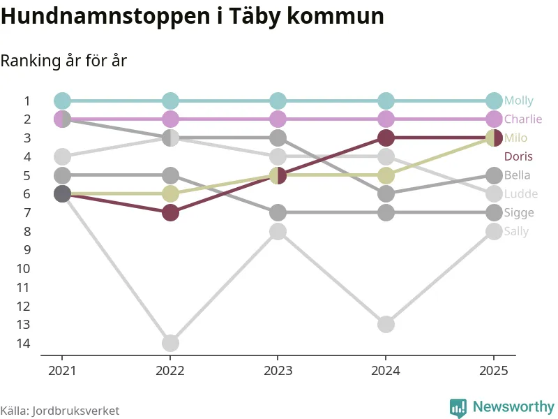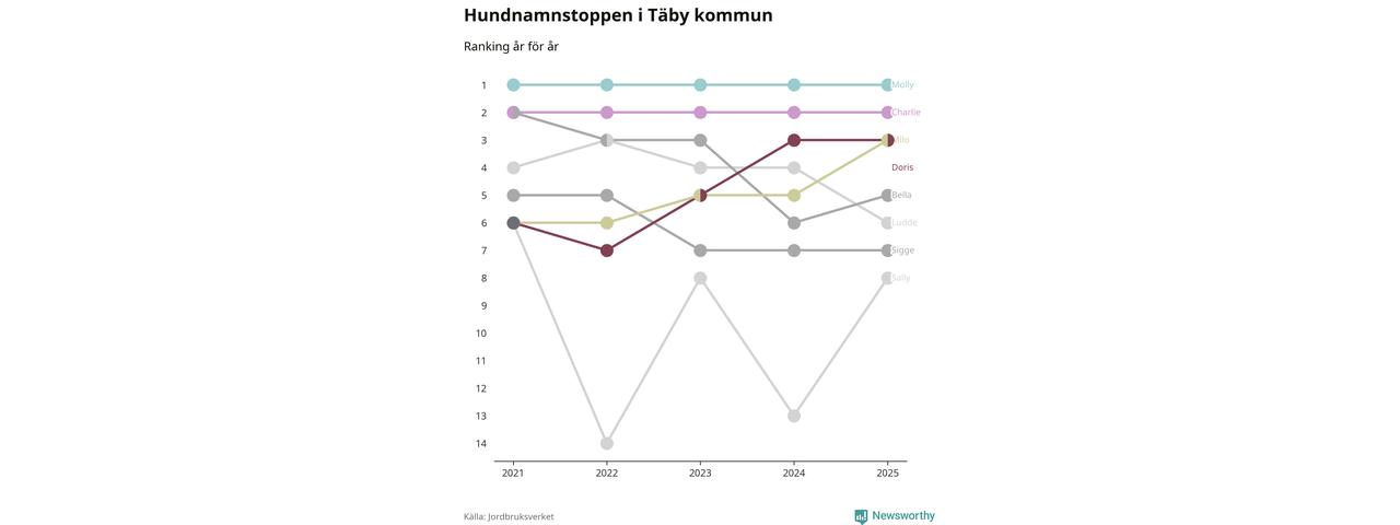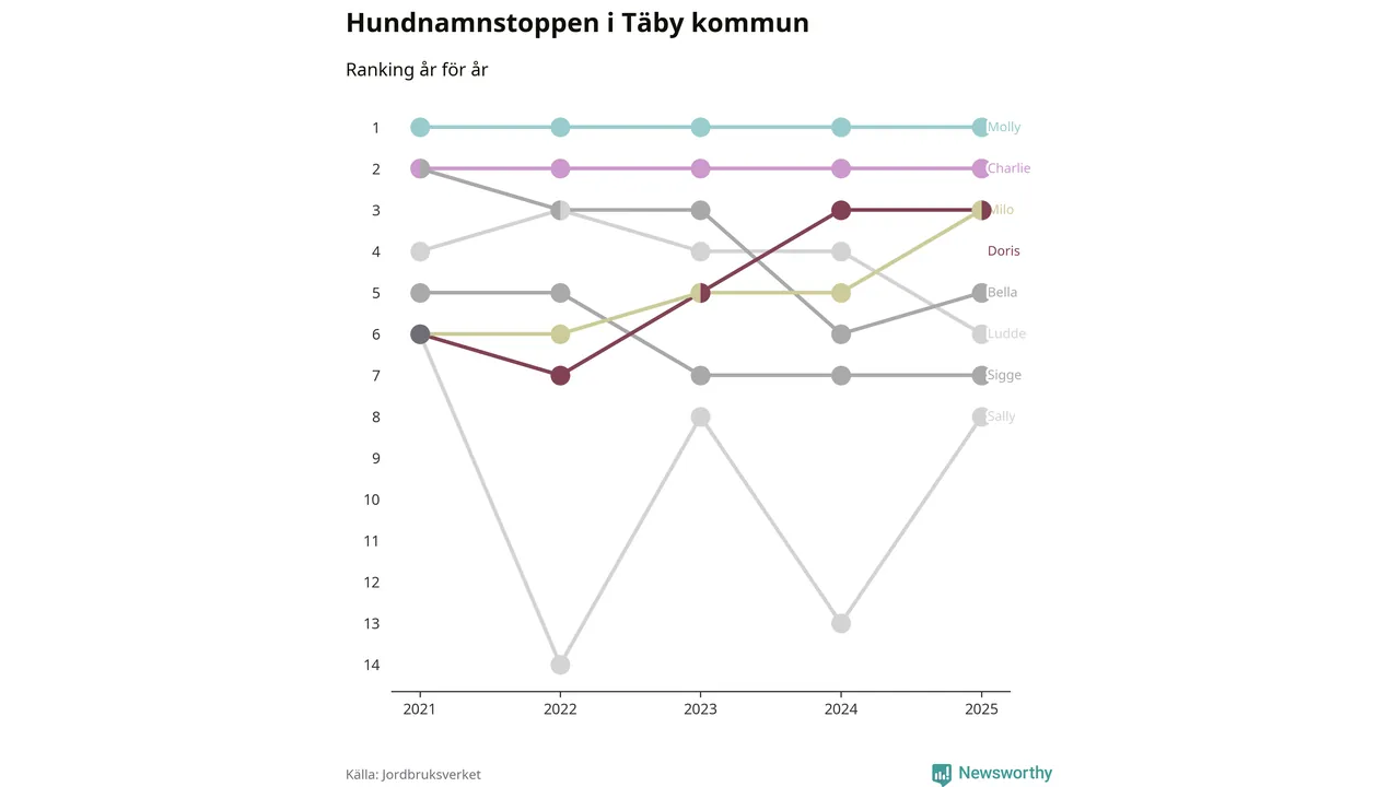 I hela landet är Molly det ohotat populäraste tilltalsnamnet för hundar sedan flera år, följt av Bella och Charlie. Något av de tre namnen toppar listan i 243 av 290 kommuner, och de har varit de vanligaste namnen sedan åtminstone 2018. Men det fjärde populäraste namnet, Doris, knappade in på ledartrion och kommer snart kunna utmana Charlie om tredjeplatsen, om trenden håller i sig.