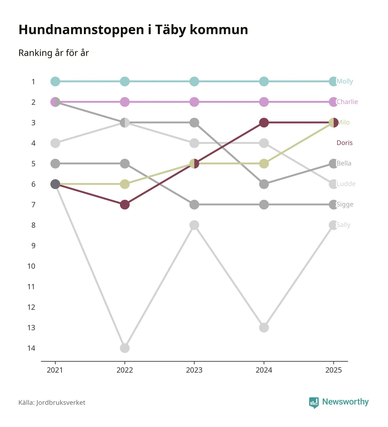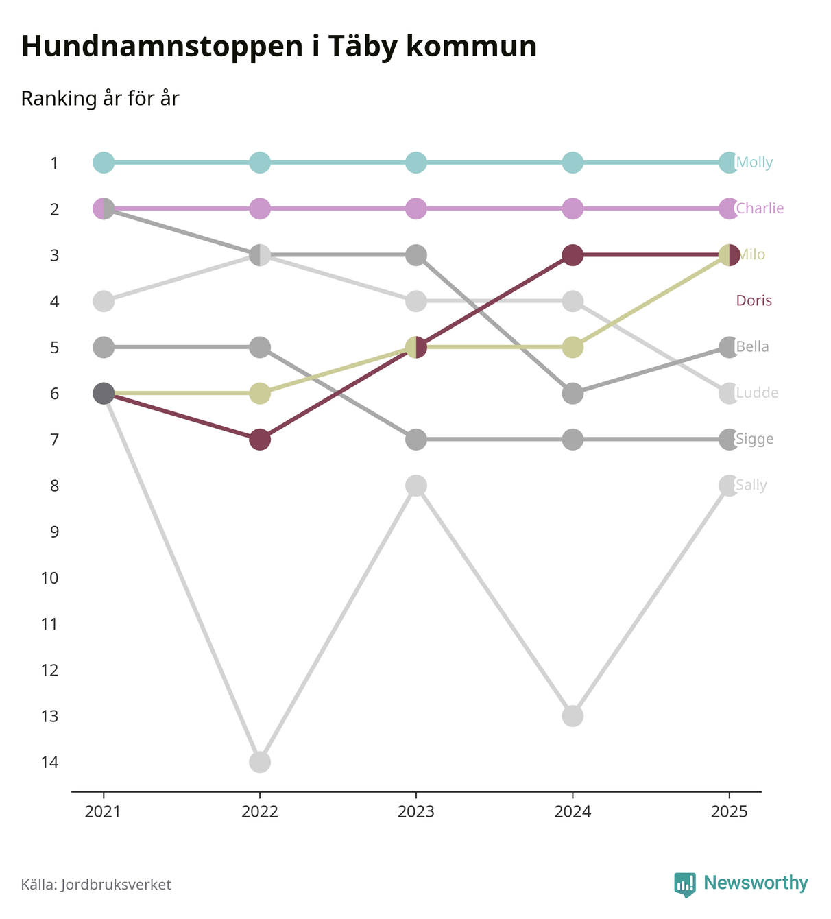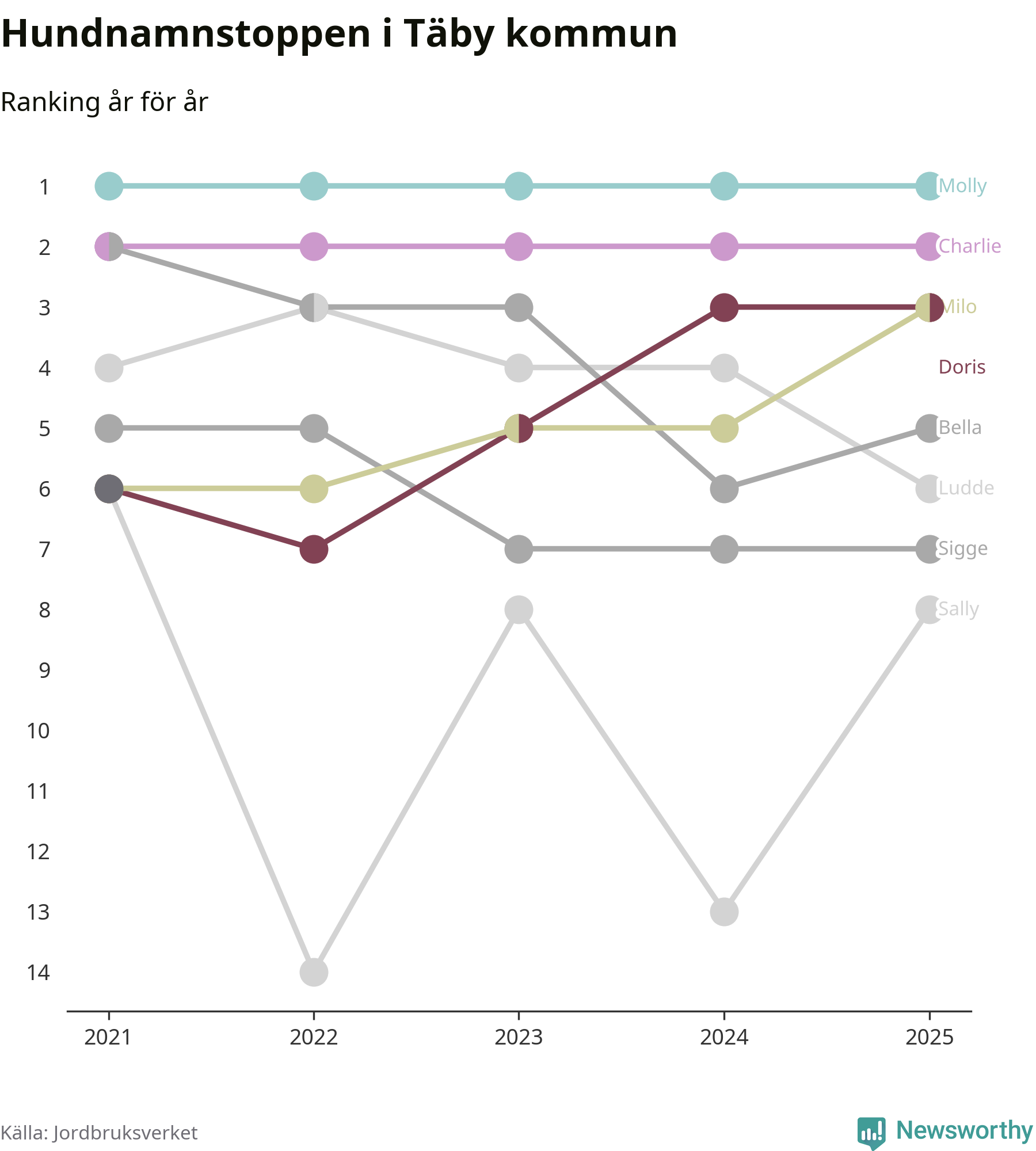 I hela landet är Molly det ohotat populäraste tilltalsnamnet för hundar sedan flera år, följt av Bella och Charlie. Något av de tre namnen toppar listan i 243 av 290 kommuner, och de har varit de vanligaste namnen sedan åtminstone 2018. Men det fjärde populäraste namnet, Doris, knappade in på ledartrion och kommer snart kunna utmana Charlie om tredjeplatsen, om trenden håller i sig.