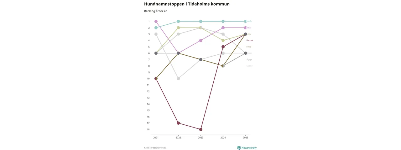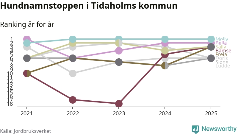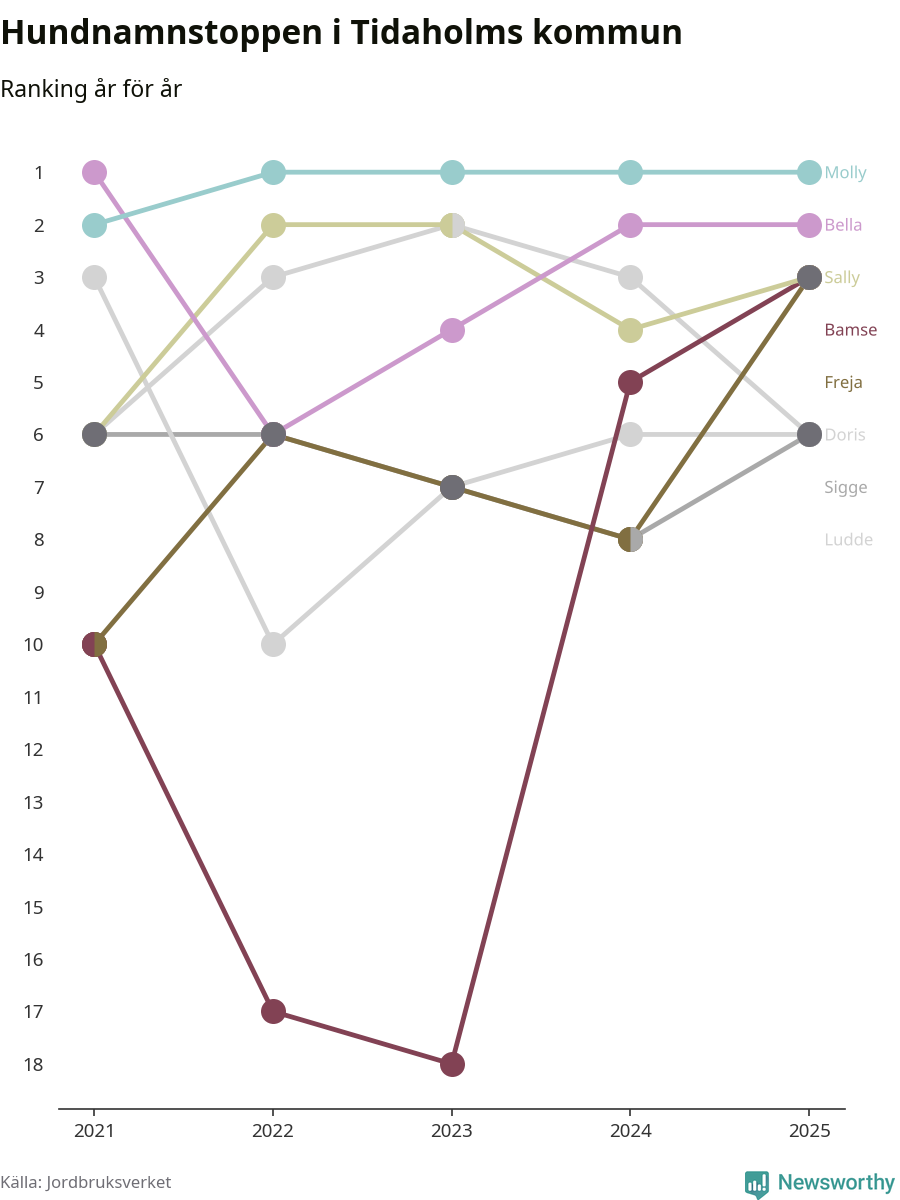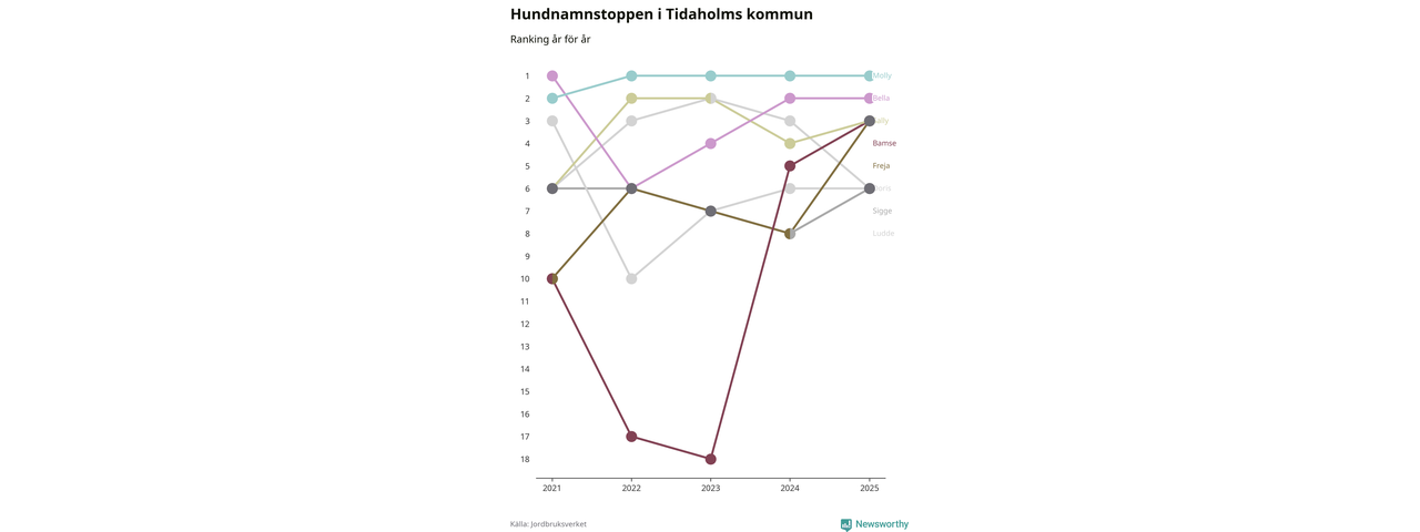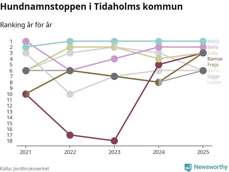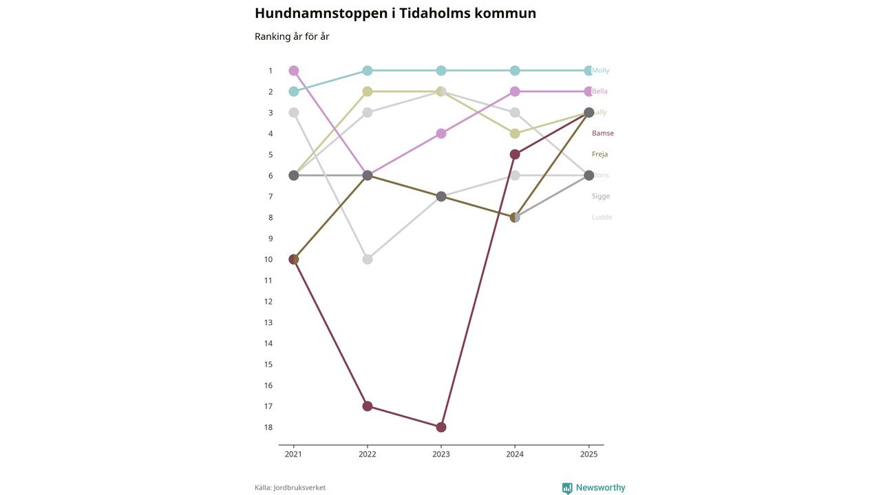 Molly toppar hundnamnsligan i Tidaholms kommun, precis som i landet som helhet. Det visar färsk statistik från Jordbruksverket. Här finns hela topplistan för kommunen.