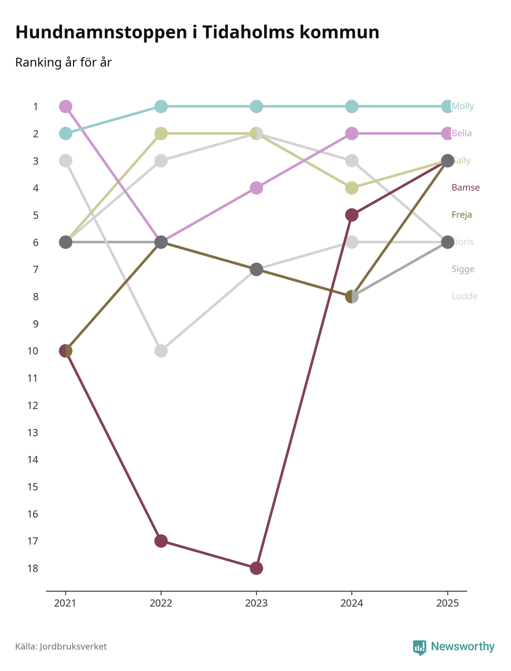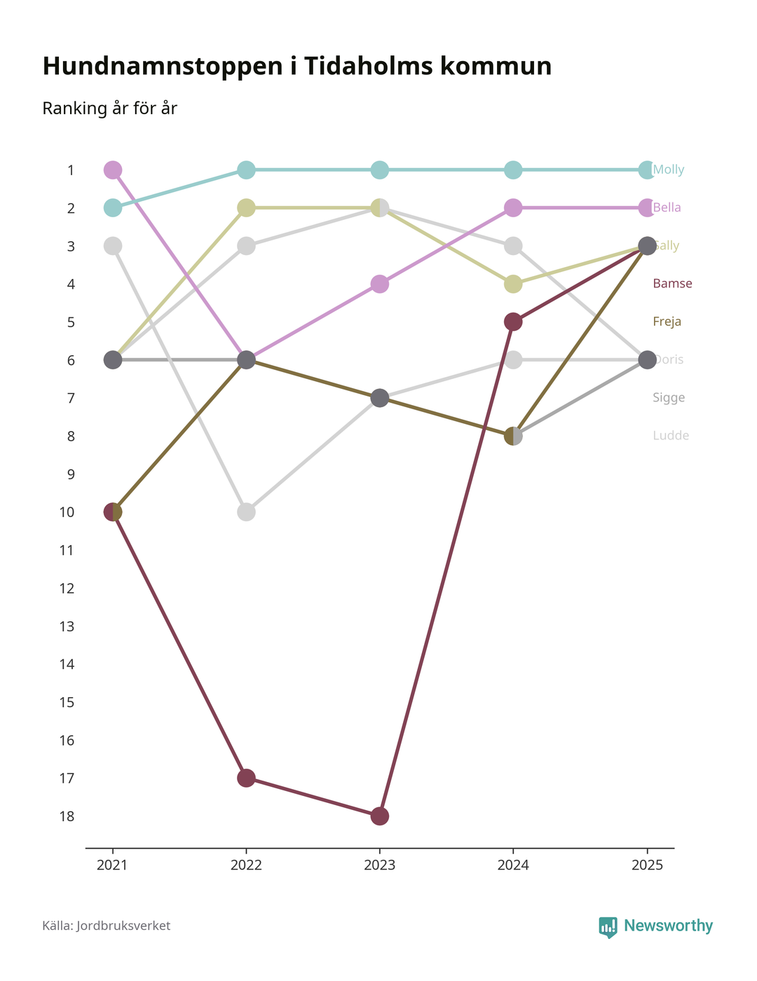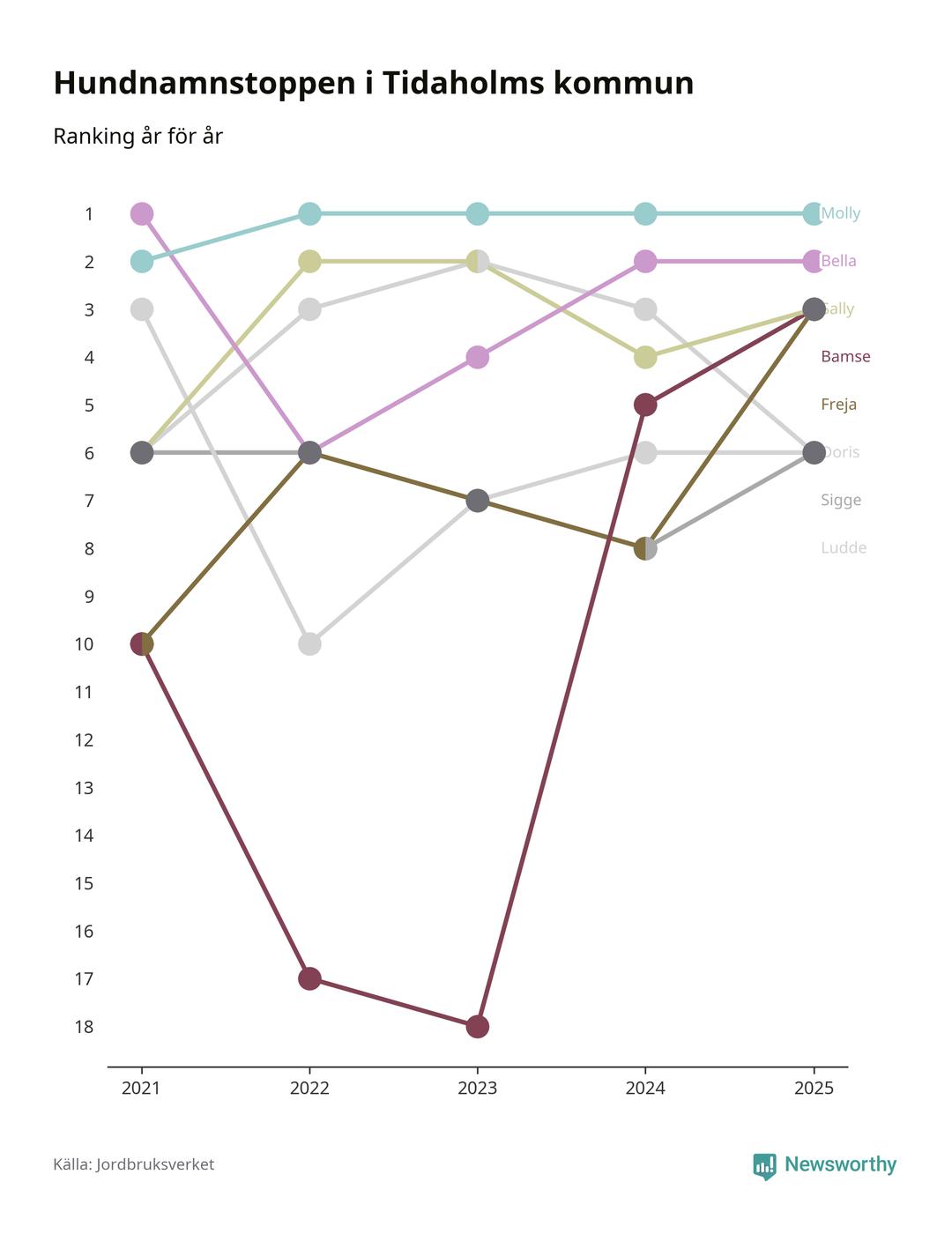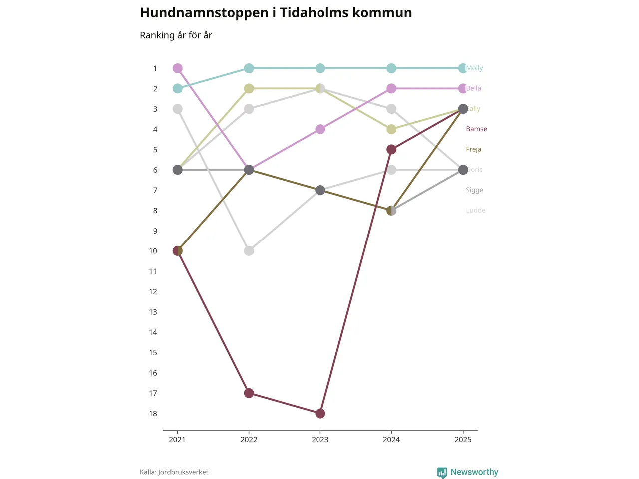 Molly toppar hundnamnsligan i Tidaholms kommun, precis som i landet som helhet. Det visar färsk statistik från Jordbruksverket. Här finns hela topplistan för kommunen.