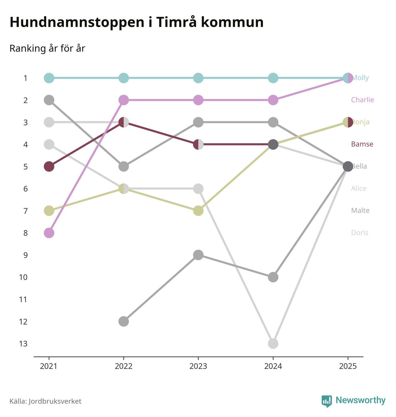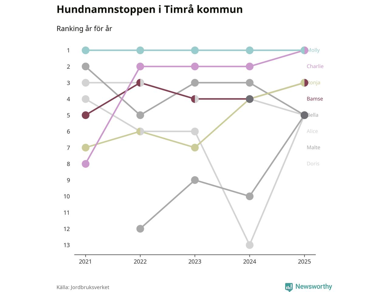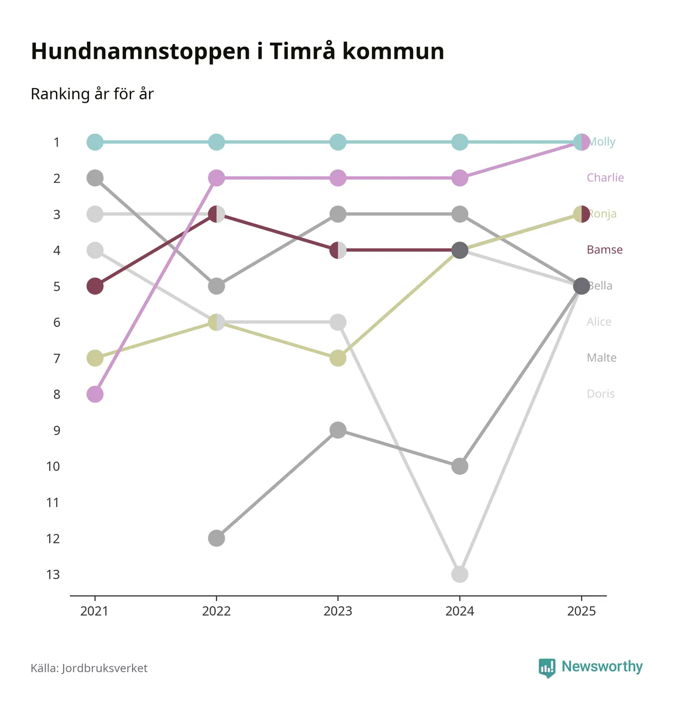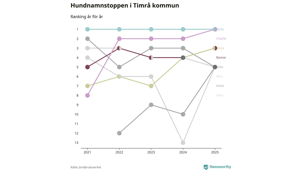 Molly är fortsatt ohotad etta bland hundnamnen i Sverige, följt av Bella och Charlie. Så har det sett ut flera år i rad, och även bland Timråhundarna ligger Molly i topp, tillsammans med Charlie.