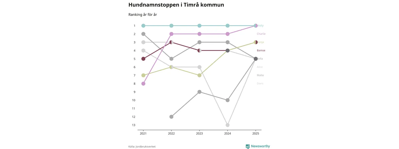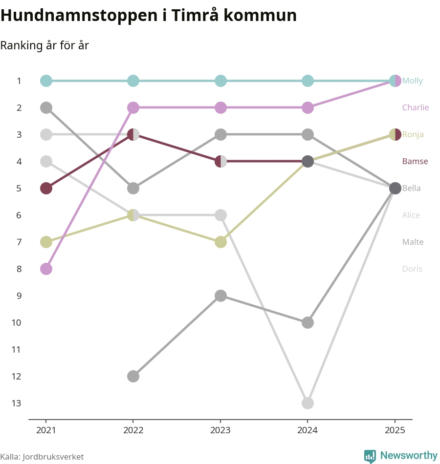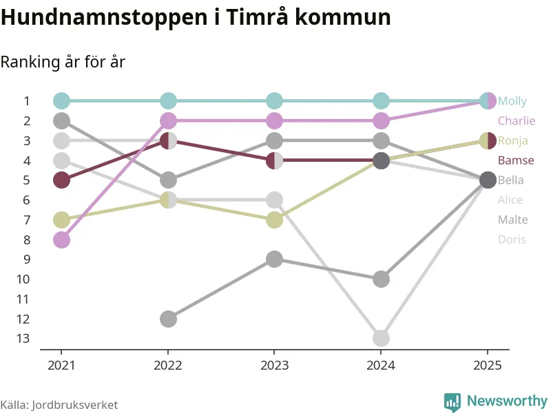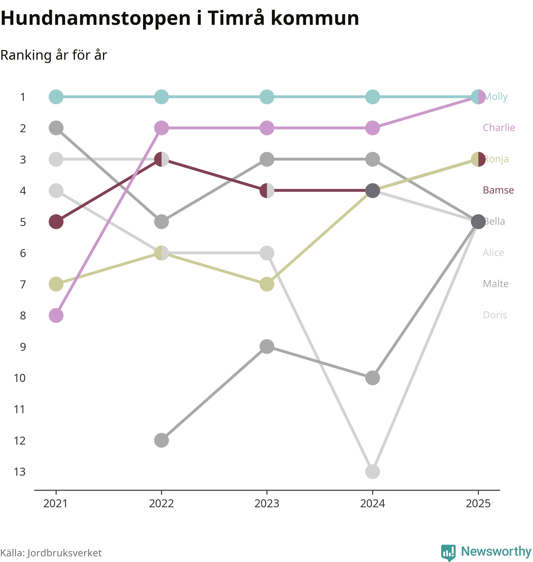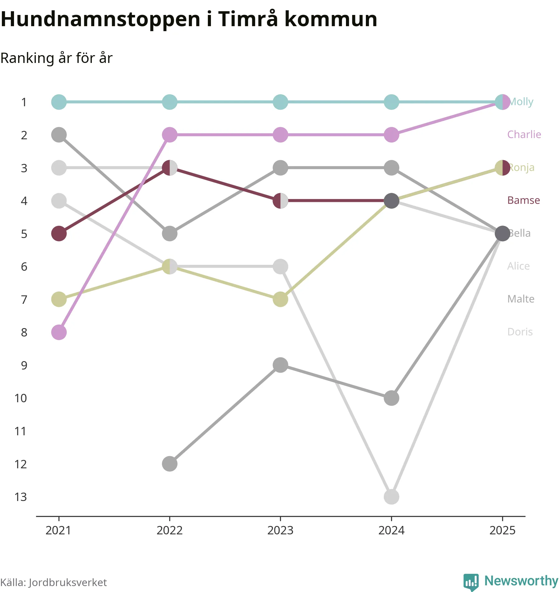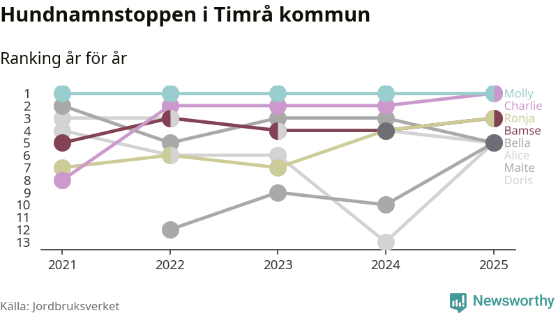 Molly är fortsatt ohotad etta bland hundnamnen i Sverige, följt av Bella och Charlie. Så har det sett ut flera år i rad, och även bland Timråhundarna ligger Molly i topp, tillsammans med Charlie.