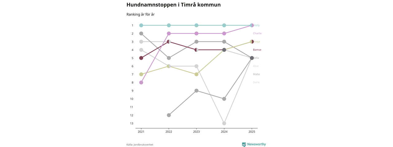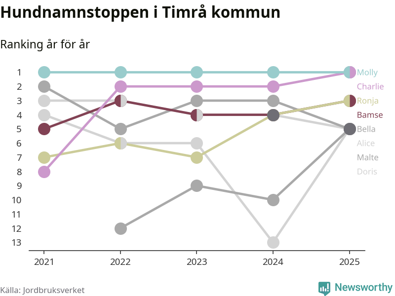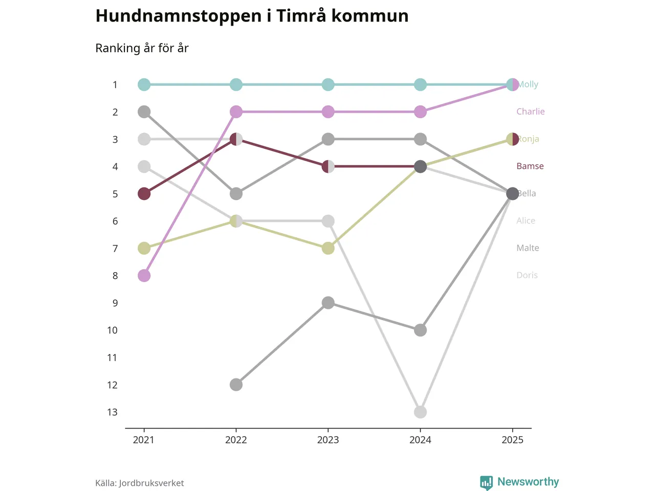 I hela landet är Molly det ohotat populäraste tilltalsnamnet för hundar sedan flera år, följt av Bella och Charlie. Något av de tre namnen toppar listan i 243 av 290 kommuner, och de har varit de vanligaste namnen sedan åtminstone 2018. Men det fjärde populäraste namnet, Doris, knappade in på ledartrion och kommer snart kunna utmana Charlie om tredjeplatsen, om trenden håller i sig.