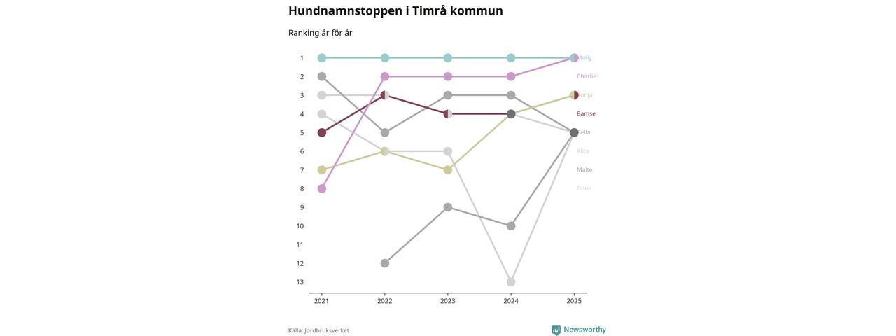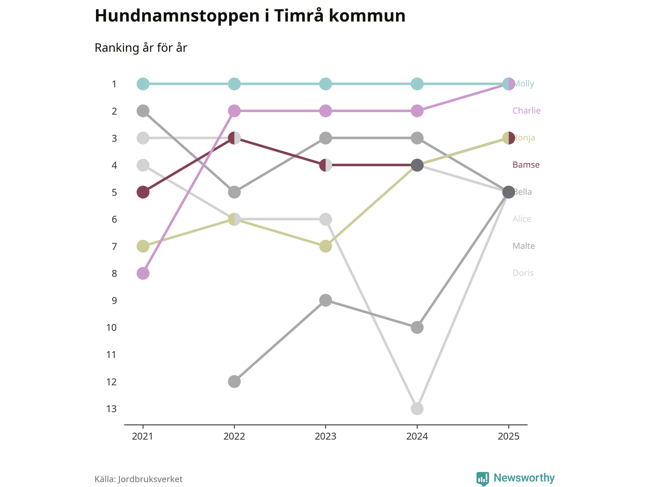 Malte och Doris klättrar på topplistan bland Timrås hundnamn, visar ny statistik från Jordbruksverkets hundregister.