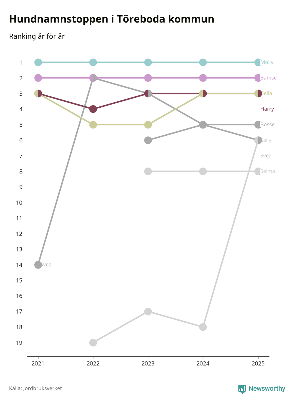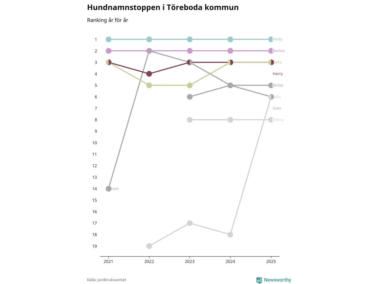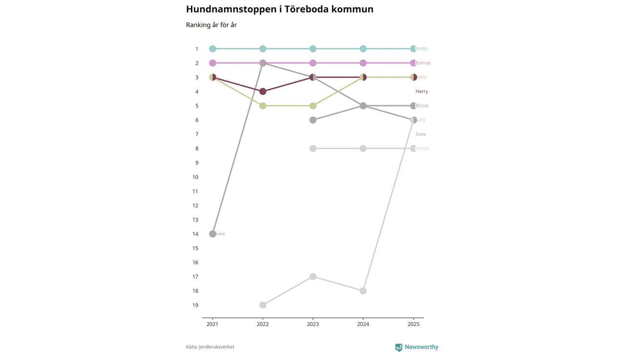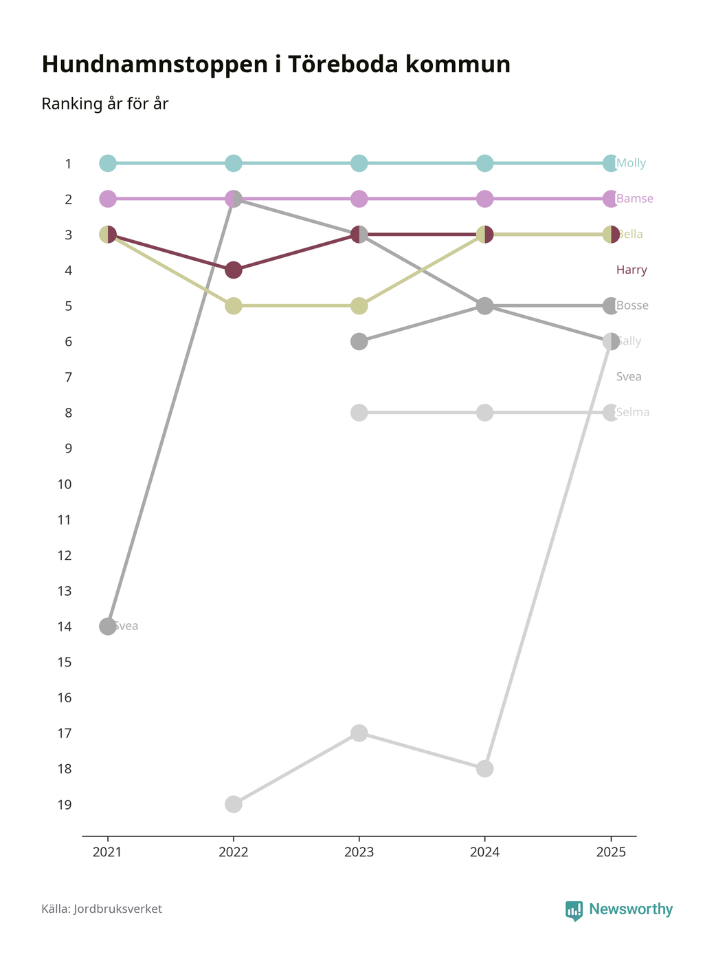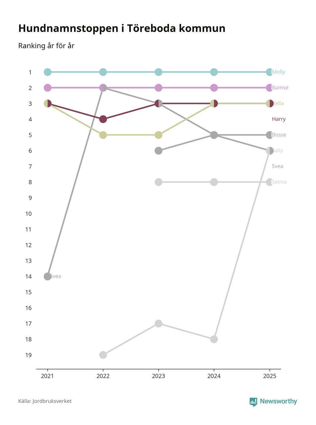 Molly toppar hundnamnsligan i Töreboda kommun, precis som i landet som helhet. Det visar färsk statistik från Jordbruksverket. Här finns hela topplistan för kommunen.