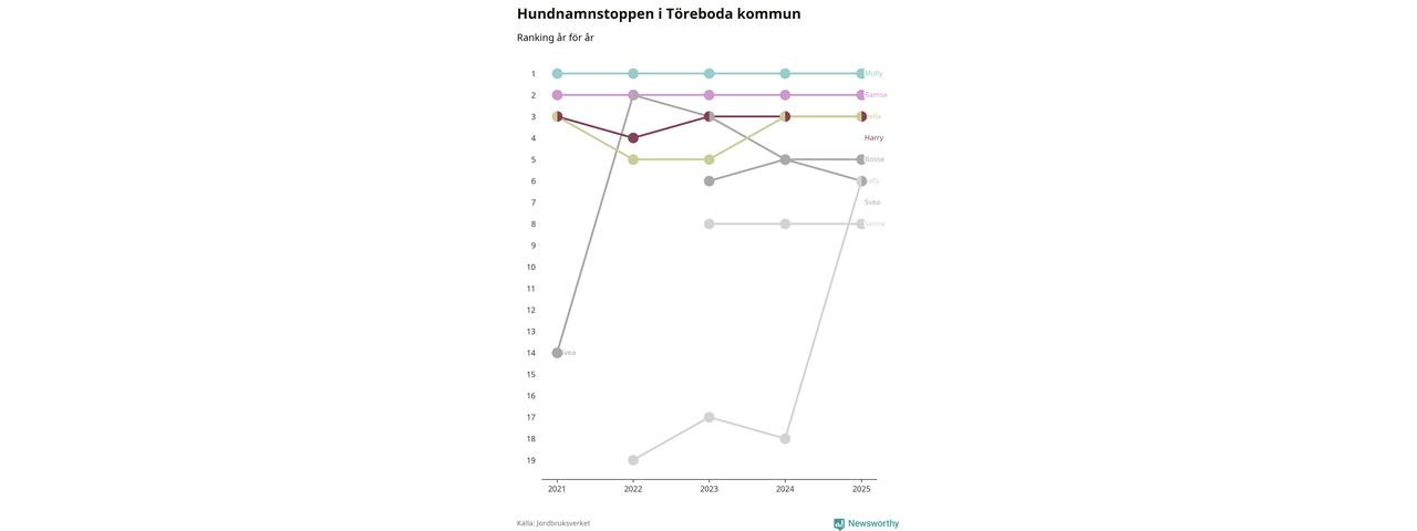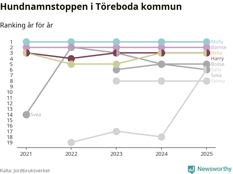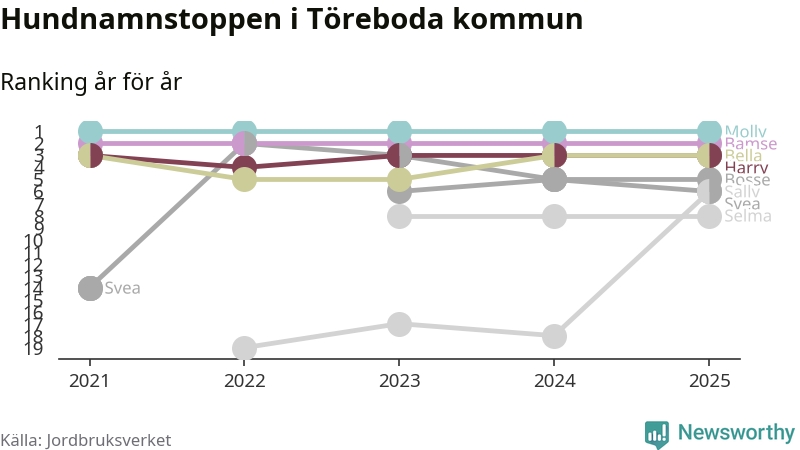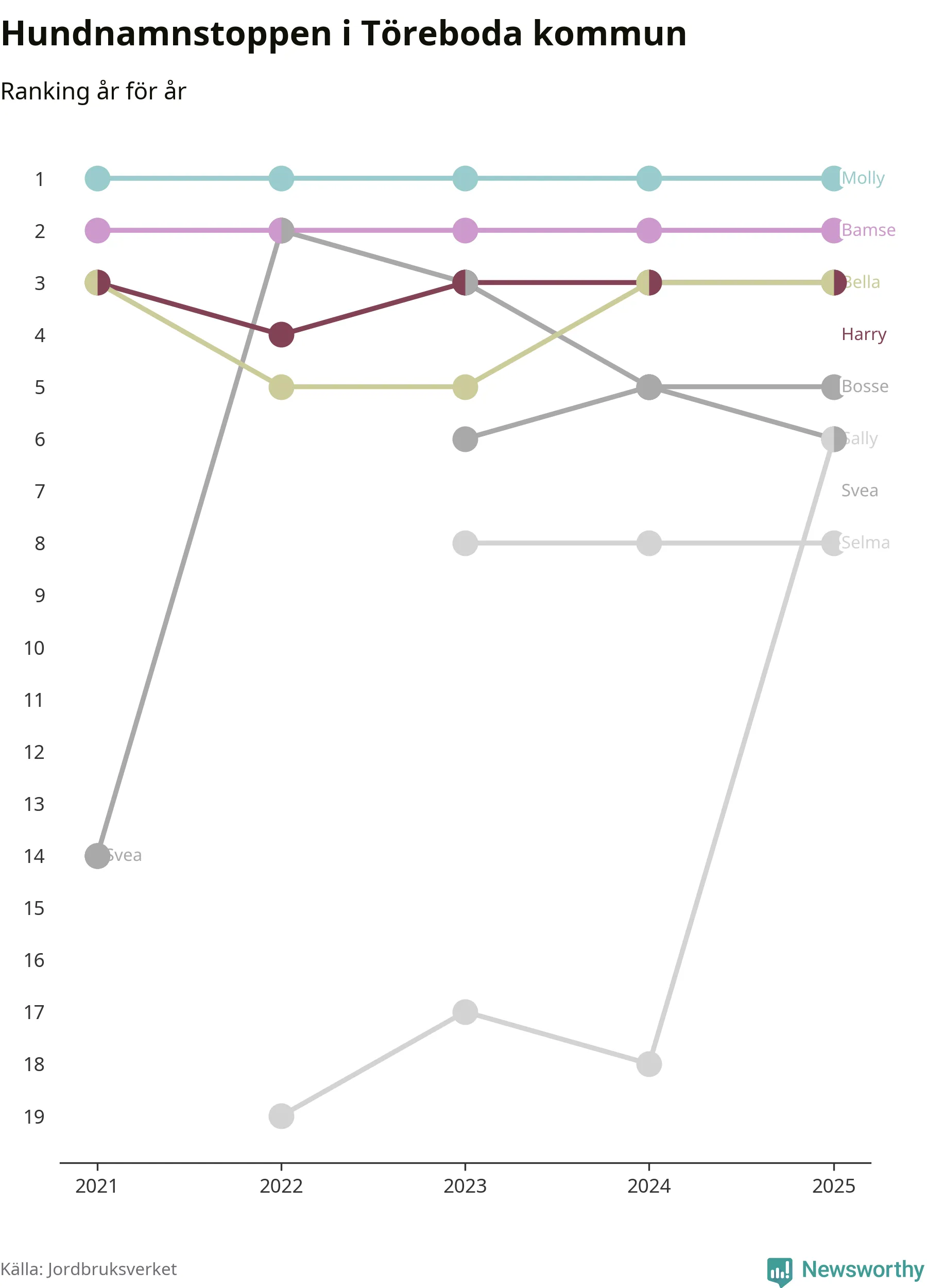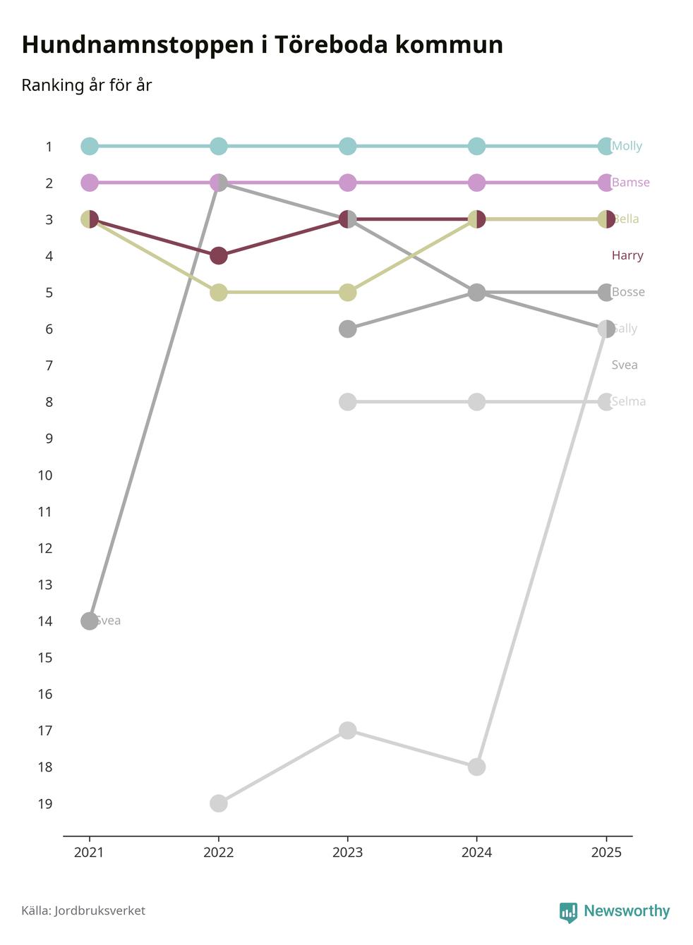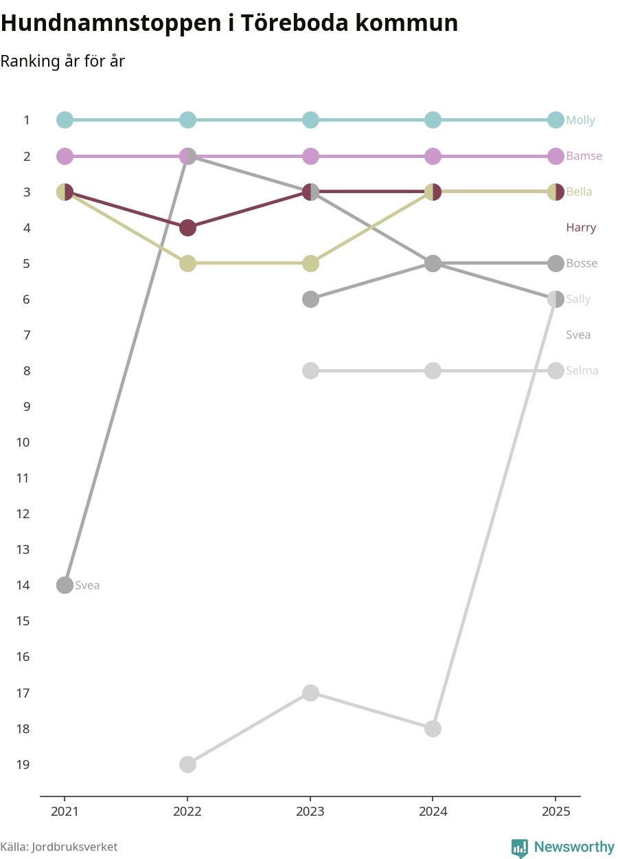 Molly toppar hundnamnsligan i Töreboda kommun, precis som i landet som helhet. Det visar färsk statistik från Jordbruksverket. Här finns hela topplistan för kommunen.