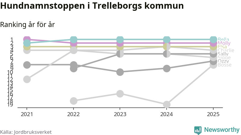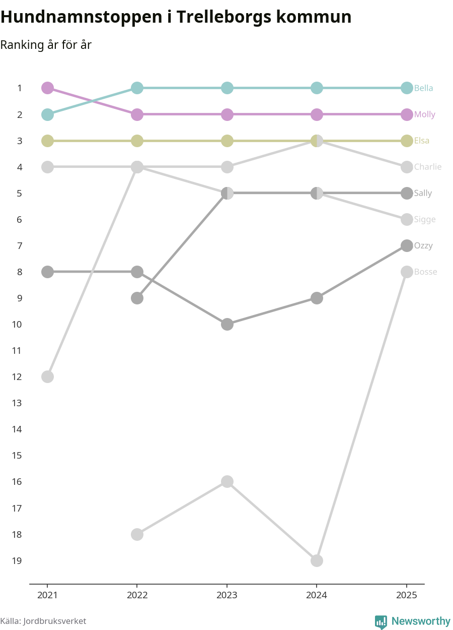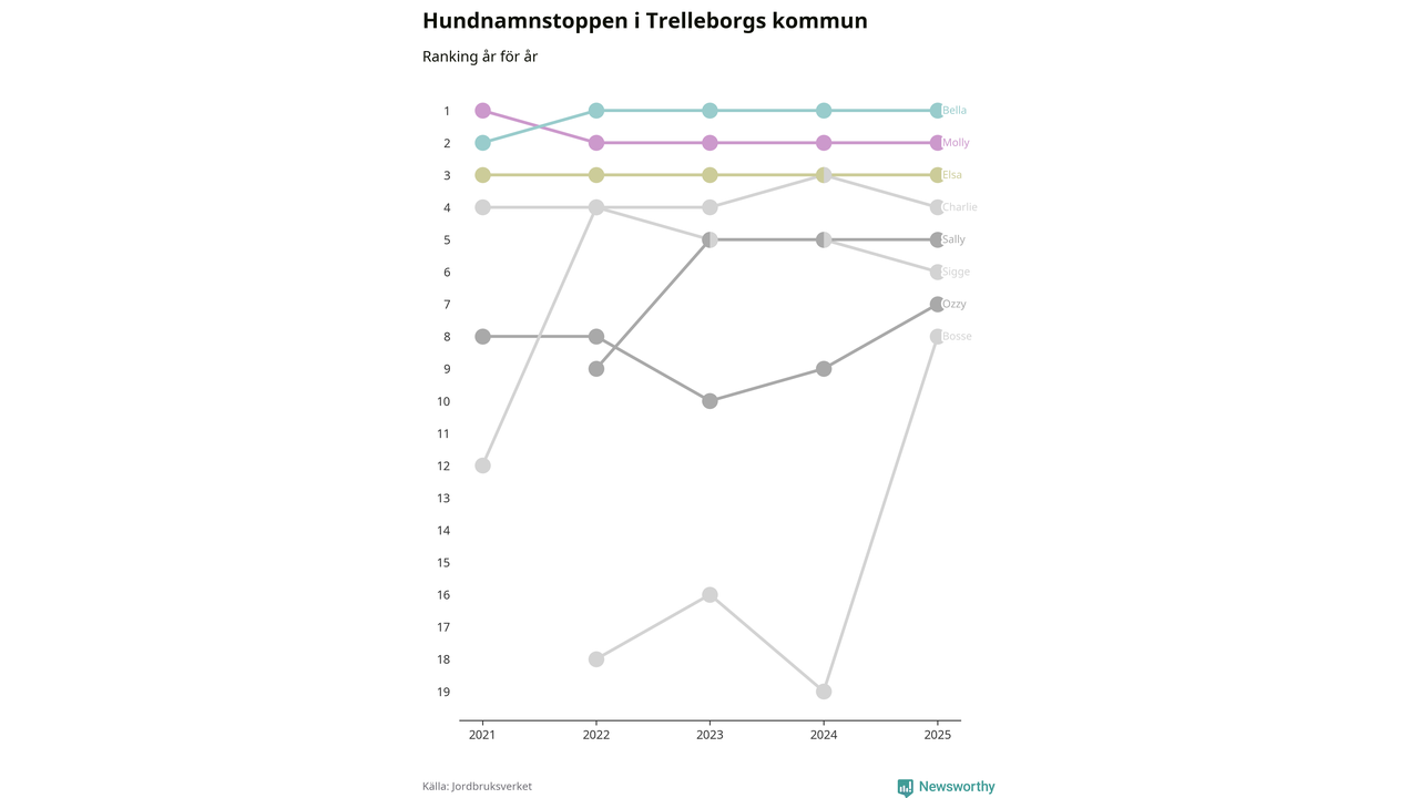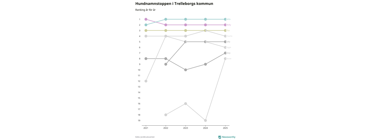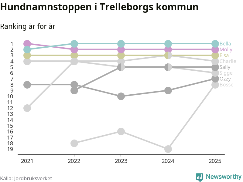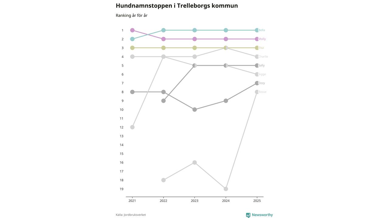Molly är fortsatt ohotad etta bland hundnamnen i Sverige, följt av Bella och Charlie. Så har det sett ut flera år i rad, men bland Trelleborgshundarna är Bella populärast.