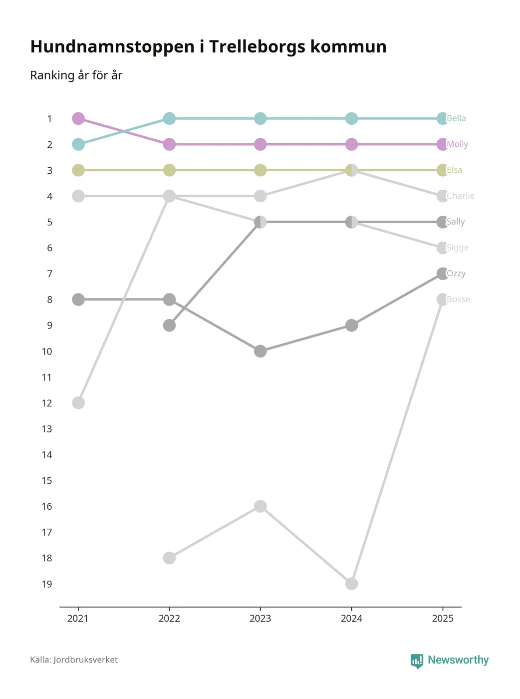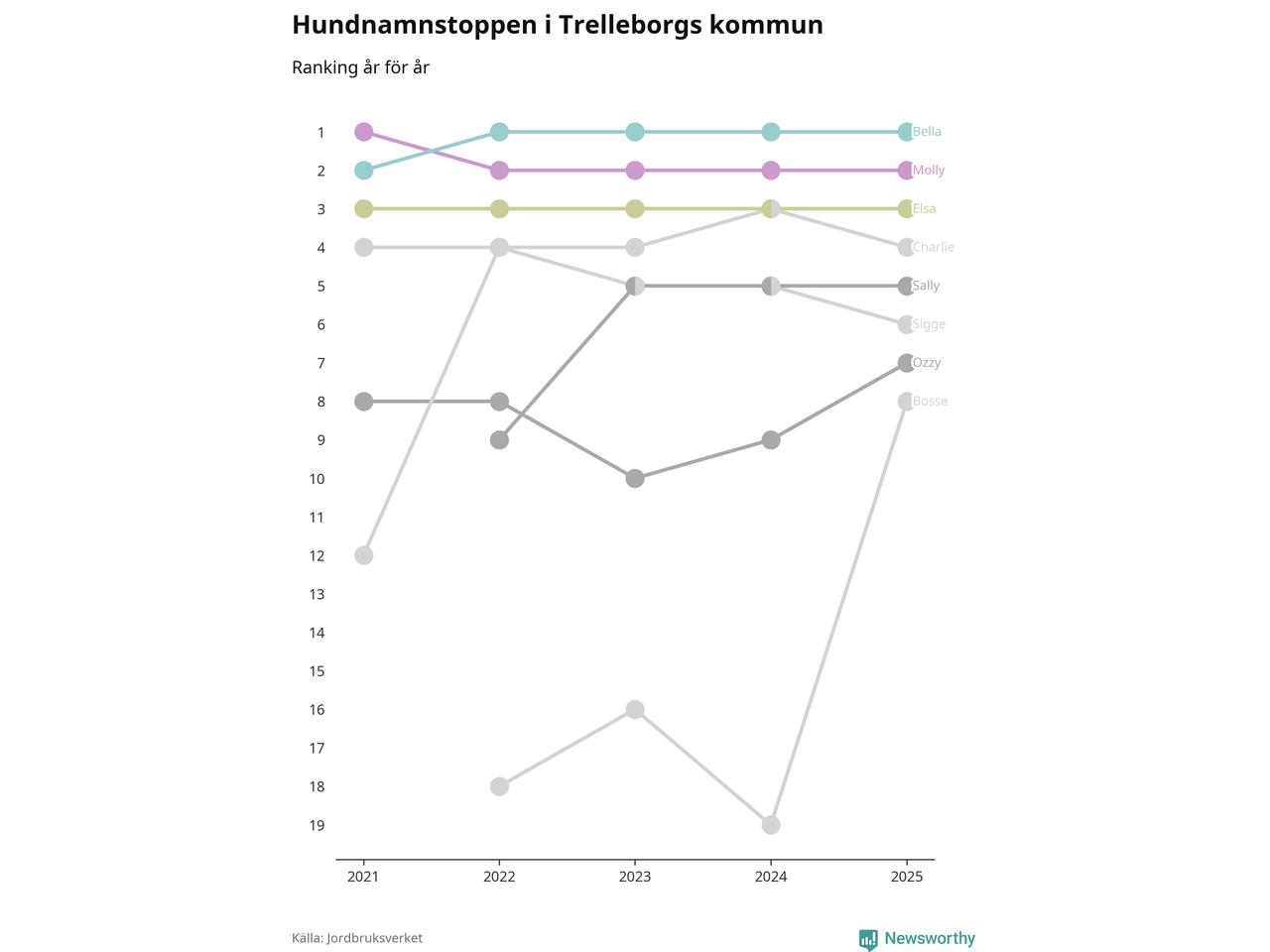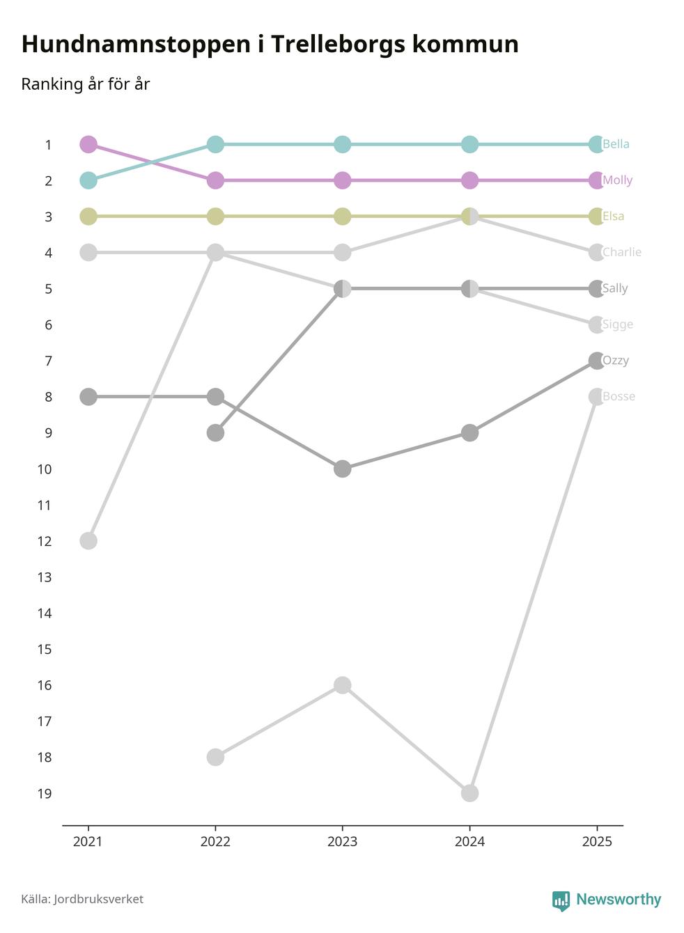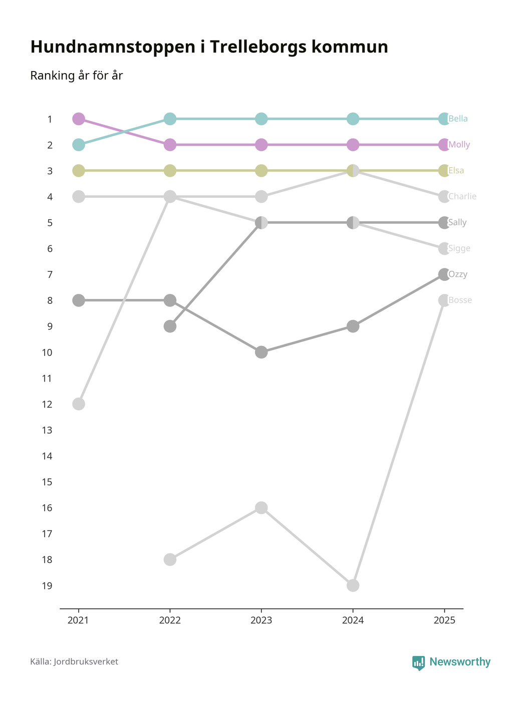 Molly är fortsatt ohotad etta bland hundnamnen i Sverige, följt av Bella och Charlie. Så har det sett ut flera år i rad, men bland Trelleborgshundarna är Bella populärast.