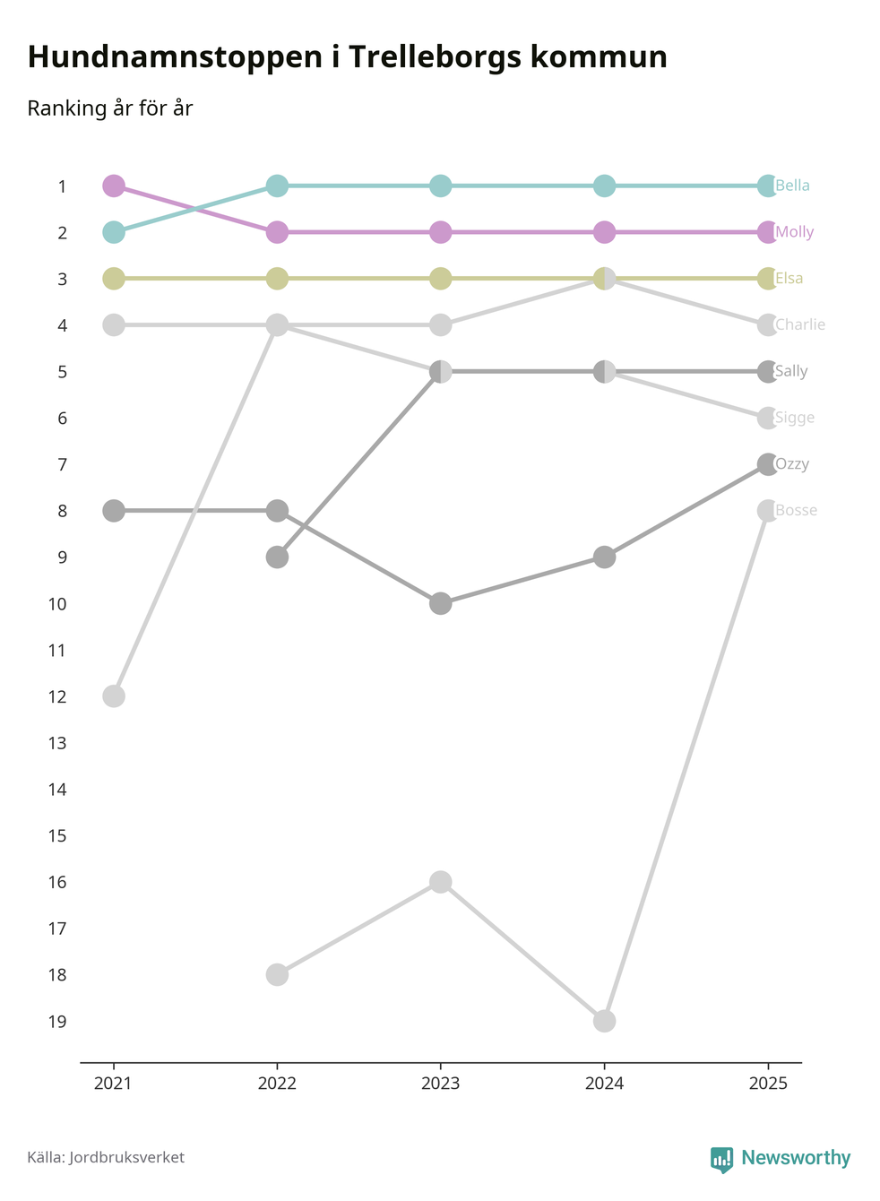 I hela landet är Molly det ohotat populäraste tilltalsnamnet för hundar sedan flera år, följt av Bella och Charlie. Något av de tre namnen toppar listan i 243 av 290 kommuner, och de har varit de vanligaste namnen sedan åtminstone 2018. Men det fjärde populäraste namnet, Doris, knappade in på ledartrion och kommer snart kunna utmana Charlie om tredjeplatsen, om trenden håller i sig.