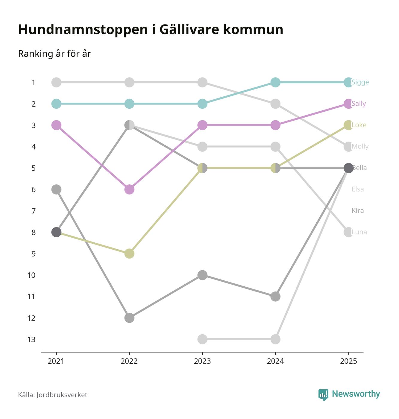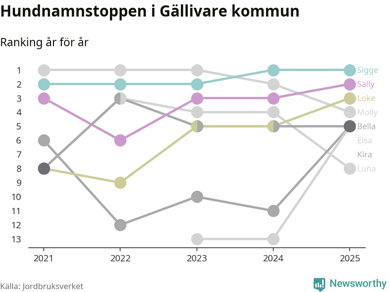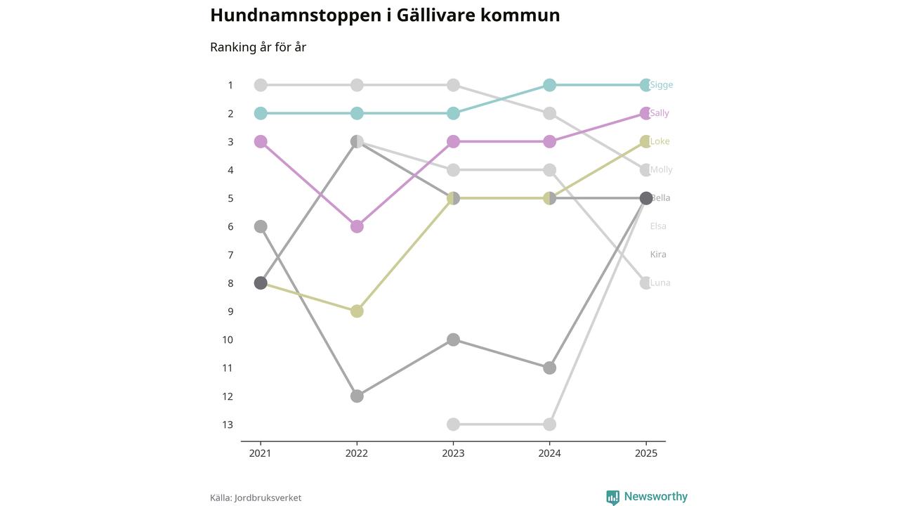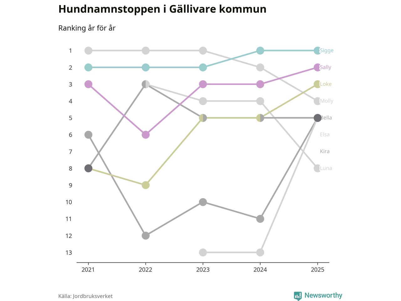 Molly är fortsatt ohotad etta bland hundnamnen i Sverige, följt av Bella och Charlie. Så har det sett ut flera år i rad, men bland Gällivarehundarna är Sigge populärast. Gällivare är en av 14 kommuner i landet där Sigge är vanligast, eller på delad förstaplats.