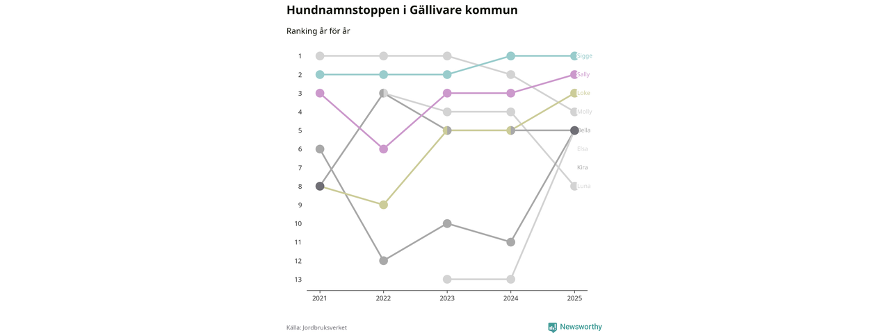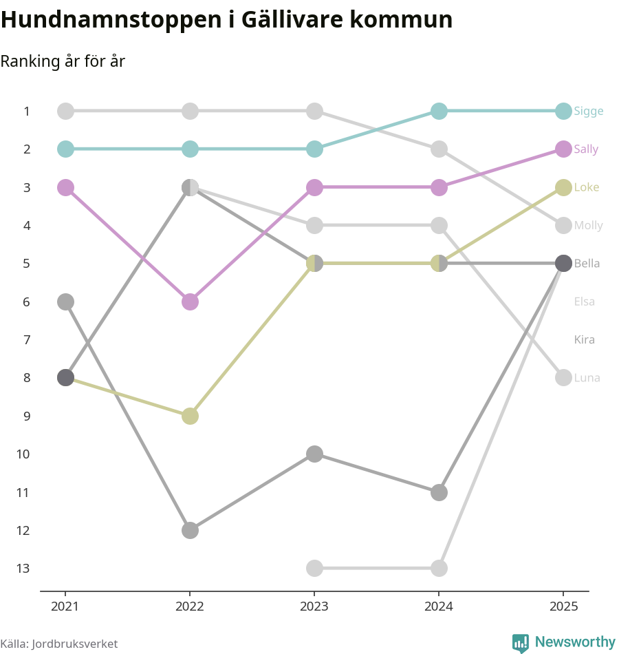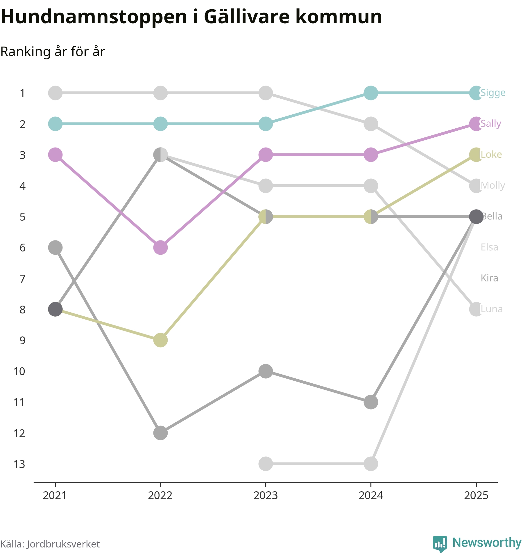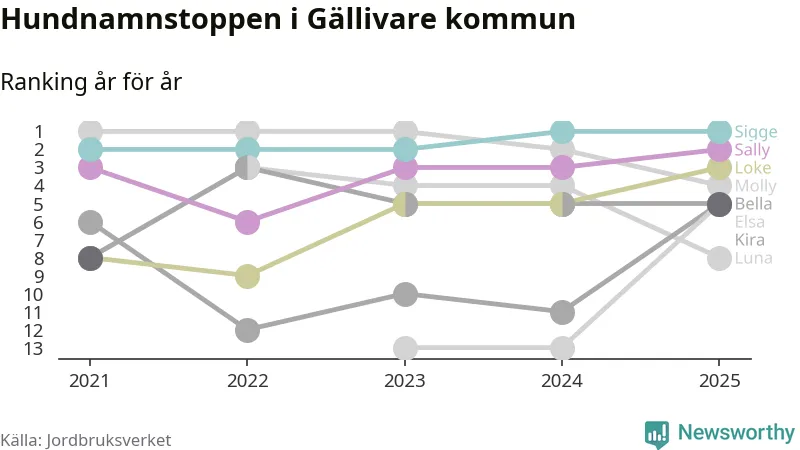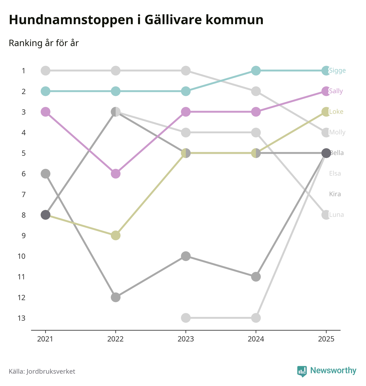 Molly är fortsatt ohotad etta bland hundnamnen i Sverige, följt av Bella och Charlie. Så har det sett ut flera år i rad, men bland Gällivarehundarna är Sigge populärast. Gällivare är en av 14 kommuner i landet där Sigge är vanligast, eller på delad förstaplats.