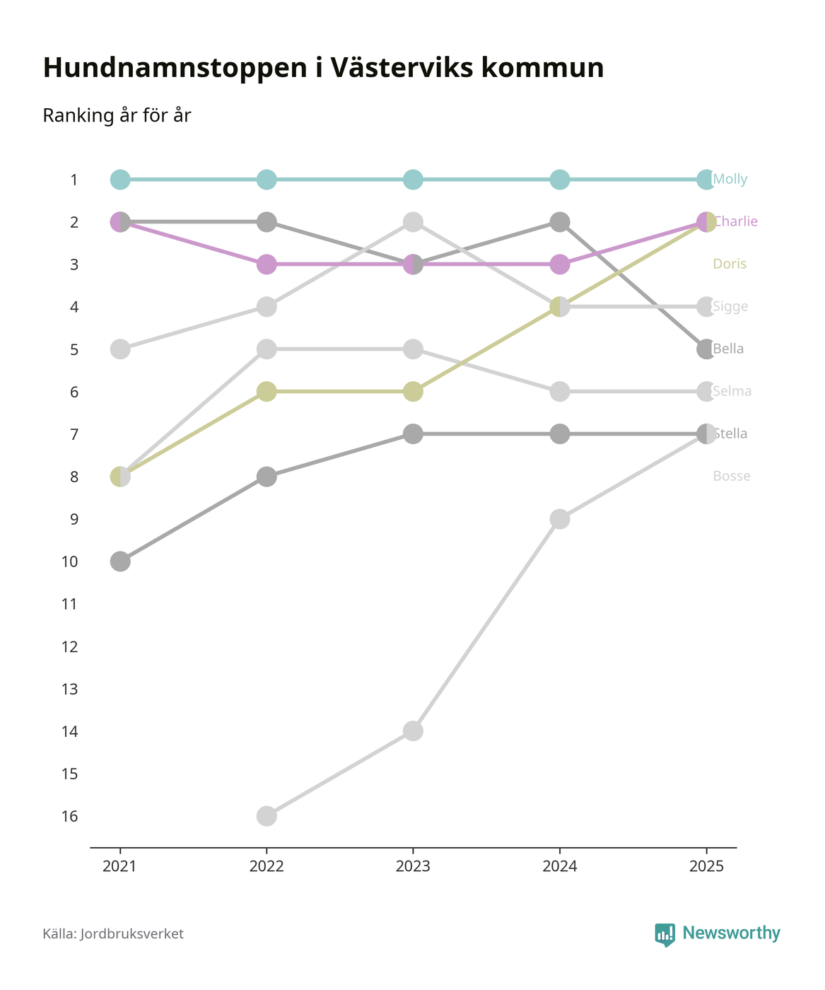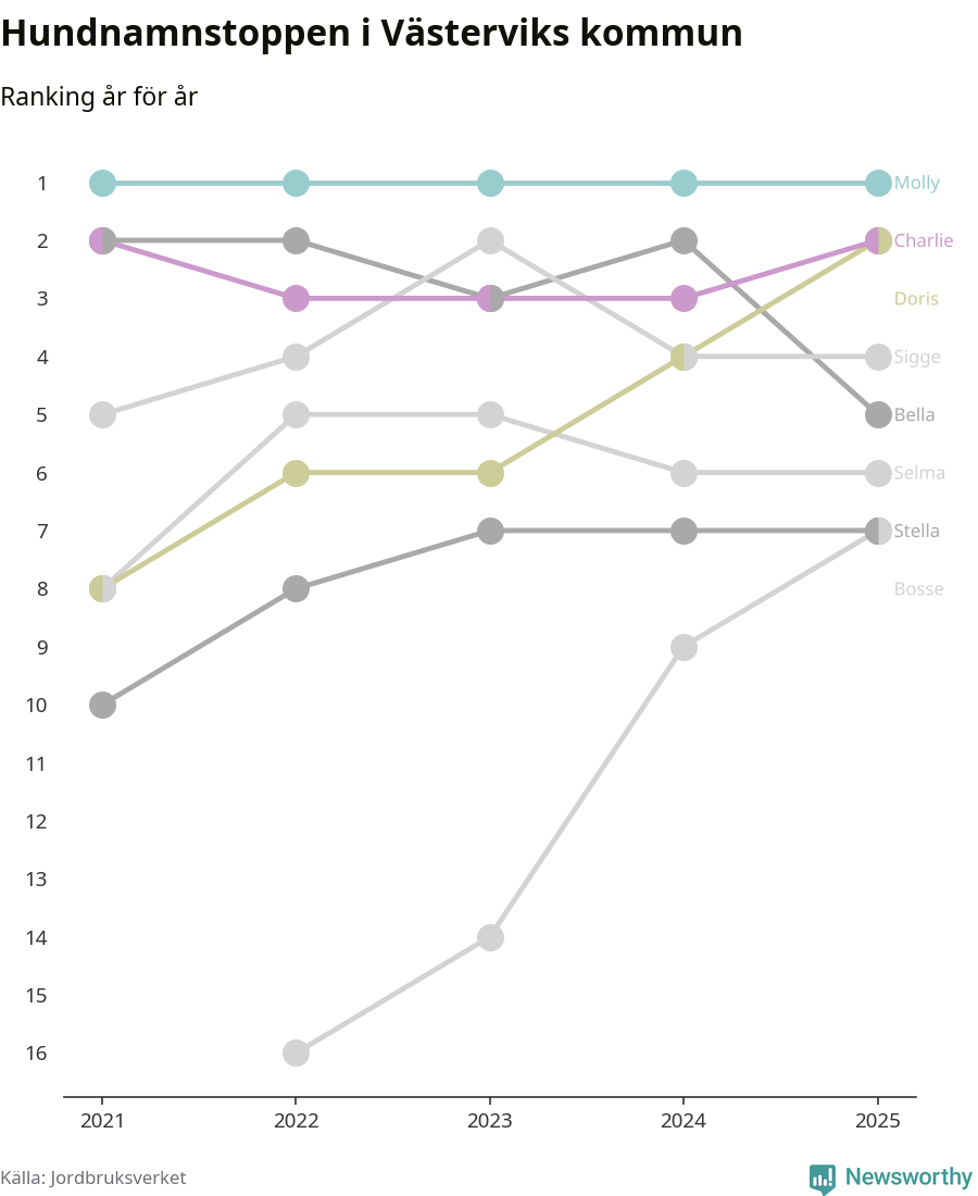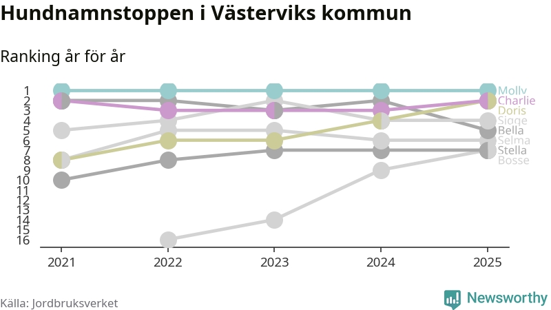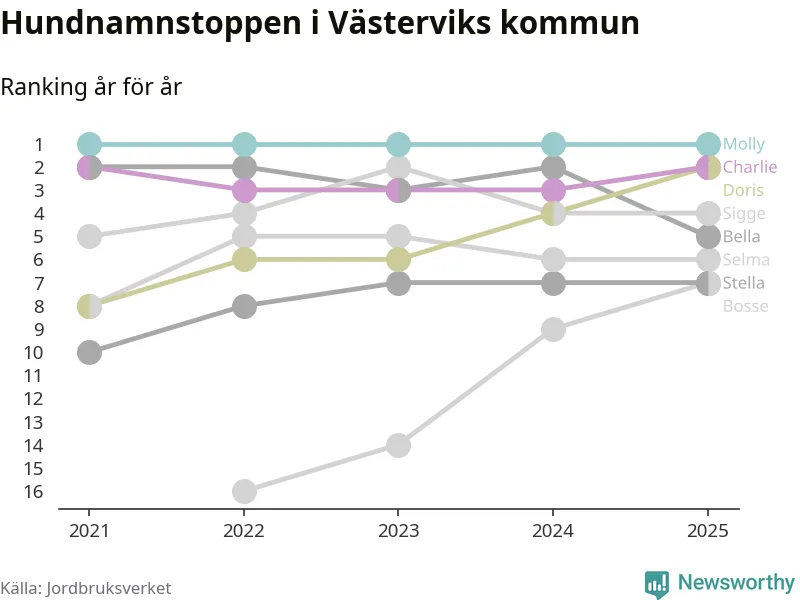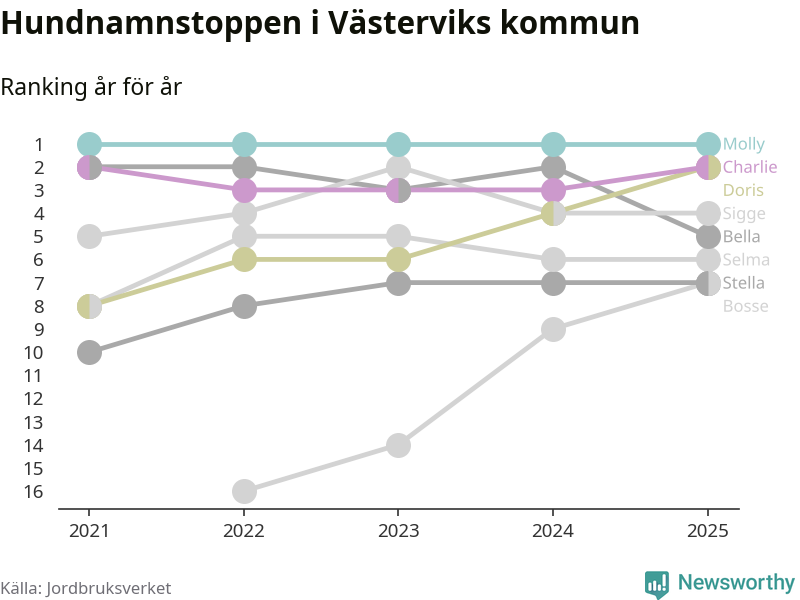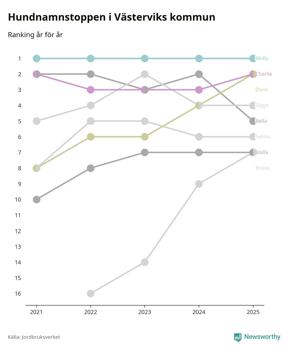 I hela landet är Molly det ohotat populäraste tilltalsnamnet för hundar sedan flera år, följt av Bella och Charlie. Något av de tre namnen toppar listan i 243 av 290 kommuner, och de har varit de vanligaste namnen sedan åtminstone 2018. Men det fjärde populäraste namnet, Doris, knappade in på ledartrion och kommer snart kunna utmana Charlie om tredjeplatsen, om trenden håller i sig.