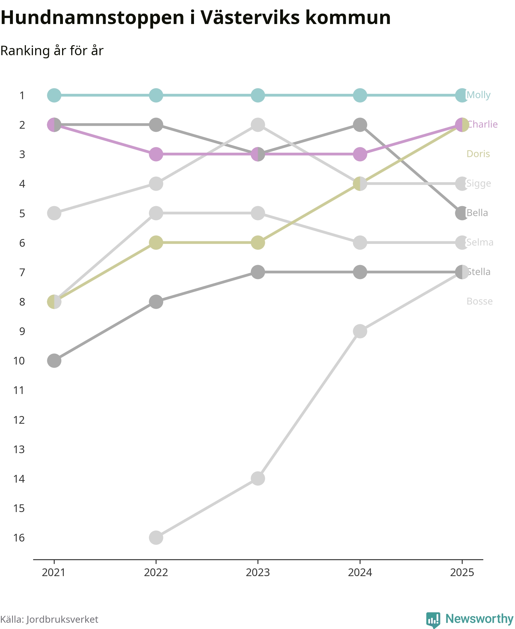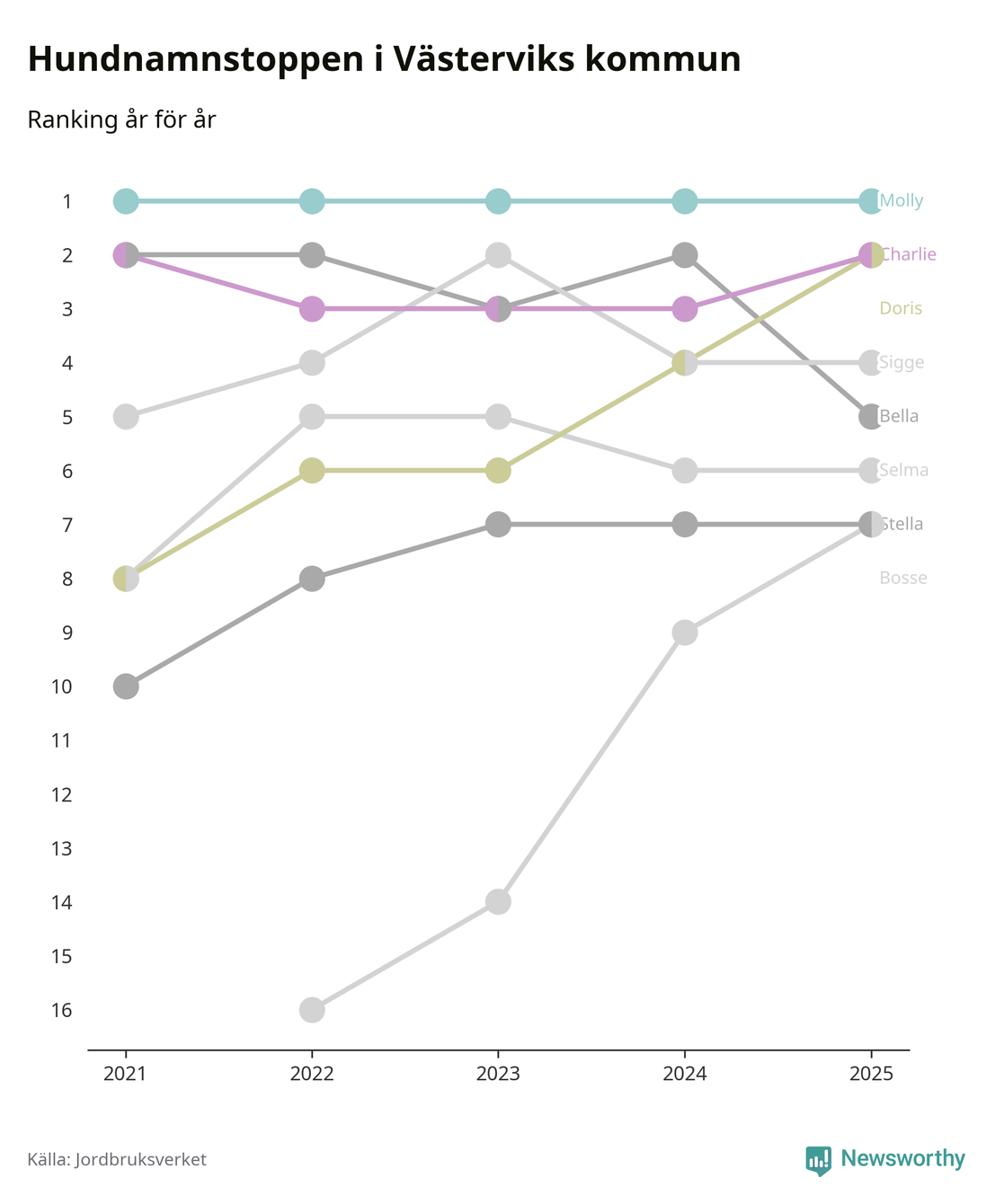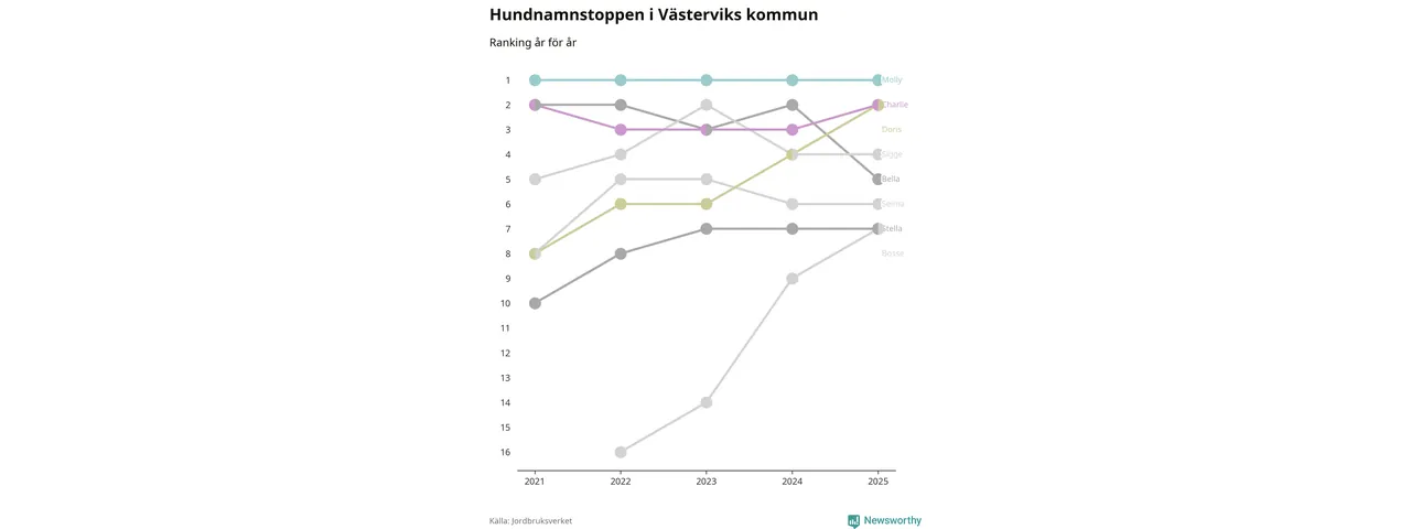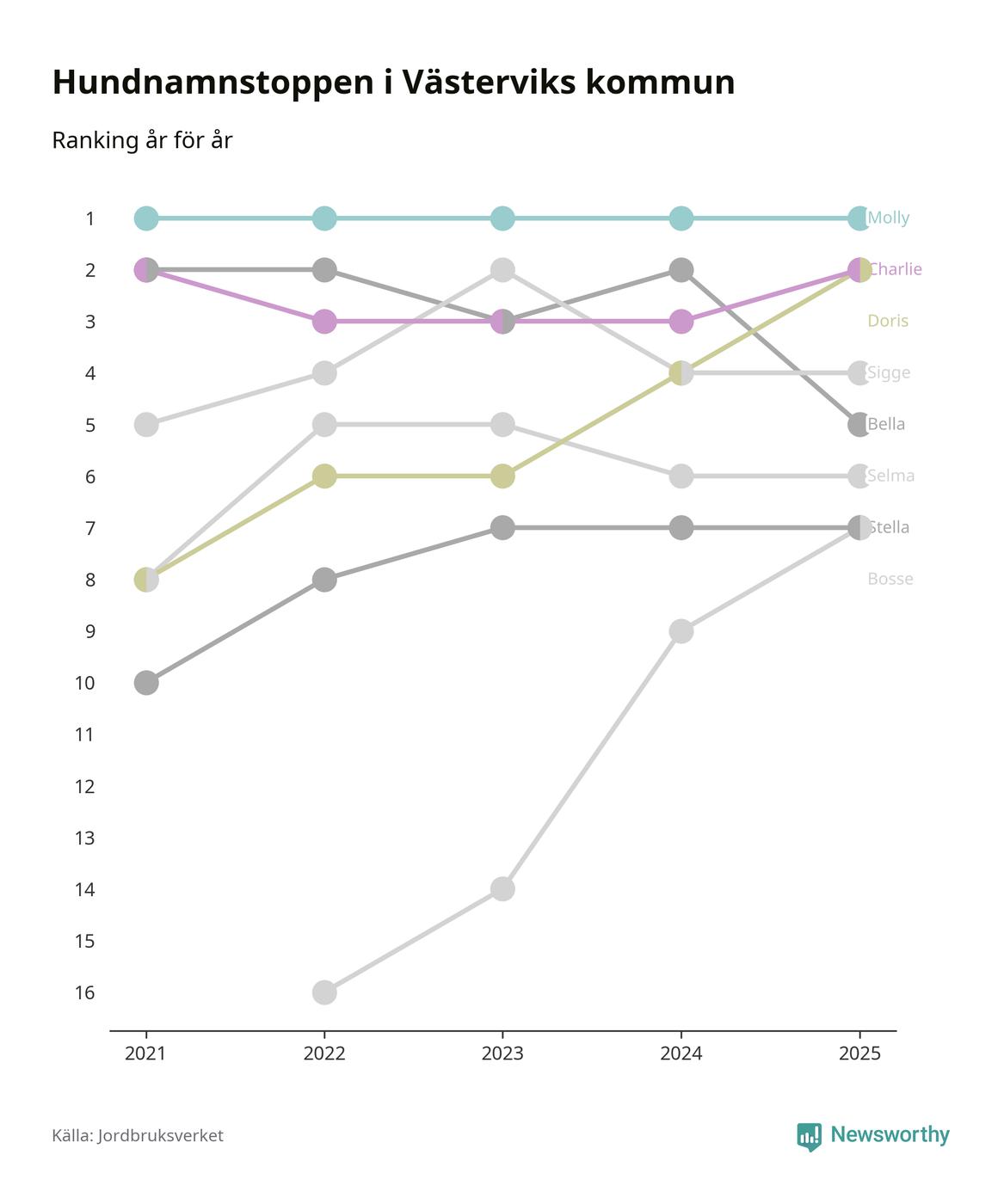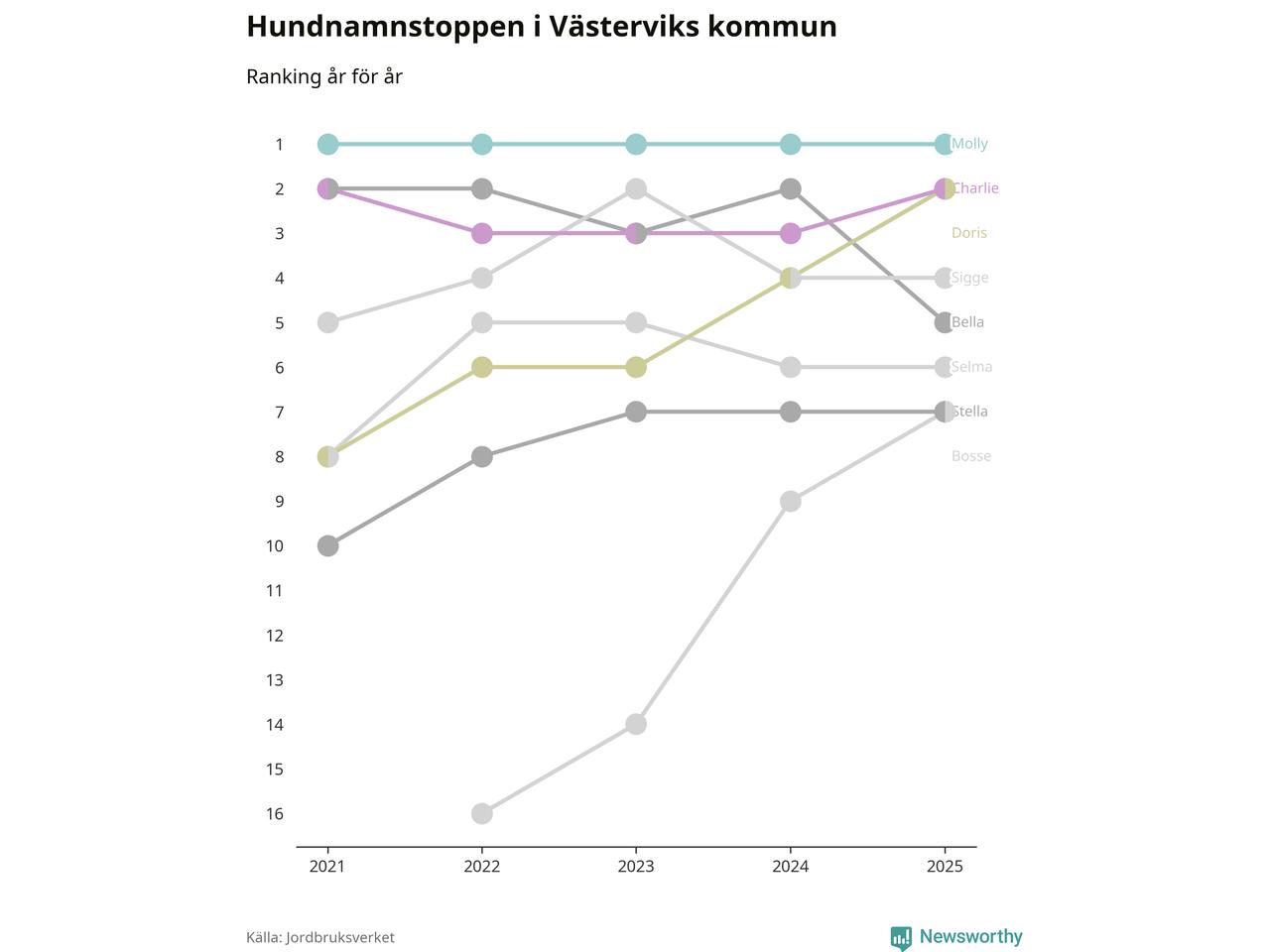 Molly är fortsatt ohotad etta bland hundnamnen i Sverige, följt av Bella och Charlie. Så har det sett ut flera år i rad, och även bland Västervikshundarna ligger Molly i topp.