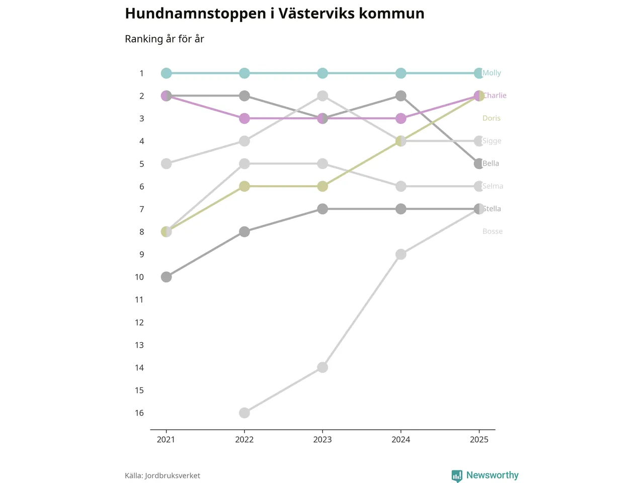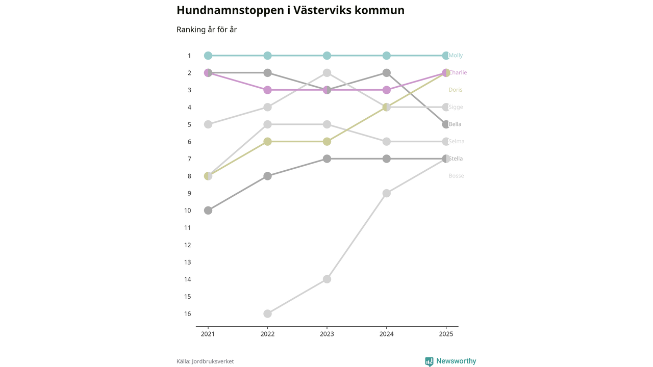 Molly toppar hundnamnsligan i Västerviks kommun, precis som i landet som helhet. Men ett namn på topplistan utmärker sig som ovanligt vanligt: Märta. Det visar färsk statistik från Jordbruksverket.
