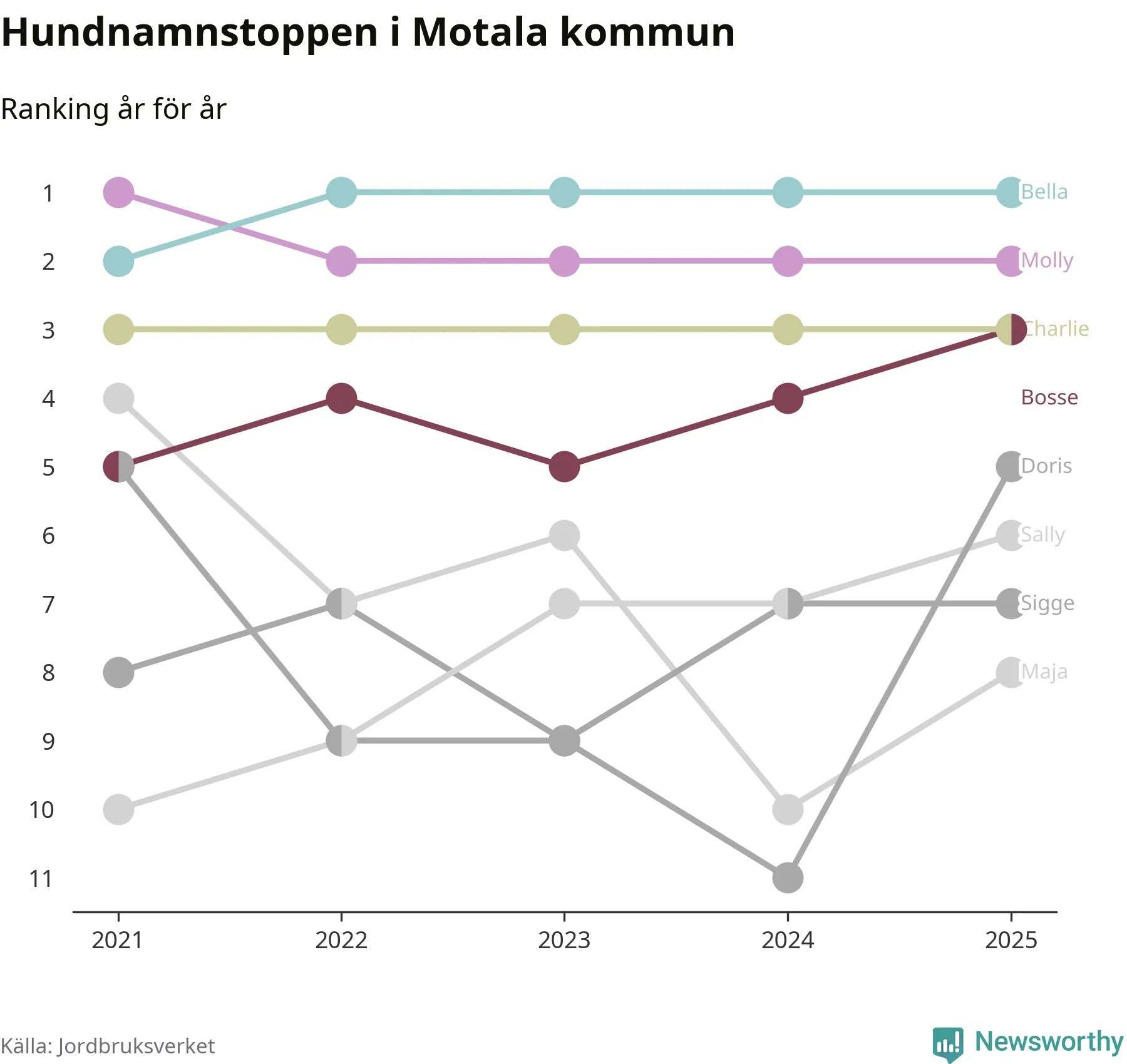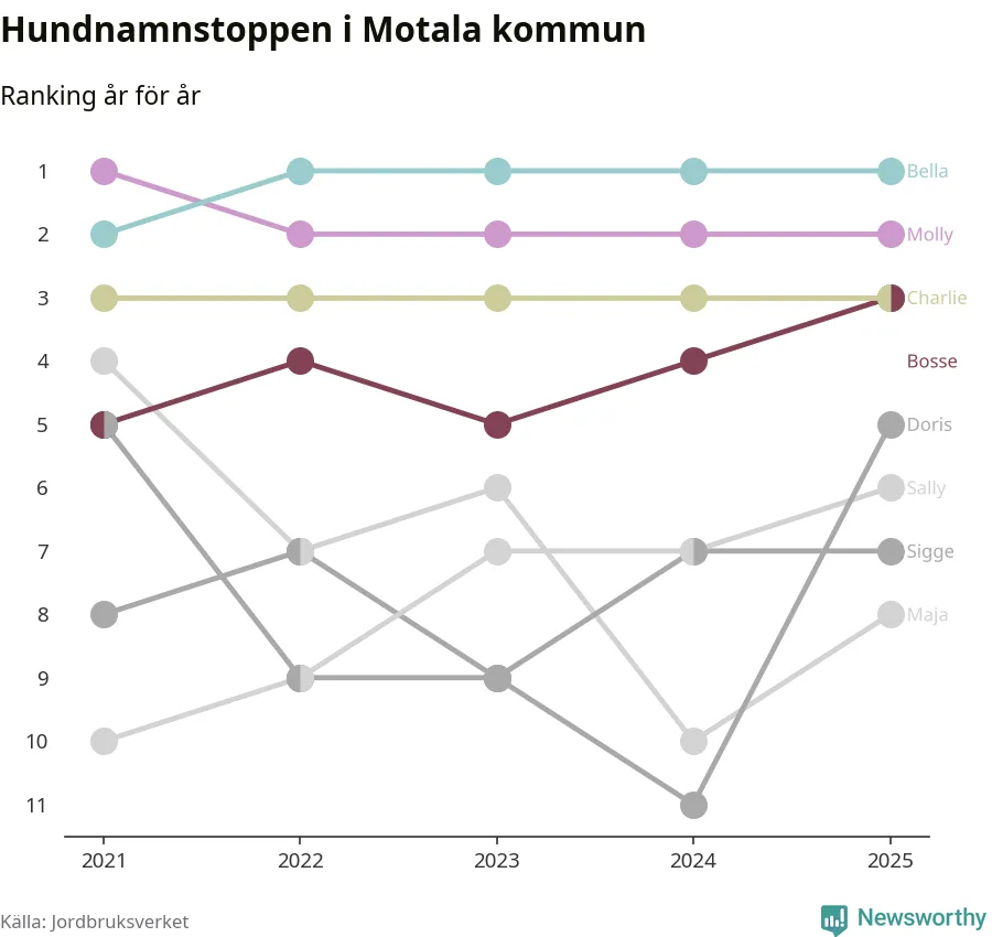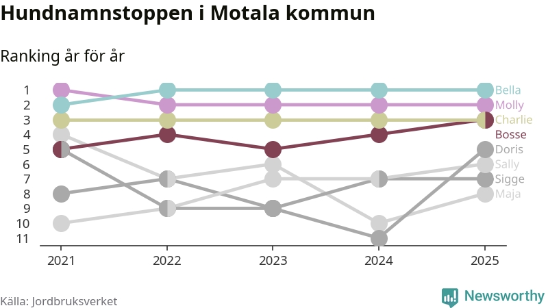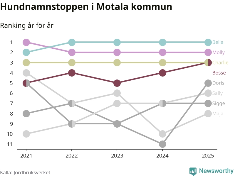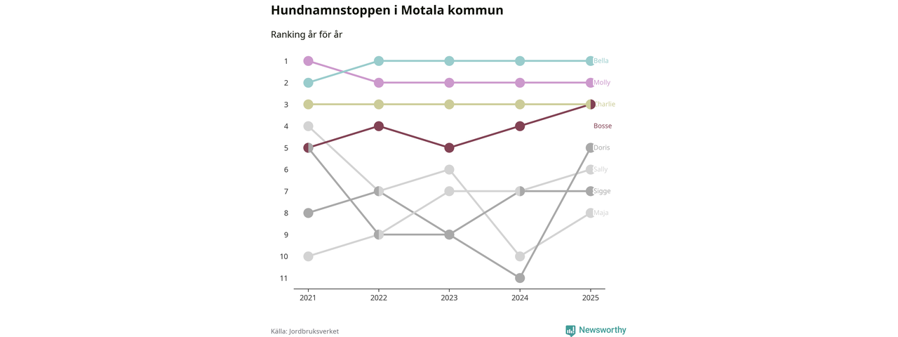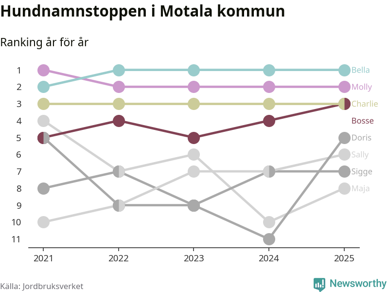 I hela landet är Molly det ohotat populäraste tilltalsnamnet för hundar sedan flera år, följt av Bella och Charlie. Något av de tre namnen toppar listan i 243 av 290 kommuner, och de har varit de vanligaste namnen sedan åtminstone 2018. Men det fjärde populäraste namnet, Doris, knappade in på ledartrion och kommer snart kunna utmana Charlie om tredjeplatsen, om trenden håller i sig.