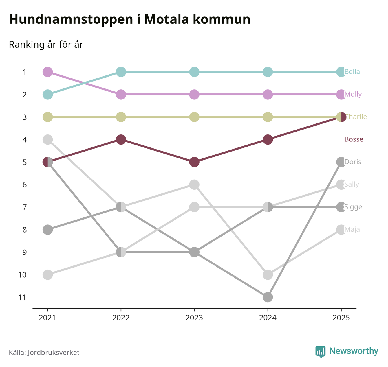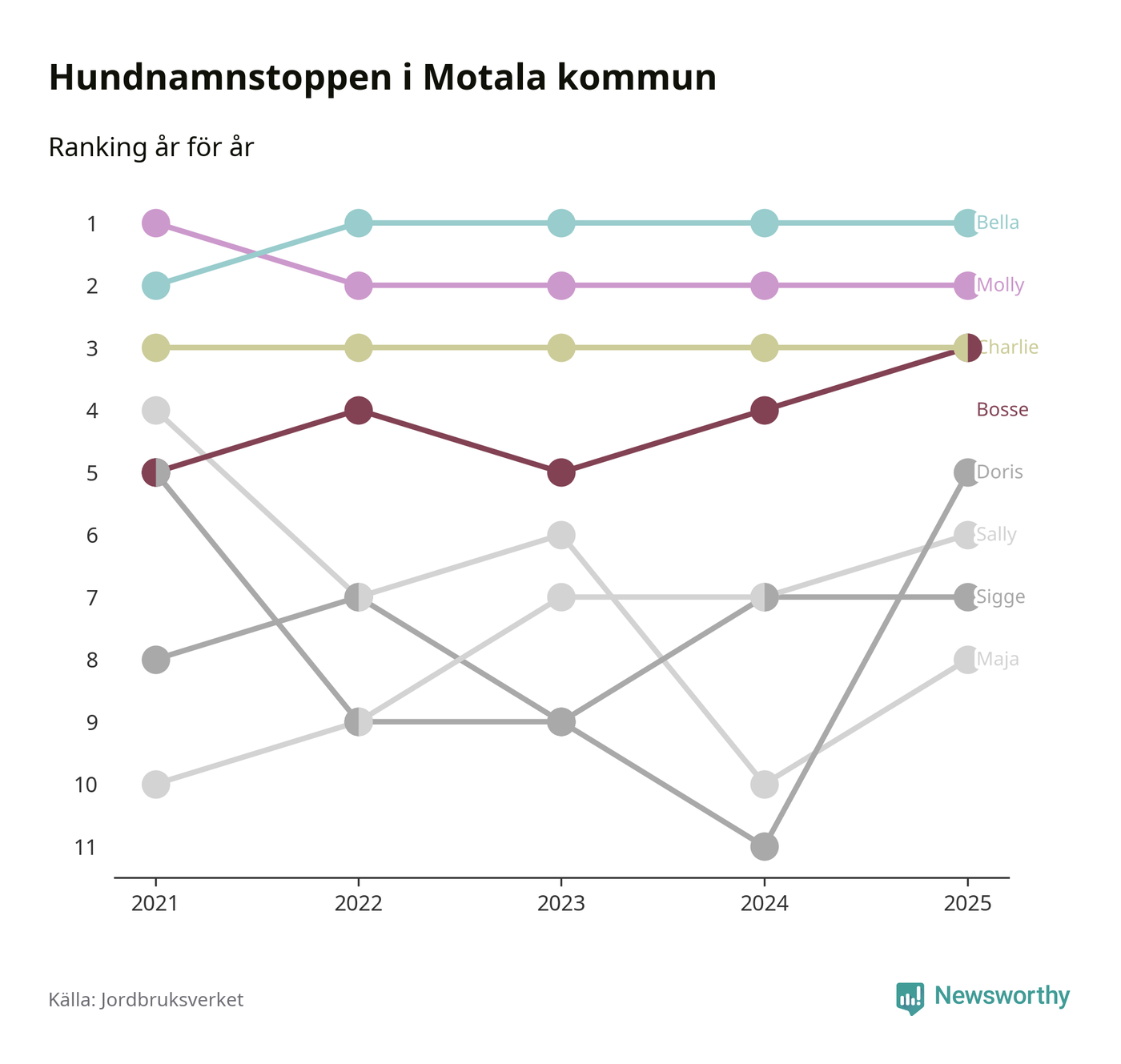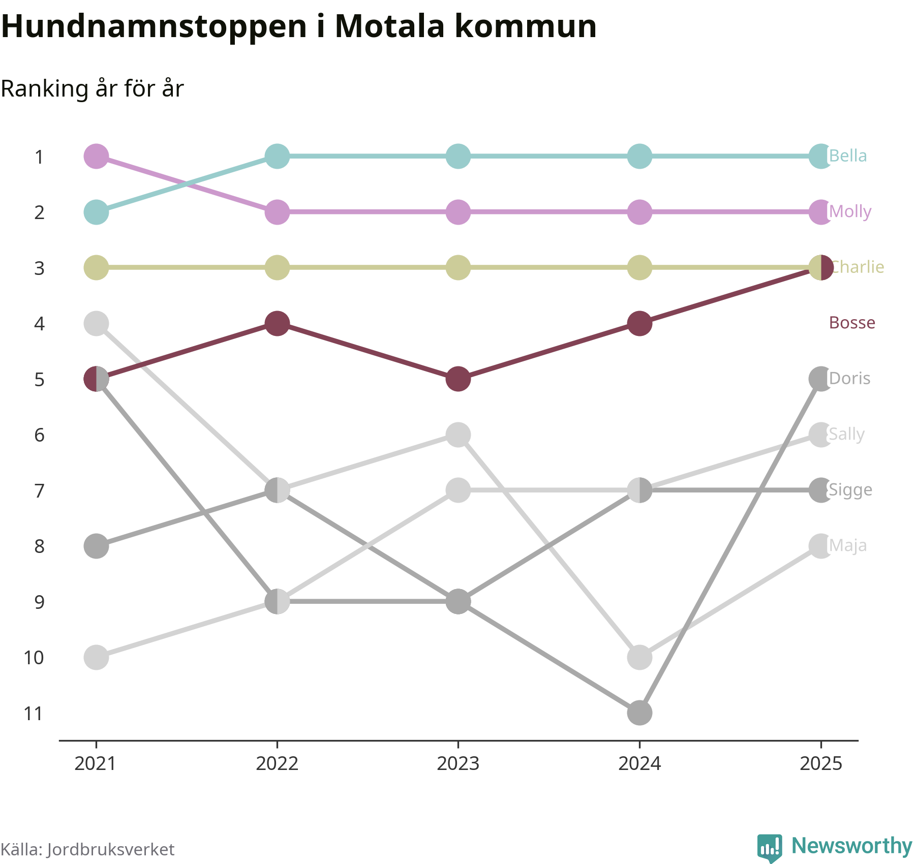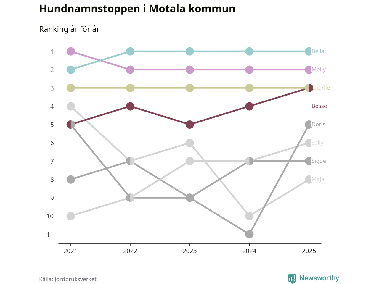 I hela landet är Molly det ohotat populäraste tilltalsnamnet för hundar sedan flera år, följt av Bella och Charlie. Något av de tre namnen toppar listan i 243 av 290 kommuner, och de har varit de vanligaste namnen sedan åtminstone 2018. Men det fjärde populäraste namnet, Doris, knappade in på ledartrion och kommer snart kunna utmana Charlie om tredjeplatsen, om trenden håller i sig.