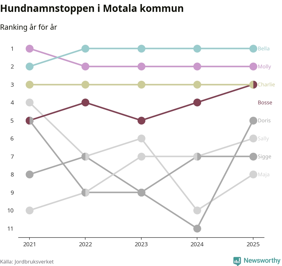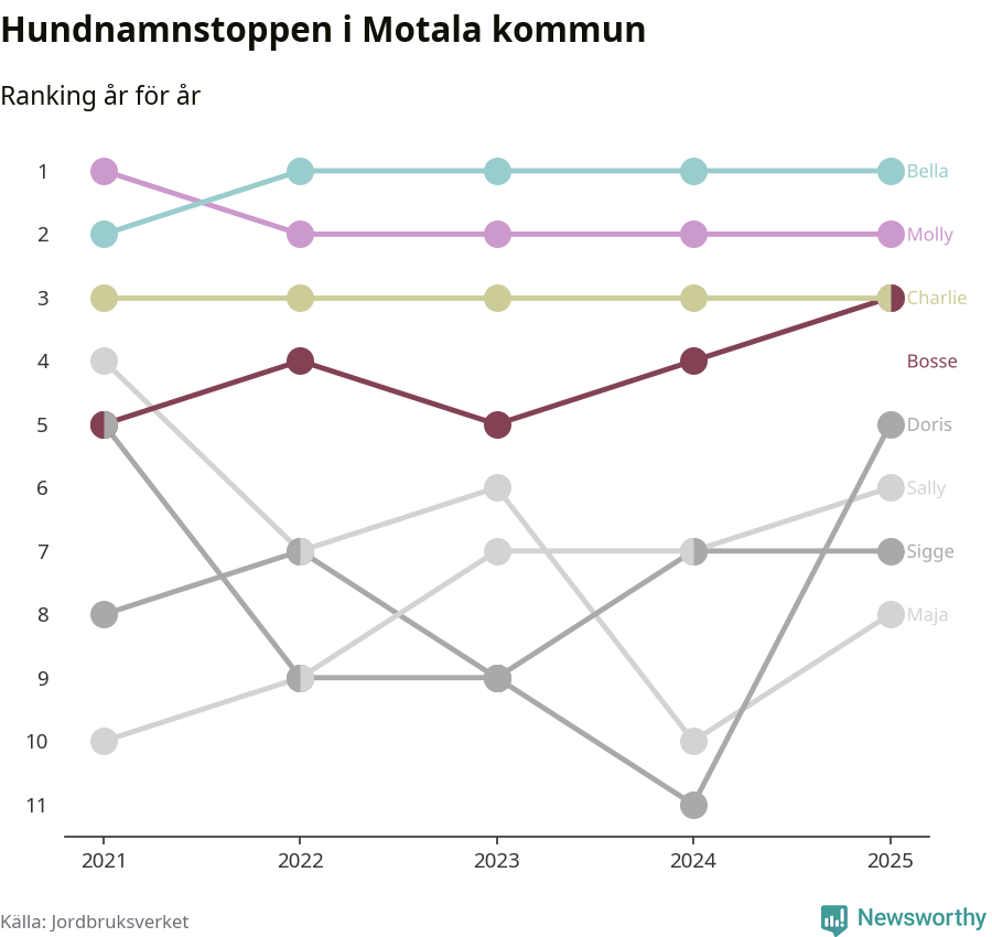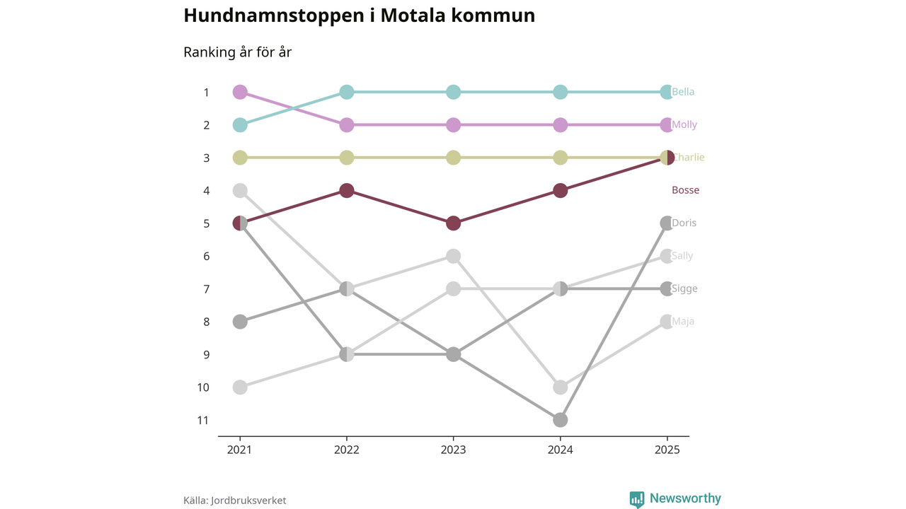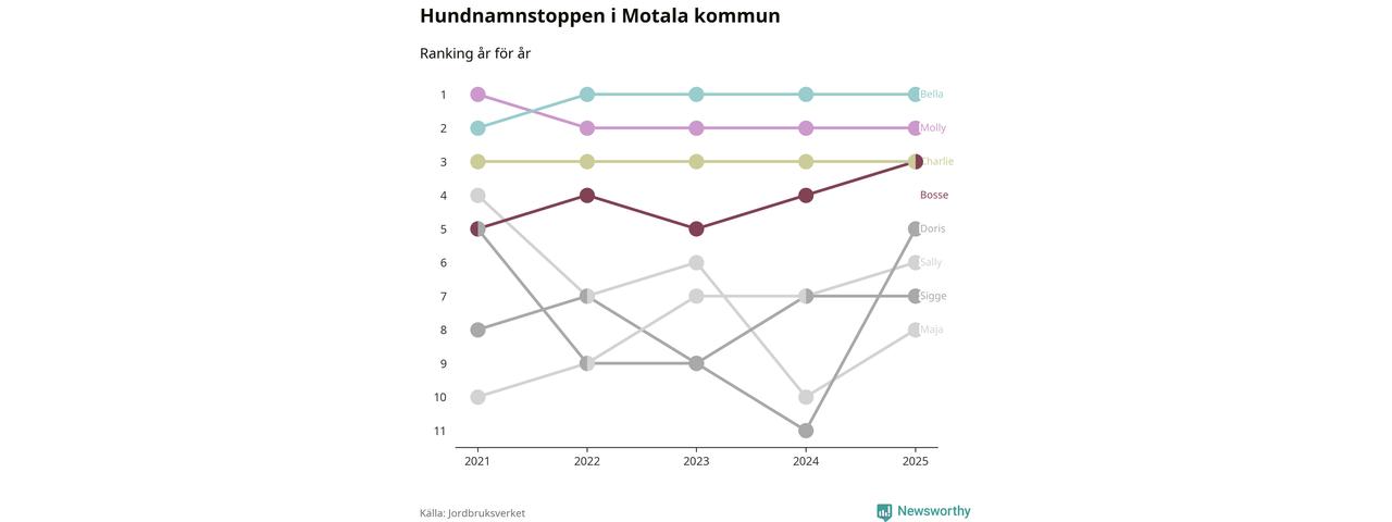 Molly är fortsatt ohotad etta bland hundnamnen i Sverige, följt av Bella och Charlie. Så har det sett ut flera år i rad, men bland Motalahundarna är Bella populärast.