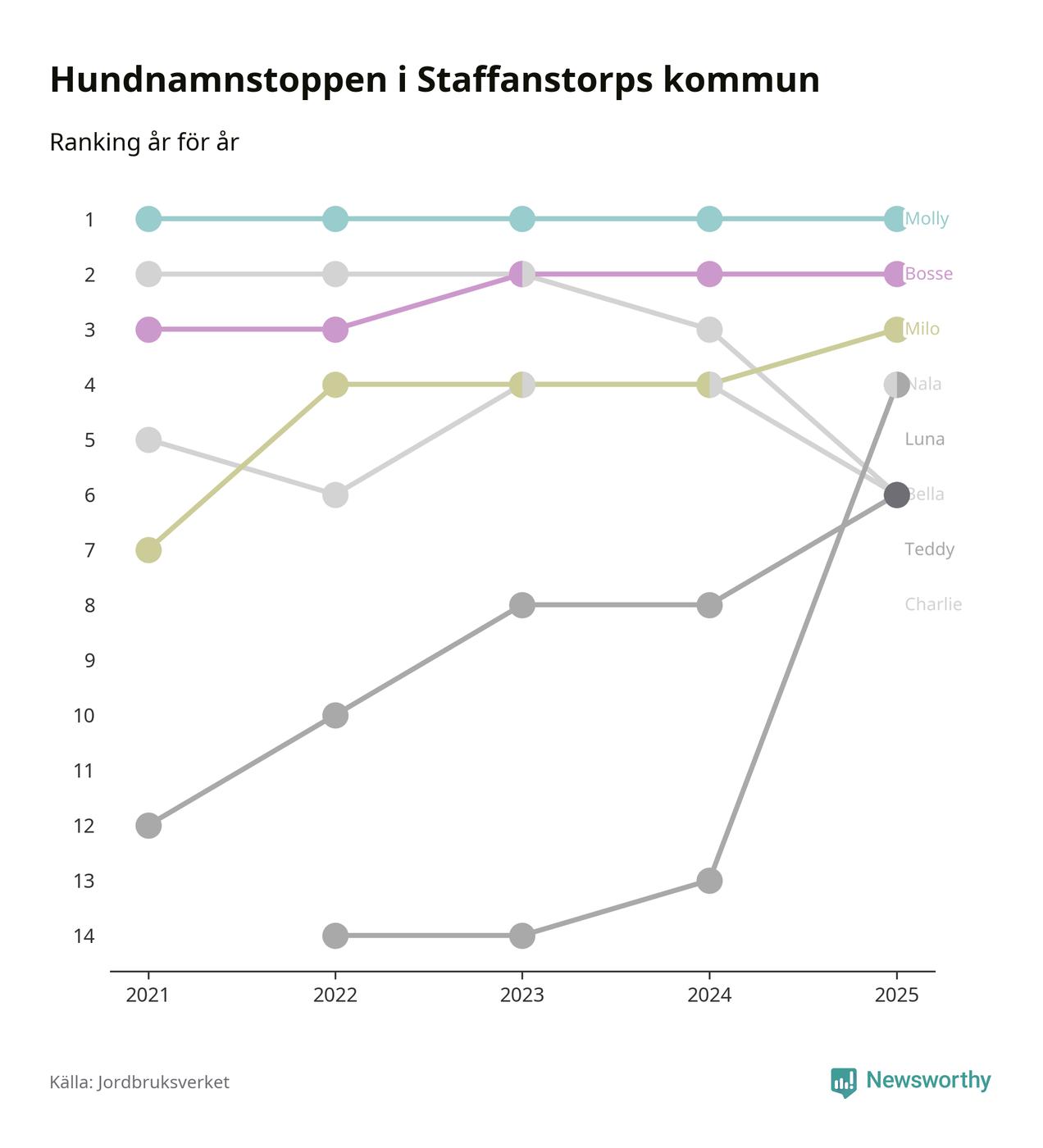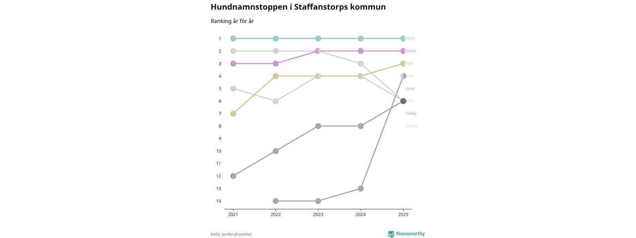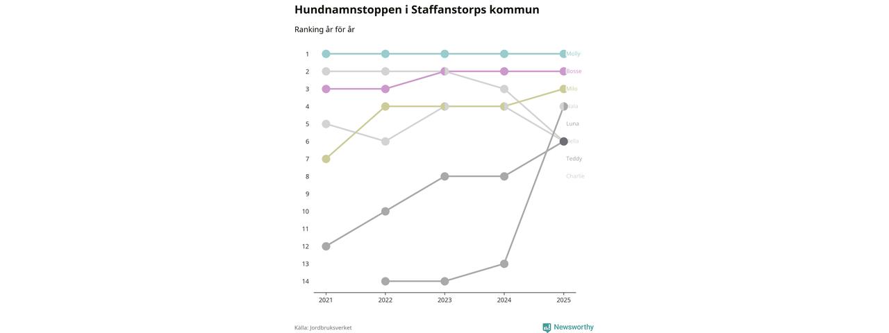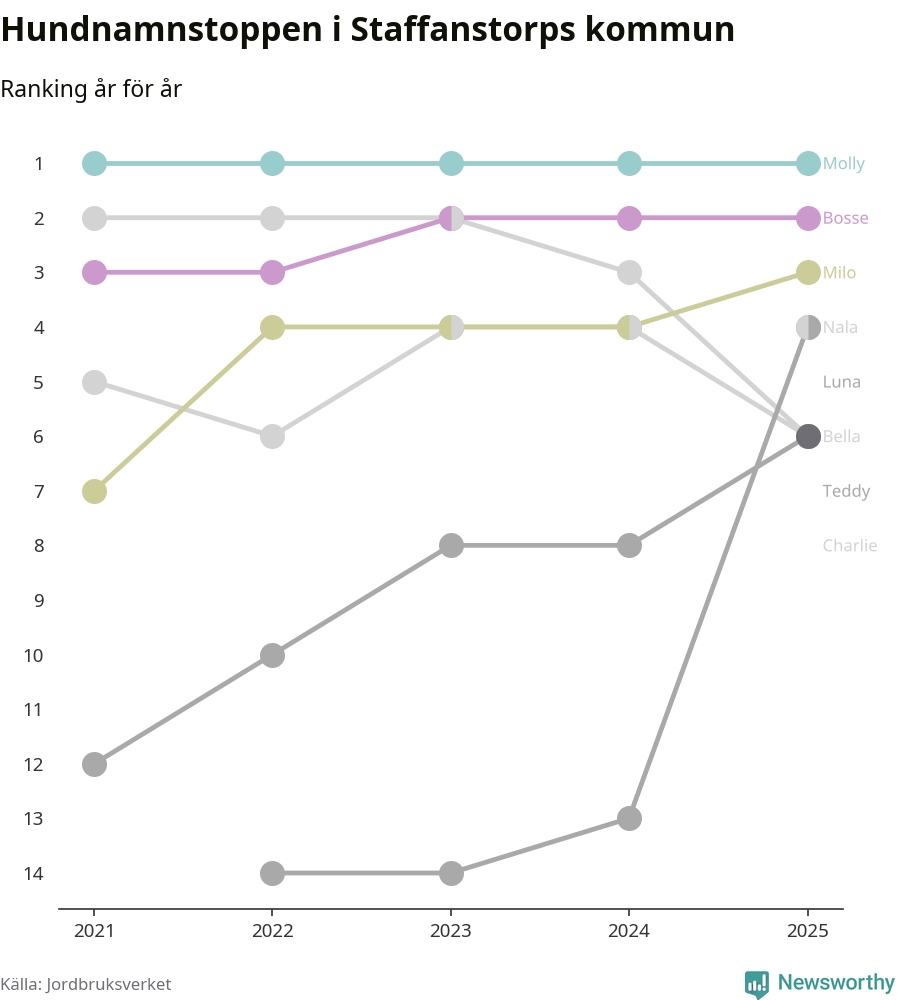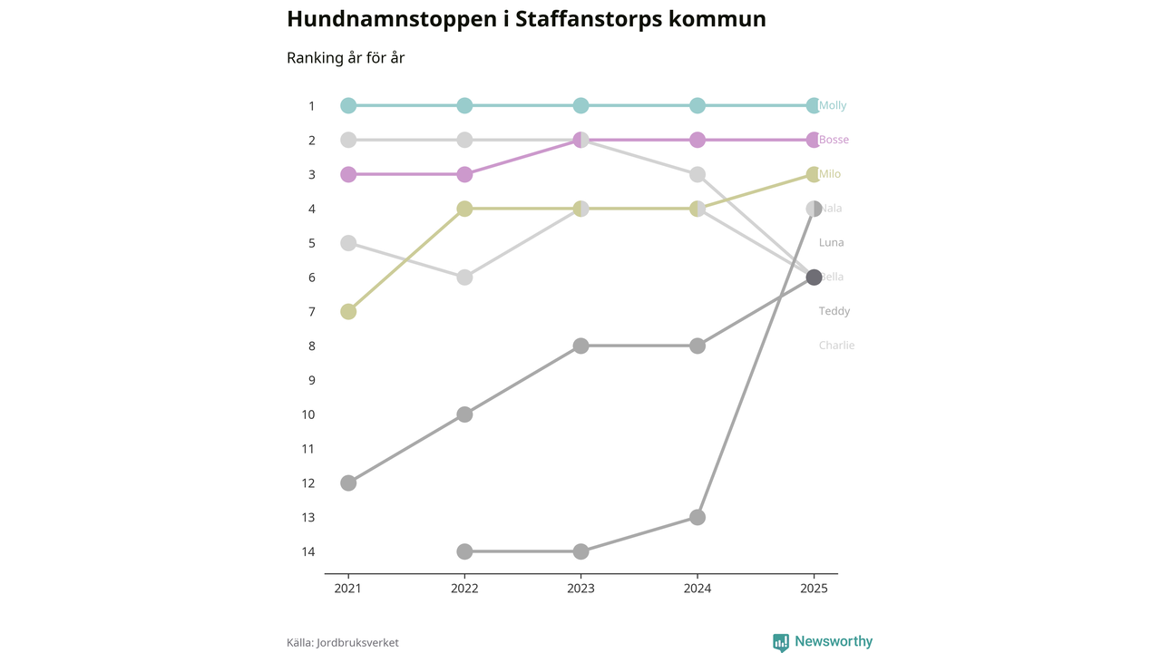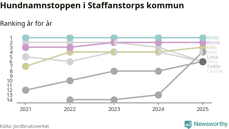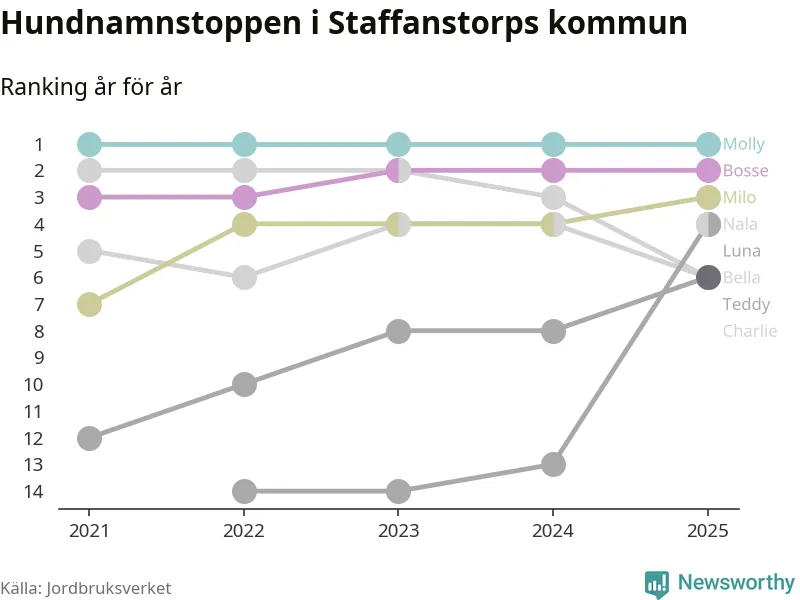 Molly är fortsatt ohotad etta bland hundnamnen i Sverige, följt av Bella och Charlie. Så har det sett ut flera år i rad, och även bland Staffanstorpshundarna ligger Molly i topp.