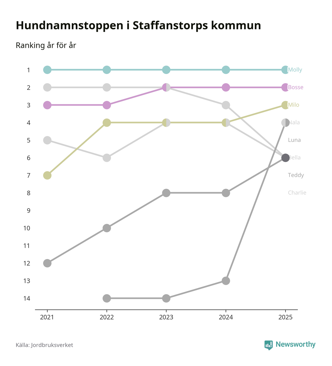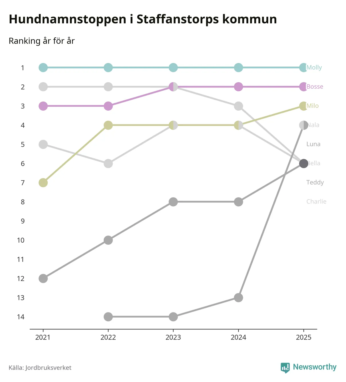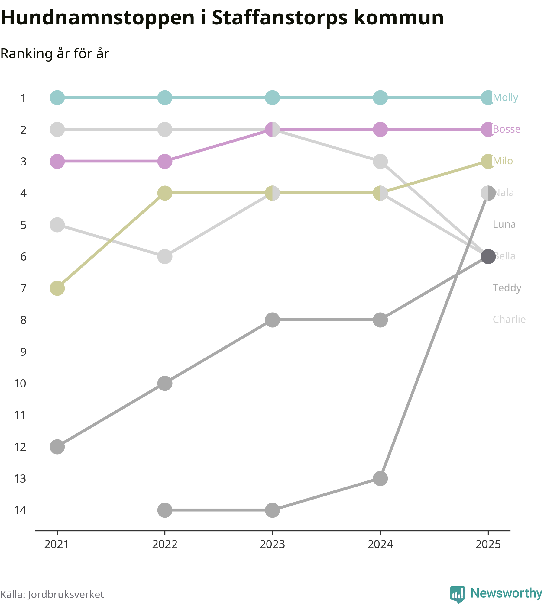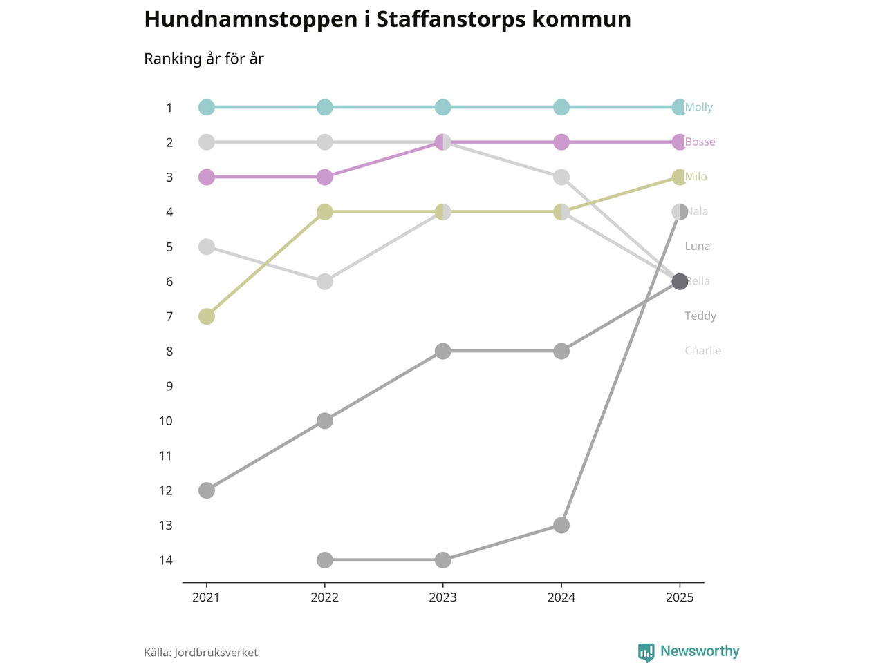 Molly är fortsatt ohotad etta bland hundnamnen i Sverige, följt av Bella och Charlie. Så har det sett ut flera år i rad, och även bland Staffanstorpshundarna ligger Molly i topp.