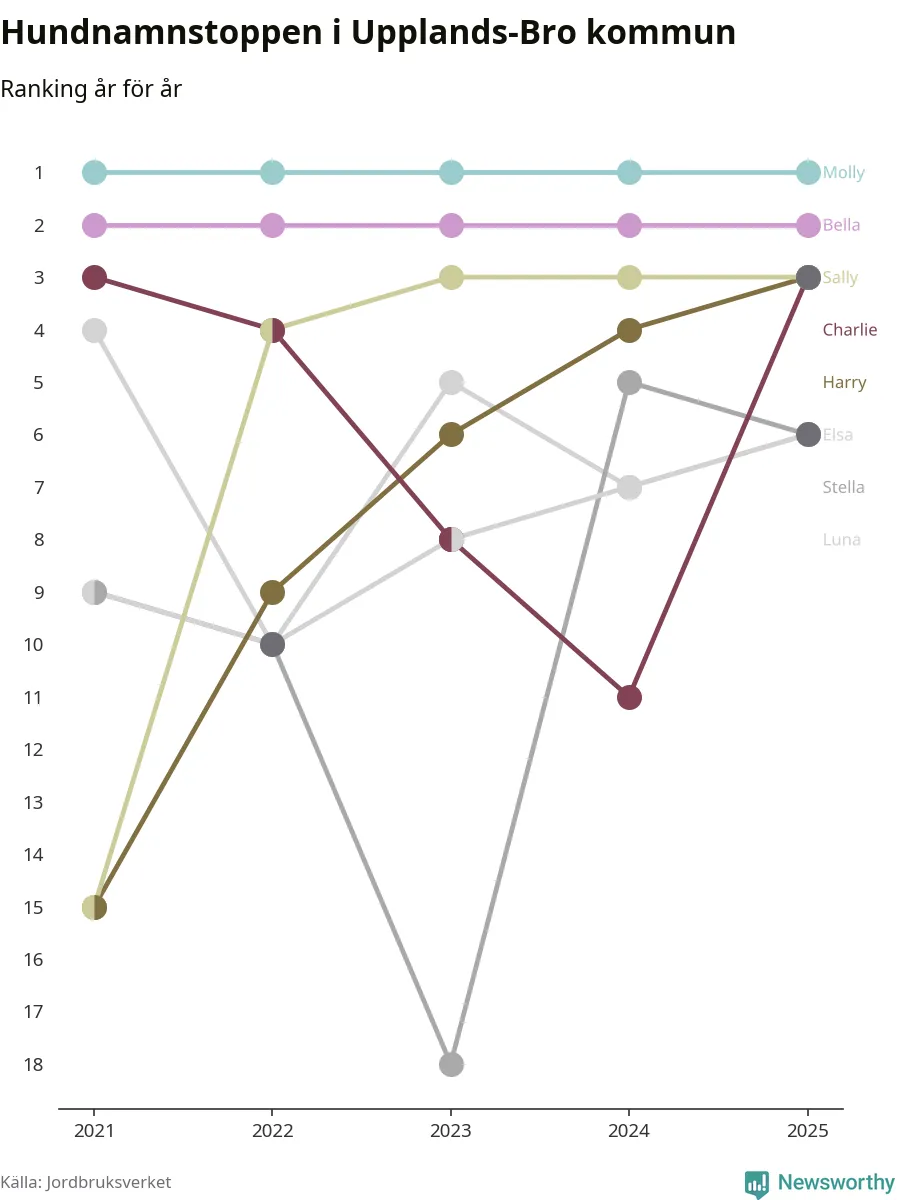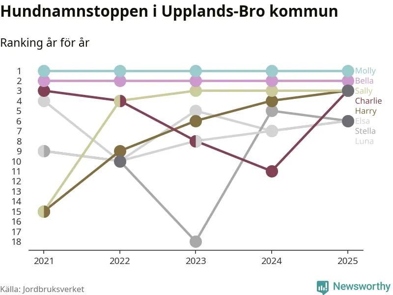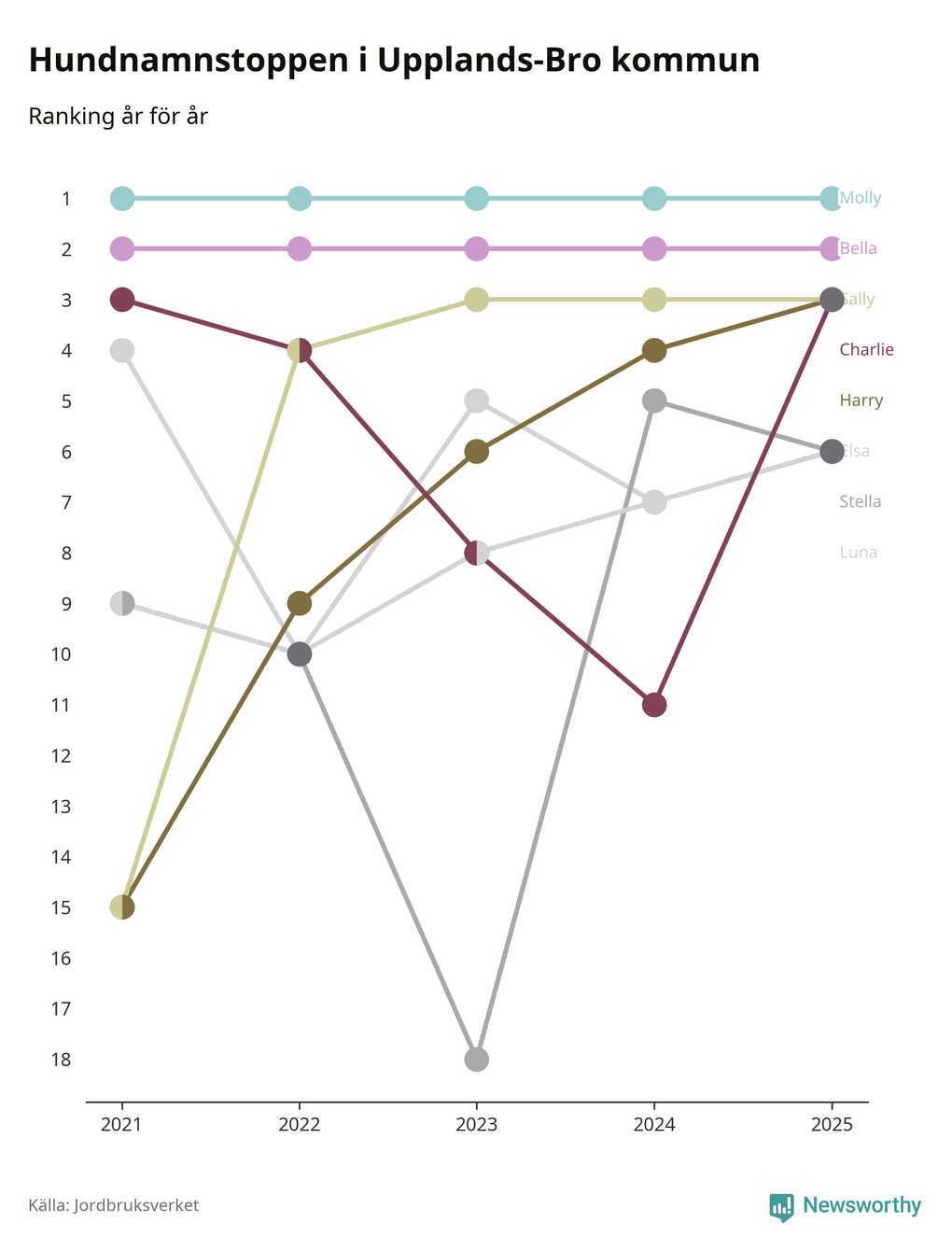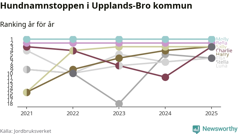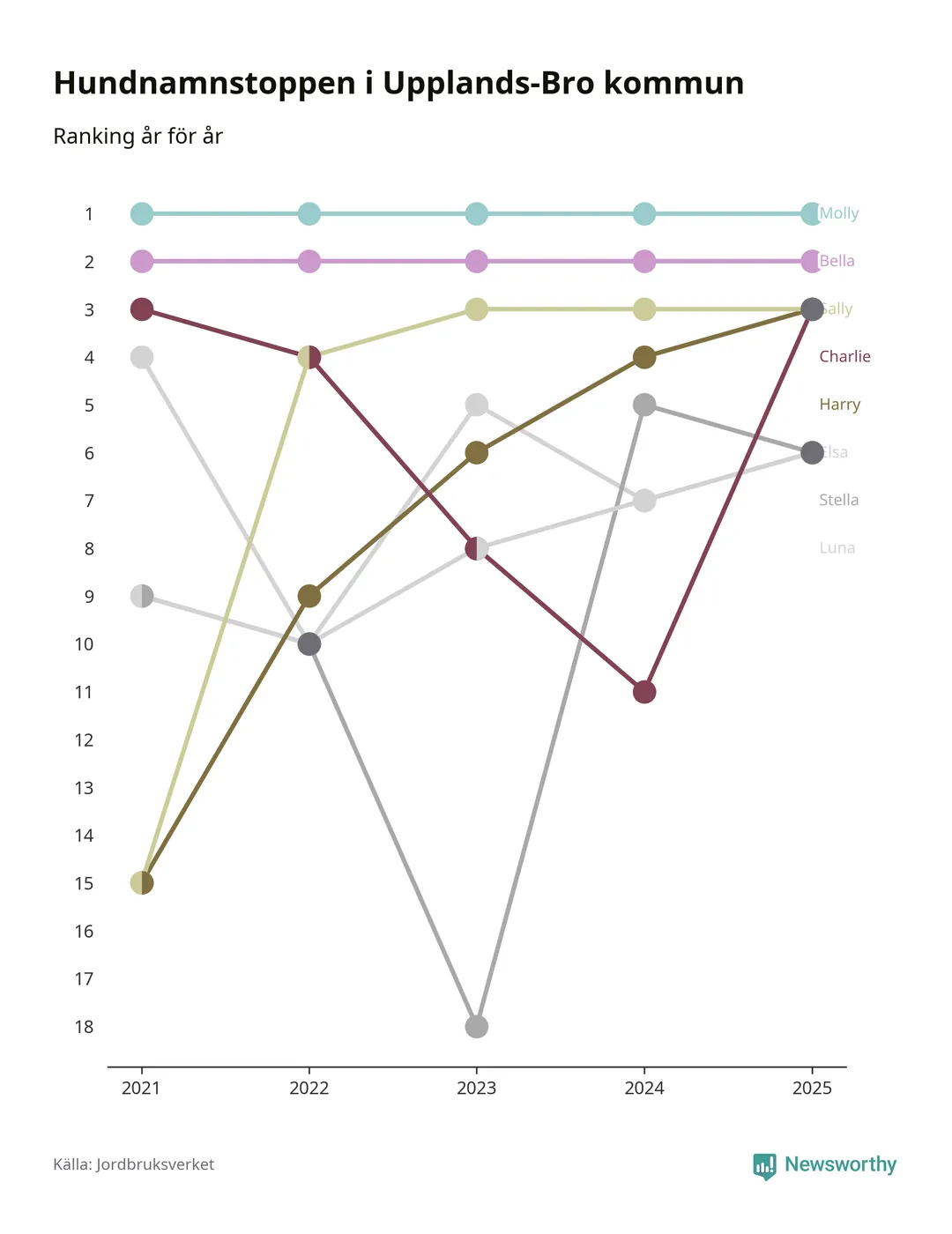 Molly är fortsatt ohotad etta bland hundnamnen i Sverige, följt av Bella och Charlie. Så har det sett ut flera år i rad, och även bland Upplands-Brohundarna ligger Molly i topp.