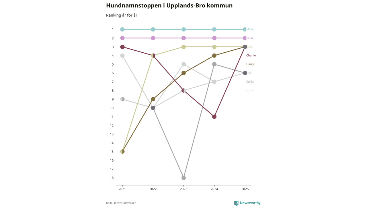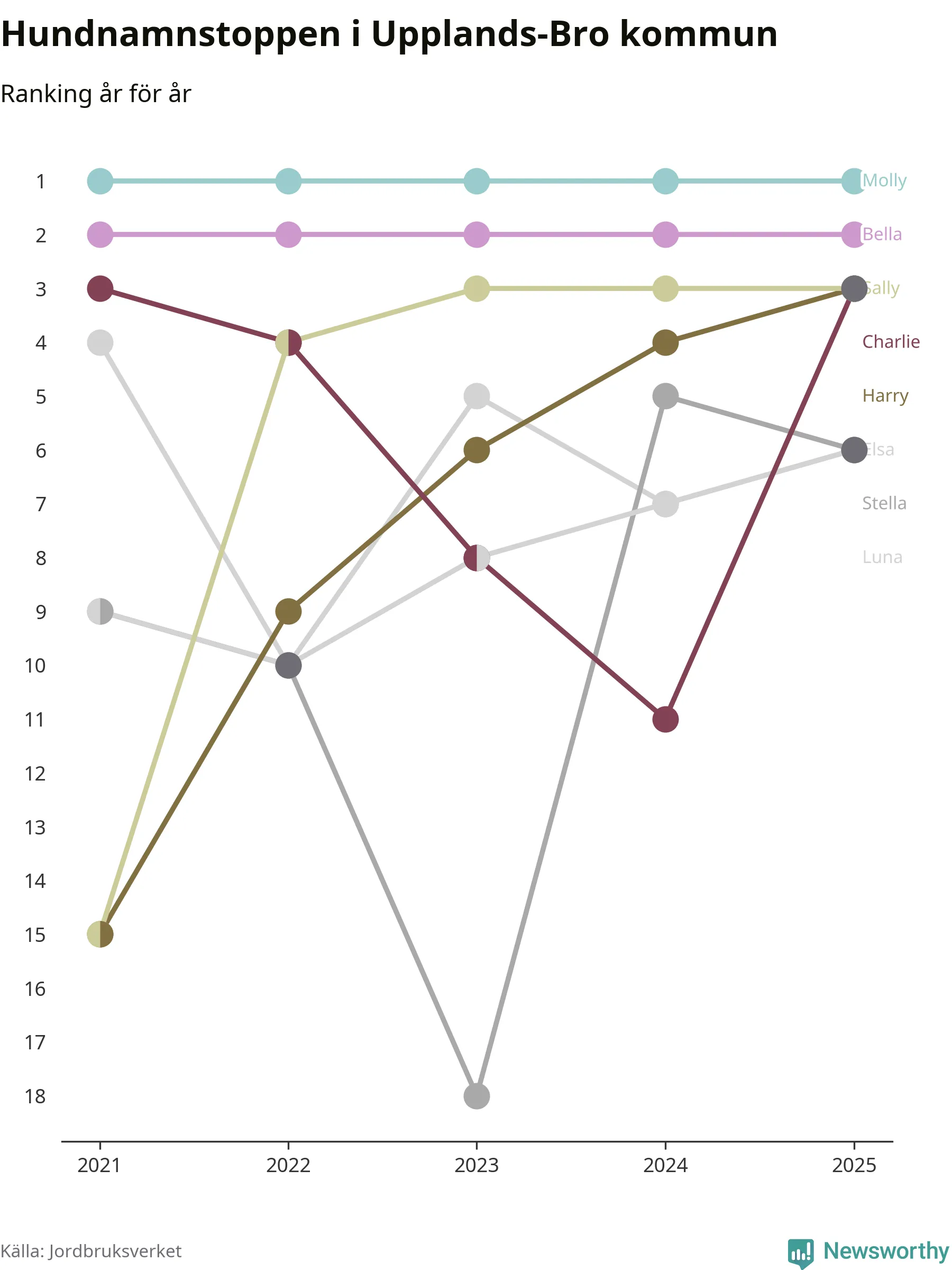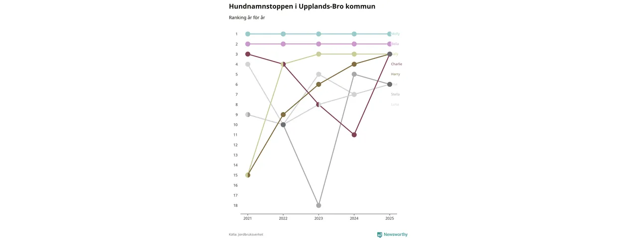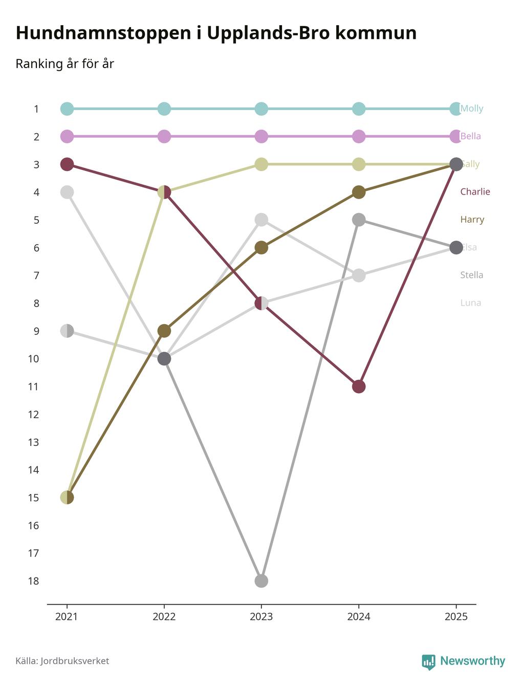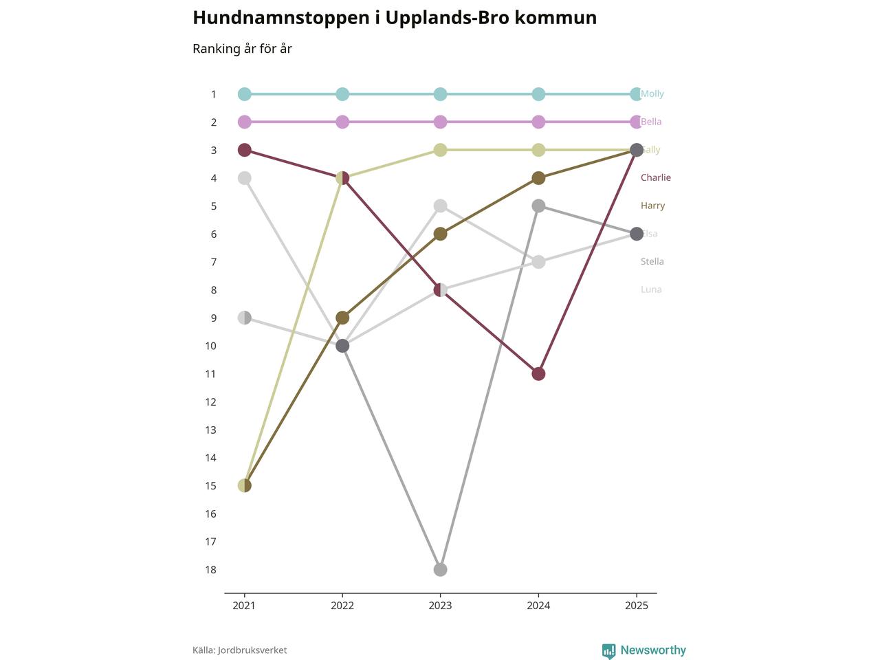 Ett hundnamn är nytt för året på övre delen av topplistan i Upplands-Bro: Charlie hör nu till de vanligaste namnen i kommunen. 13 hundar bär det namnet, vilket ger det en delad tredjeplats på topplistan, att jämföra med plats elva för ett år sedan.