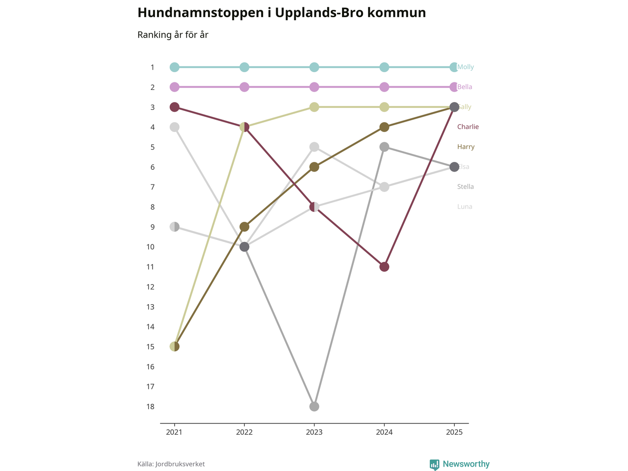 Charlie klättrar på topplistan bland Upplands-Bros hundnamn, visar ny statistik från Jordbruksverkets hundregister.