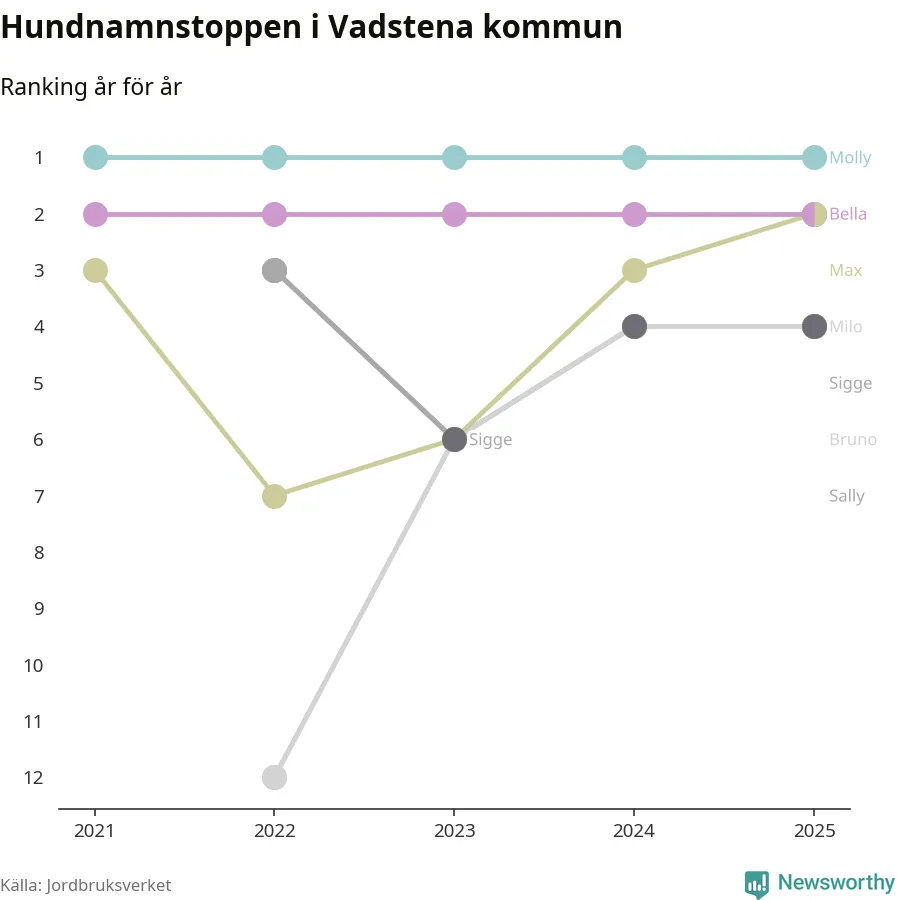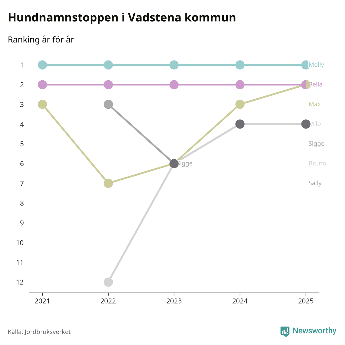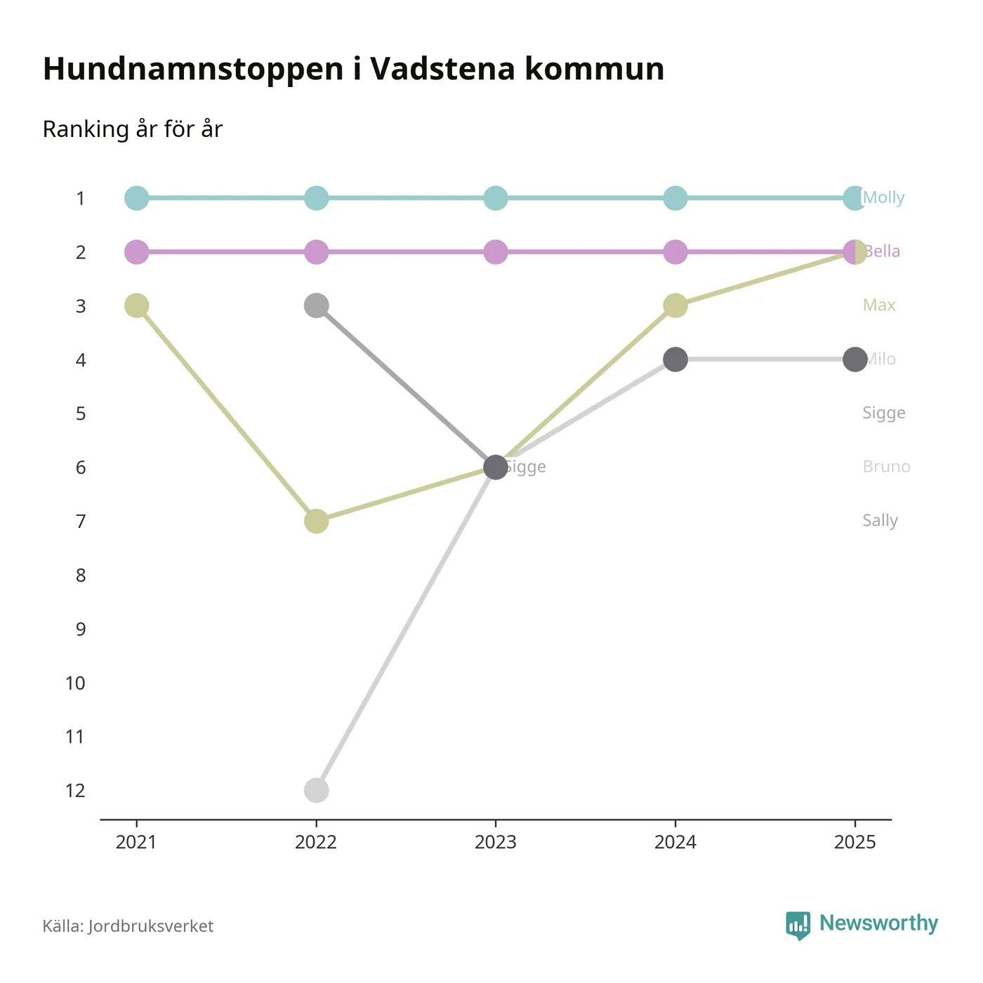 Molly är fortsatt ohotad etta bland hundnamnen i Sverige, följt av Bella och Charlie. Så har det sett ut flera år i rad, och även bland Vadstenahundarna ligger alltså Molly i topp.