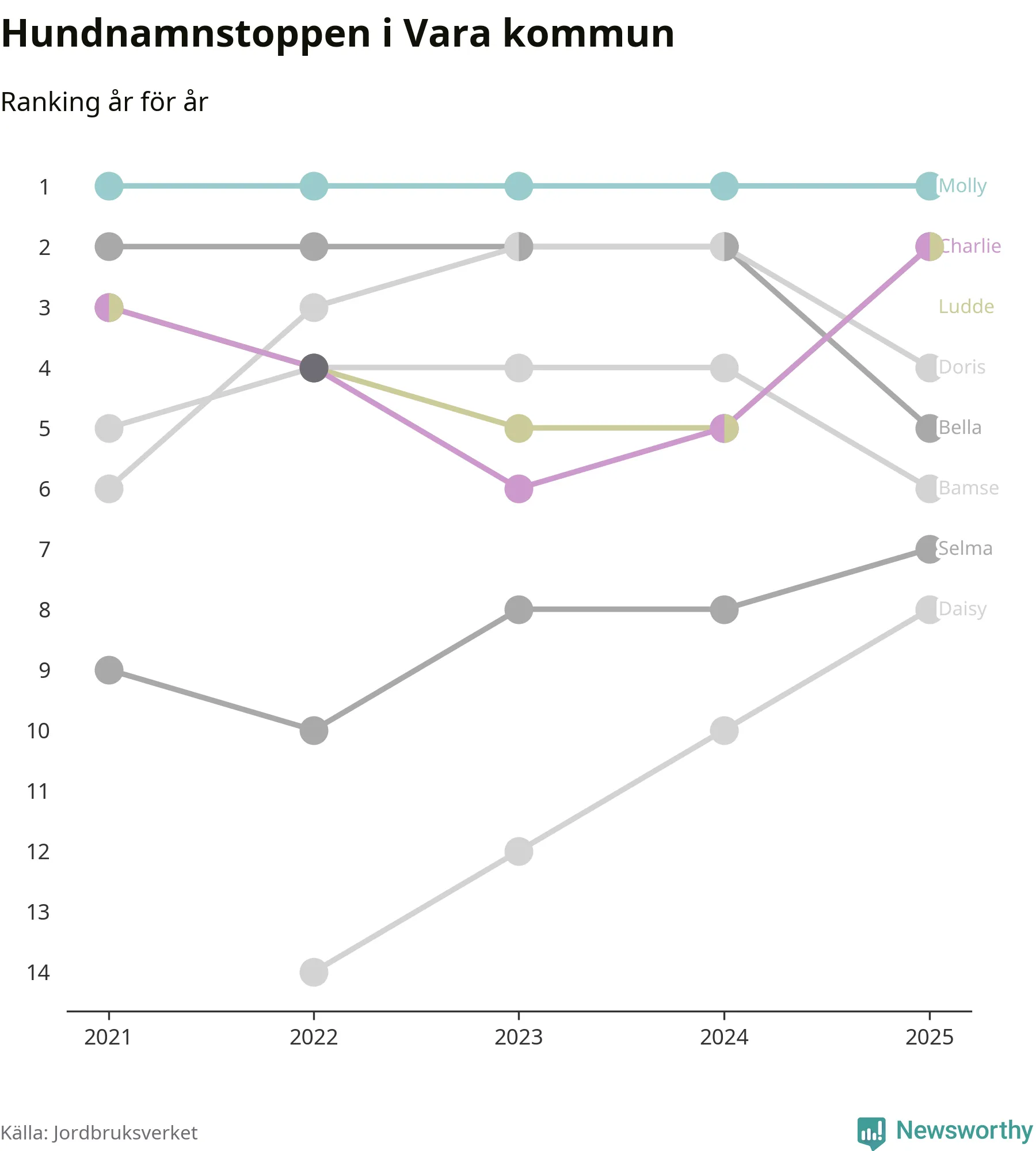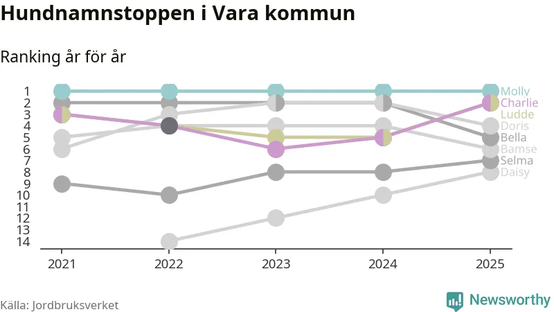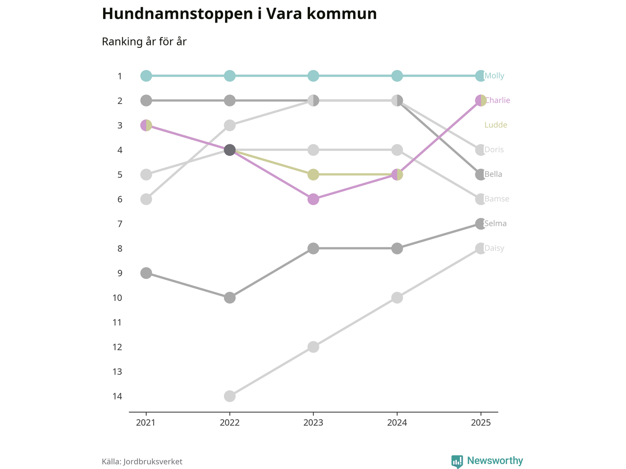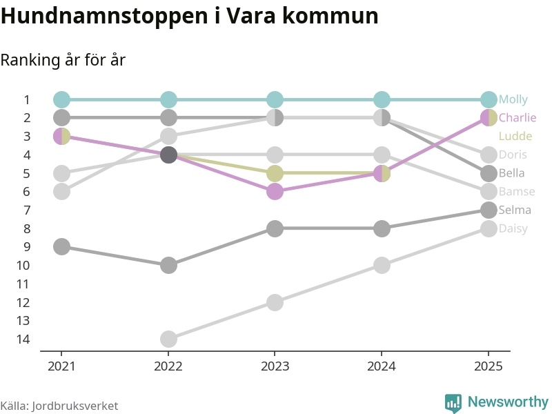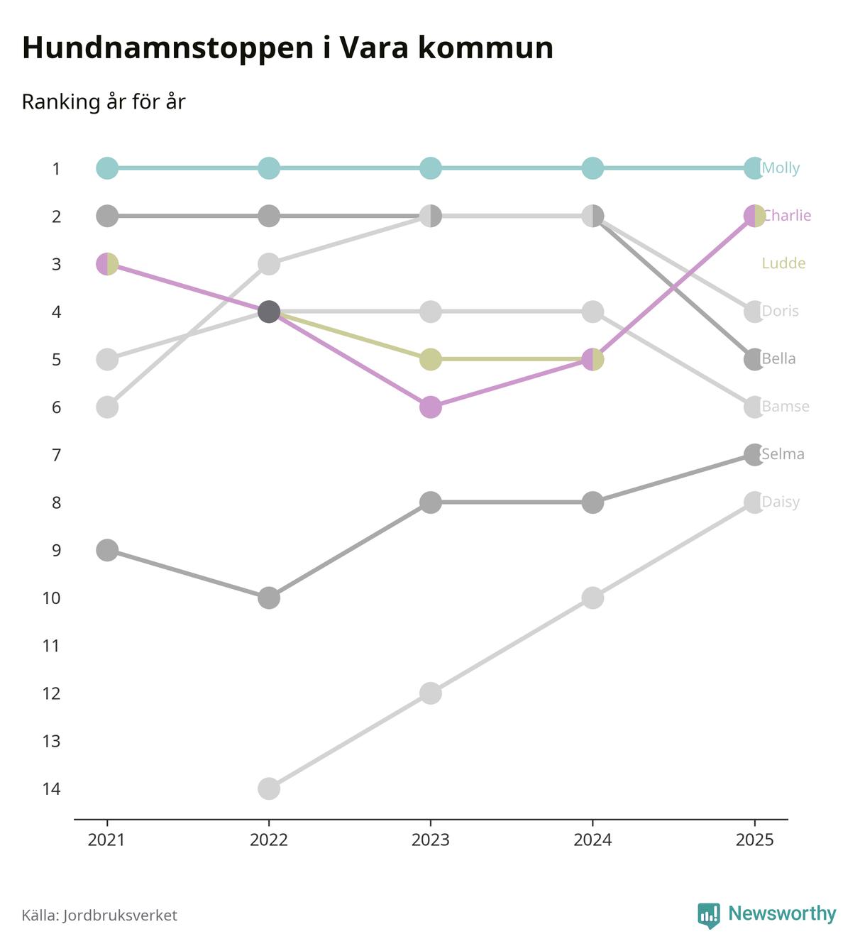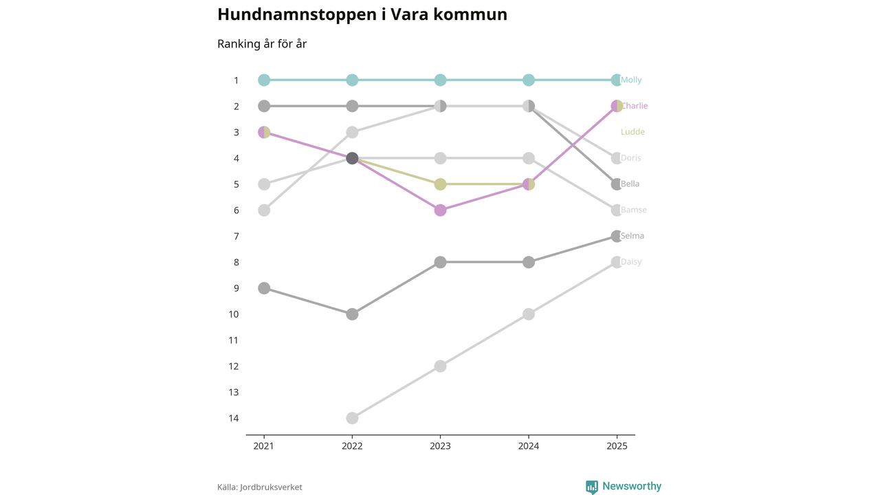 Molly toppar hundnamnsligan i Vara kommun, precis som i landet som helhet. Det visar färsk statistik från Jordbruksverket. Här finns hela topplistan för kommunen.