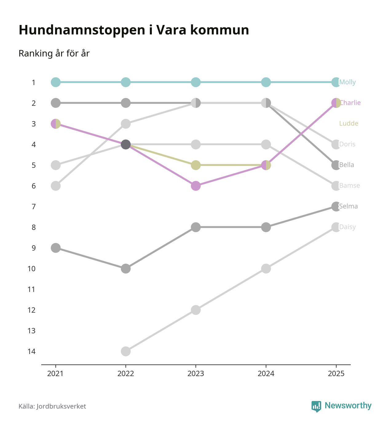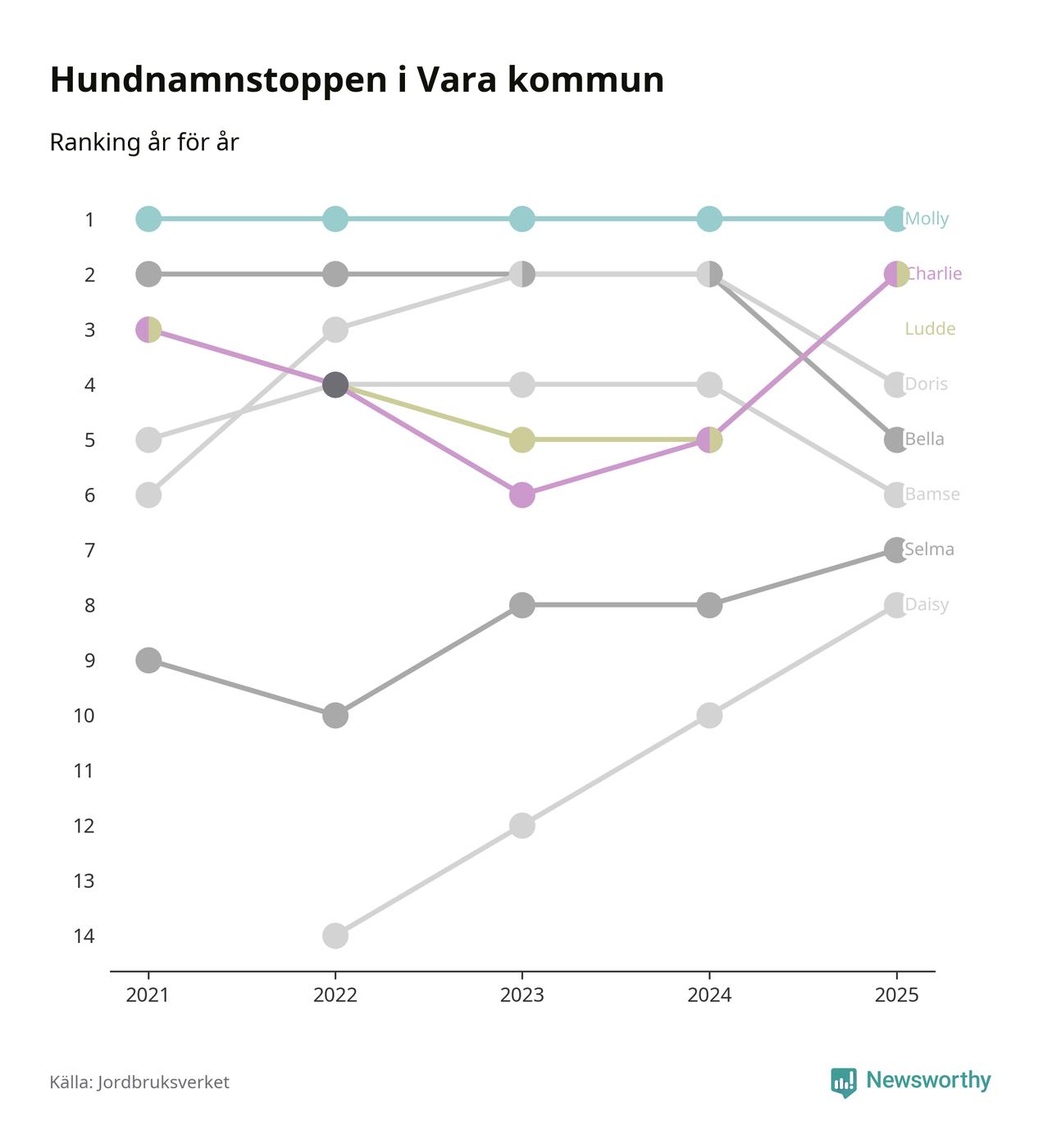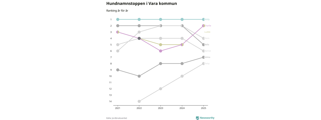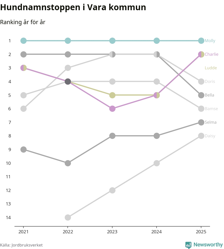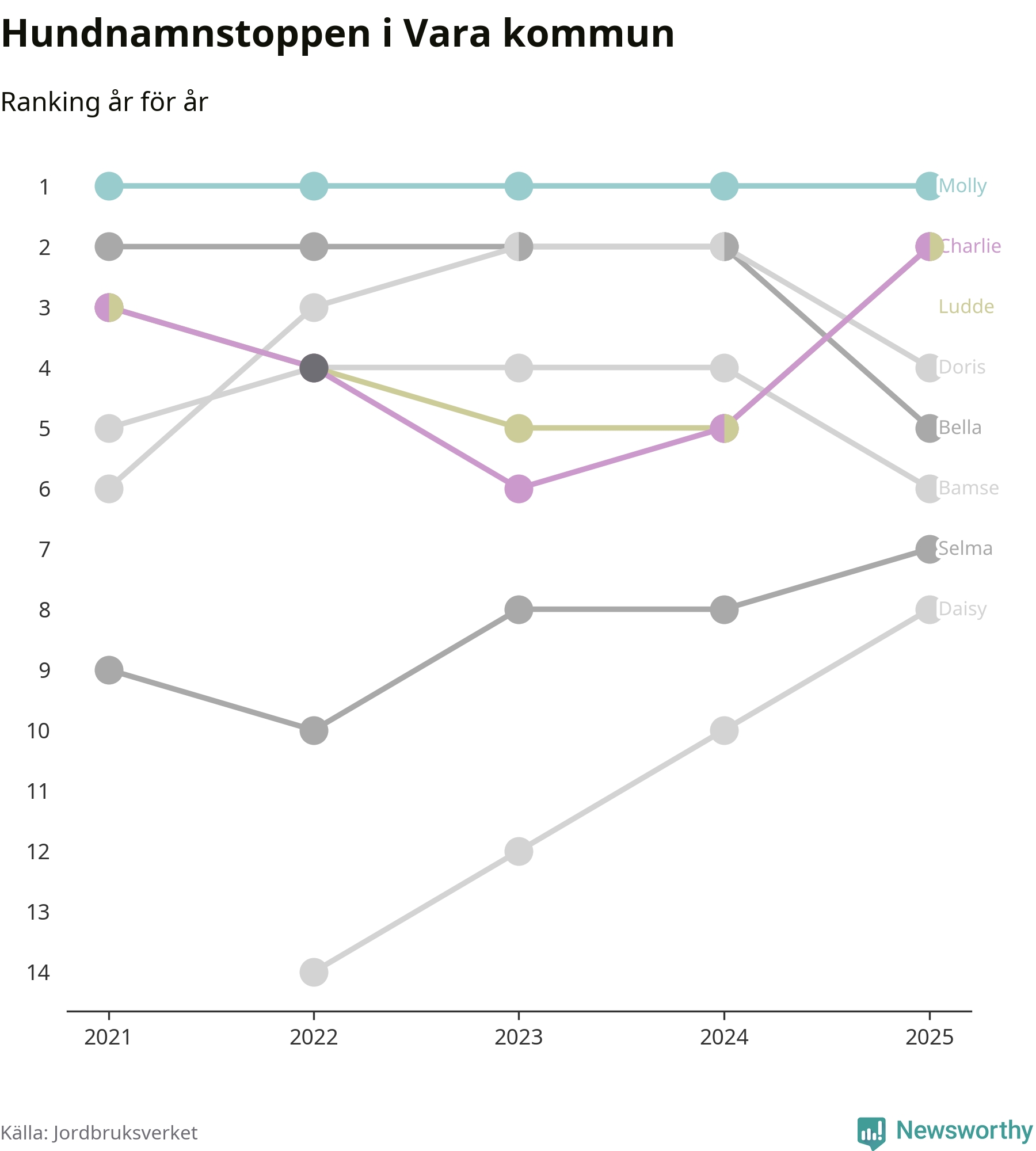 Molly toppar hundnamnsligan i Vara kommun, precis som i landet som helhet. Det visar färsk statistik från Jordbruksverket. Här finns hela topplistan för kommunen.