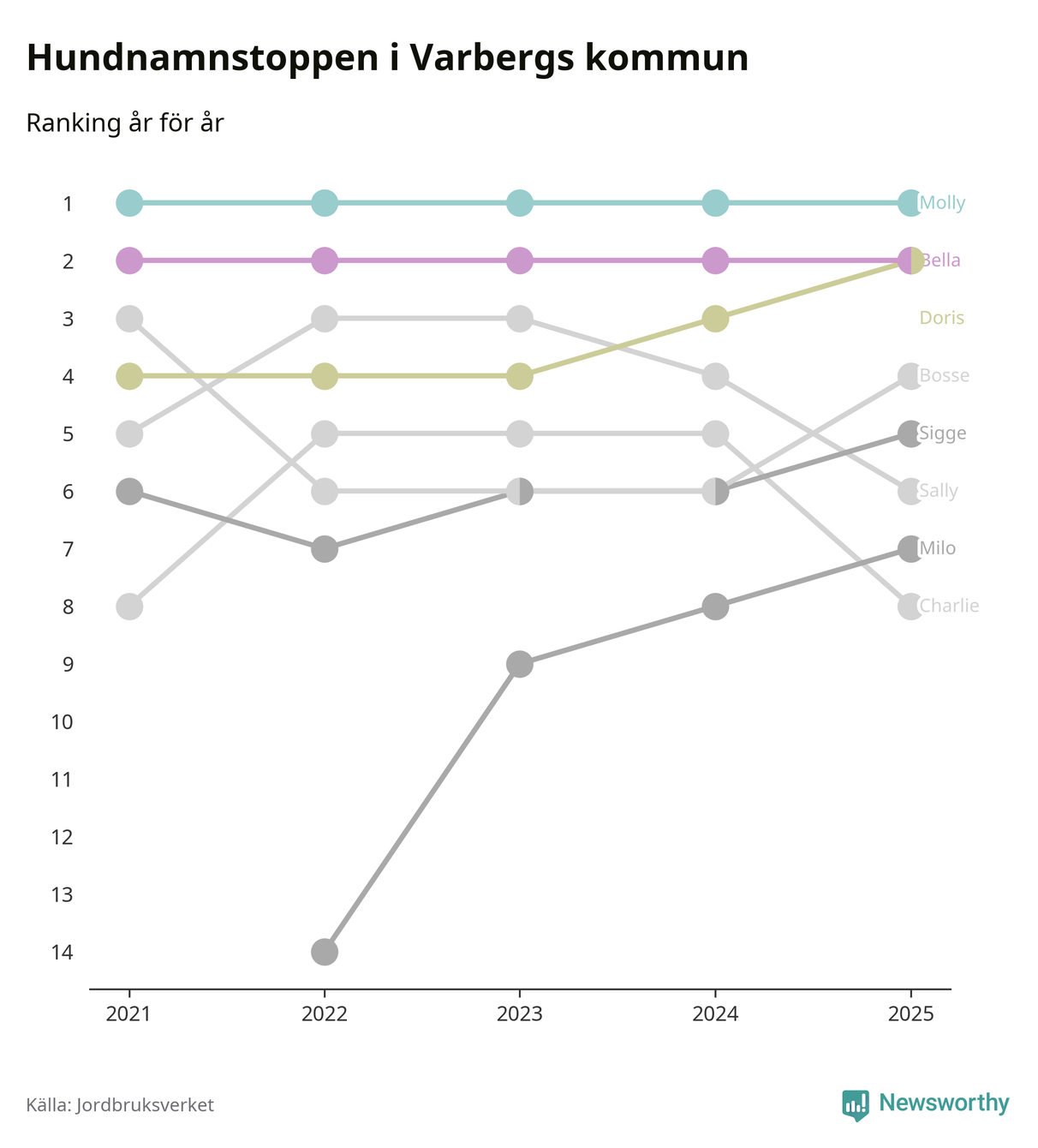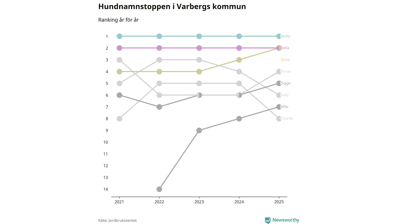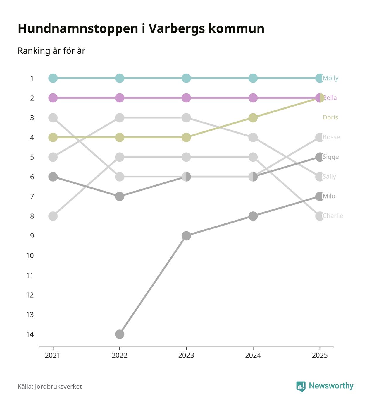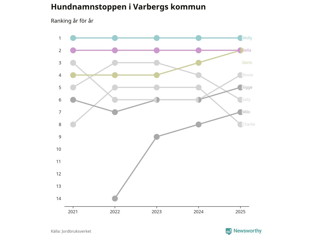 I hela landet är Molly det ohotat populäraste tilltalsnamnet för hundar sedan flera år, följt av Bella och Charlie. Något av de tre namnen toppar listan i 243 av 290 kommuner, och de har varit de vanligaste namnen sedan åtminstone 2018. Men det fjärde populäraste namnet, Doris, knappade in på ledartrion och kommer snart kunna utmana Charlie om tredjeplatsen, om trenden håller i sig.